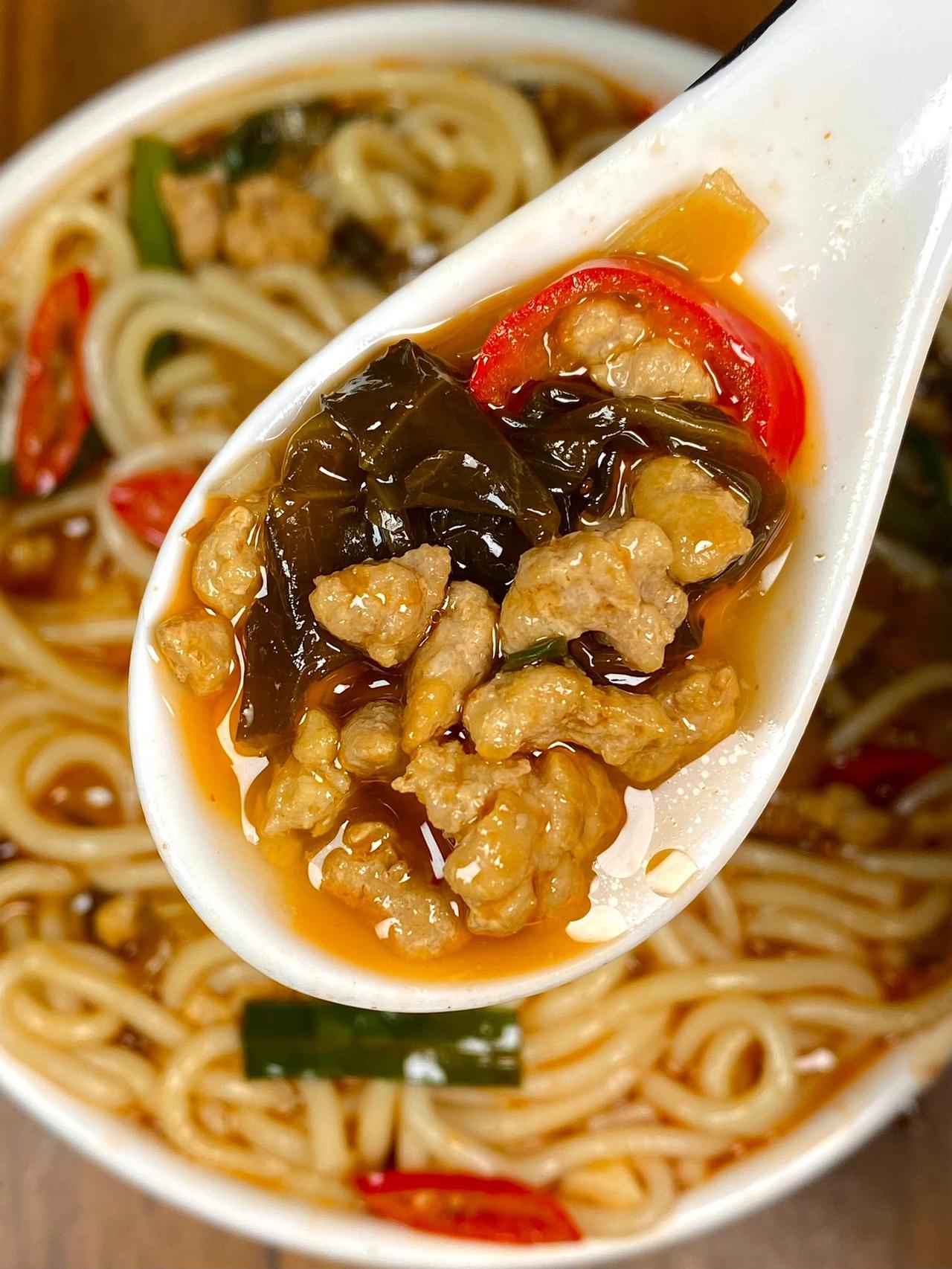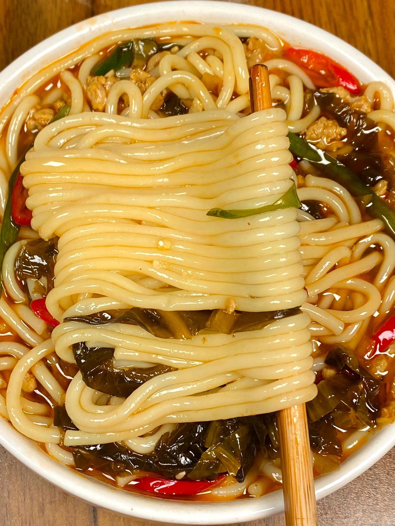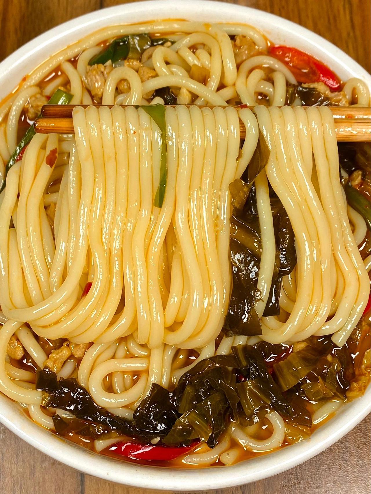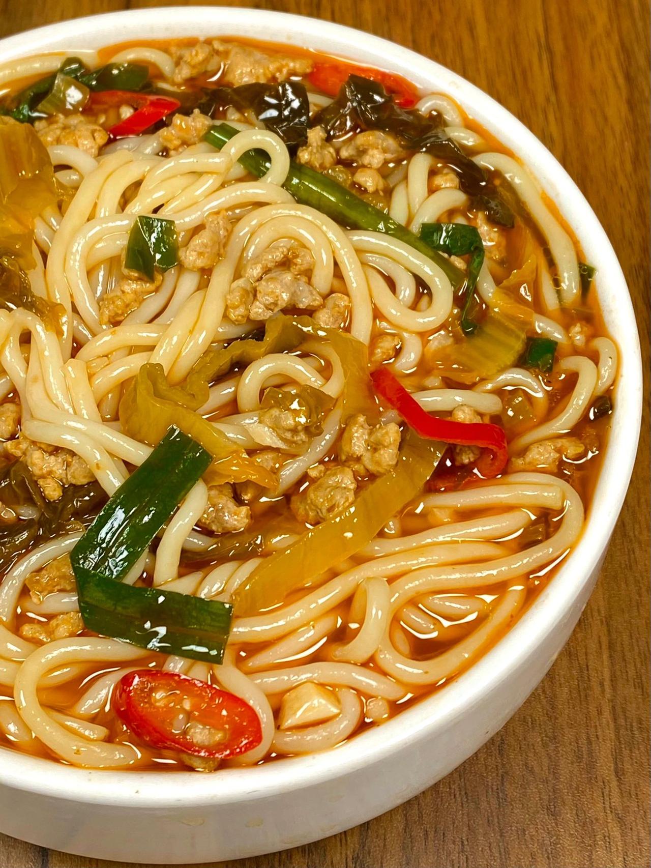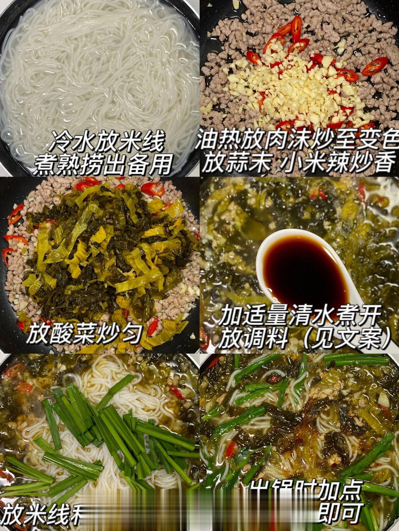 夏天吃饭就喜欢吃点酸酸辣辣的,这不,这会儿刷到这个酸菜米线,就立马安排上了 出锅前我又淋了点辣椒油,真的巨好吃,米线酸辣入味,满满的肉沫,真的绝啦 家人们快去试试吧,我汤都喝完啦 食材:酸菜、干米线、肉沫、韭菜 做法:1、干米线冷水下锅煮熟捞出备用,油热放肉沫炒至变色,放蒜末、小米辣炒香,放酸菜丝炒匀 2、加适量清水煮开,放1勺生抽➕1勺蚝油➕少许白糖,放米线和韭菜段煮开 3、出锅前放勺辣椒油(不放也可以),开吃啦