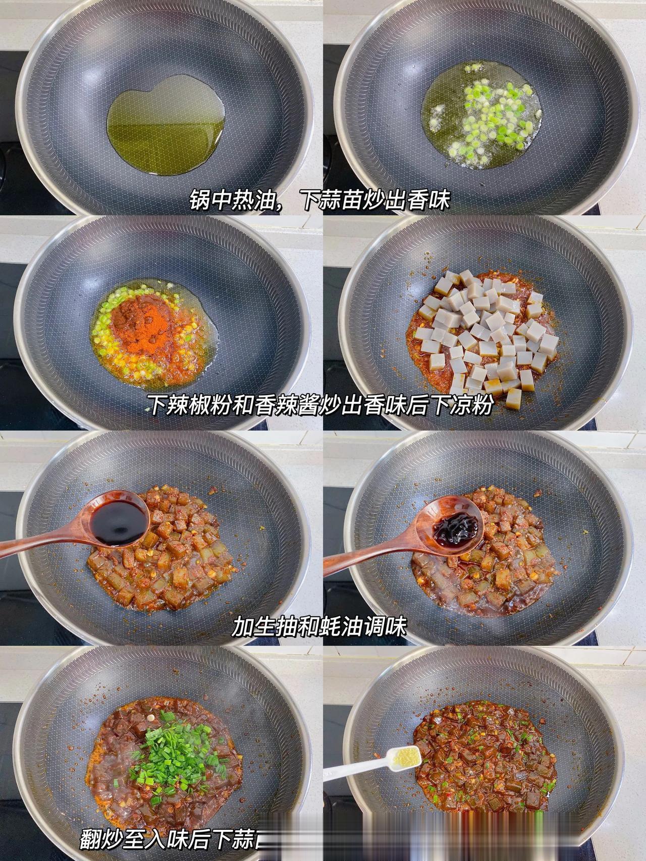 一次成功!复刻夜市炒凉粉!香迷糊了! 刚好想吃炒凉粉就买了一点回来做,这是我第一次做炒凉粉,没想到出奇的好吃! 做法: 1、锅中热油,下蒜苗炒出香味,再下辣椒粉和香辣酱炒出香味后下凉粉; 2、加生抽和蚝油调味翻炒至入味,下蒜苗叶翻炒关火,最后加鸡精调味即可。