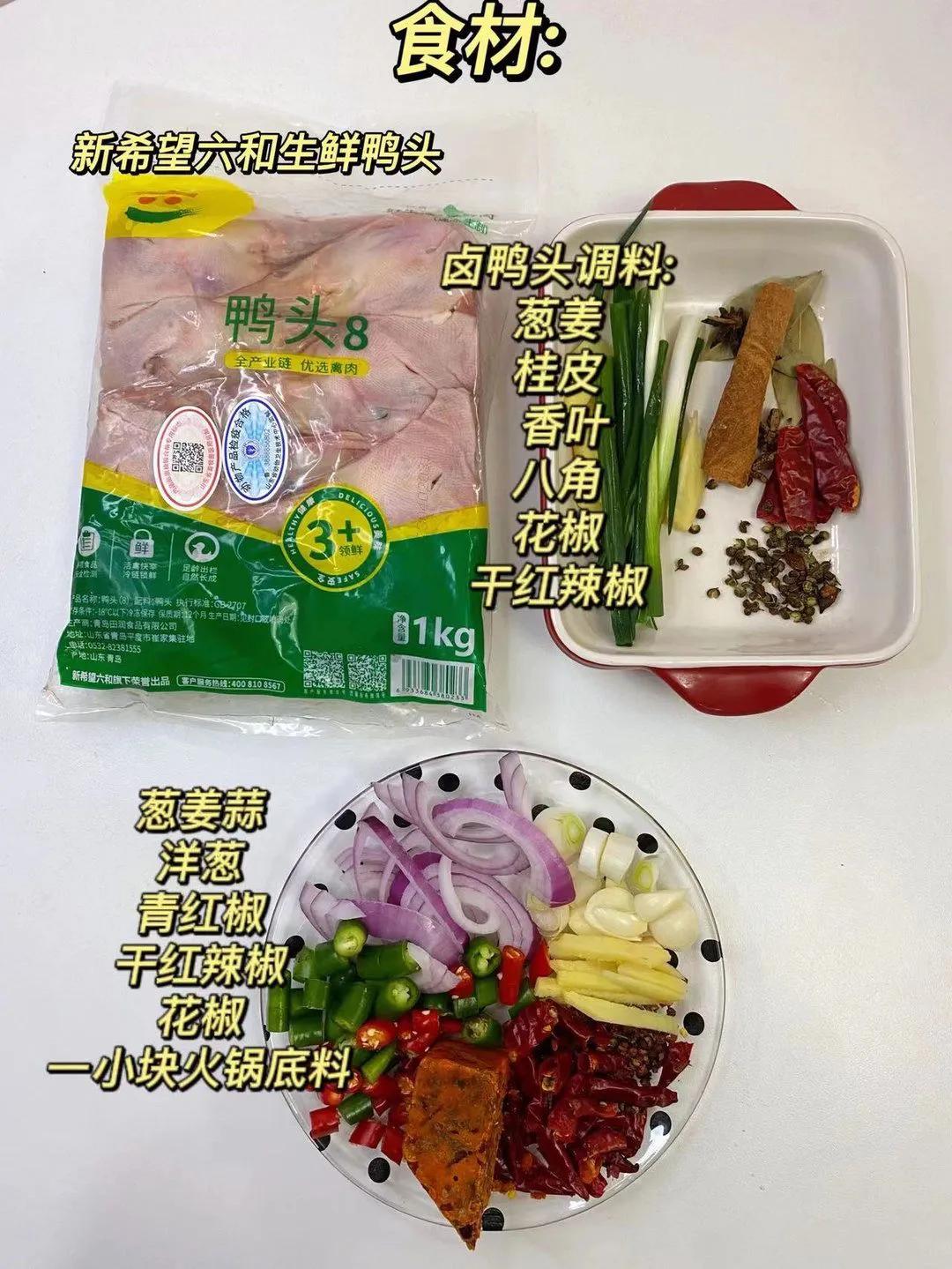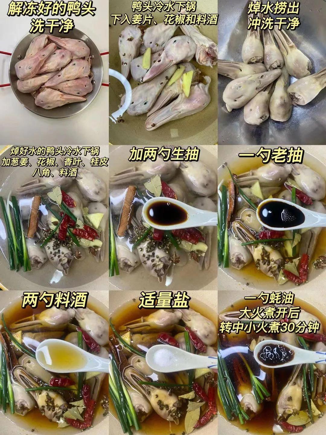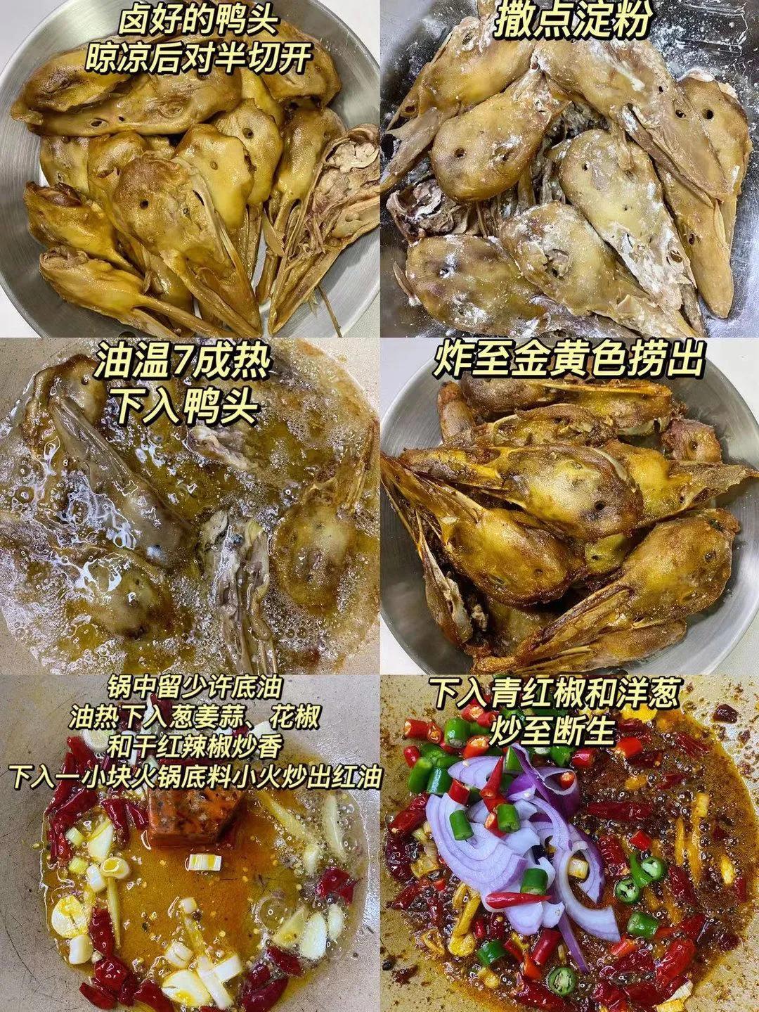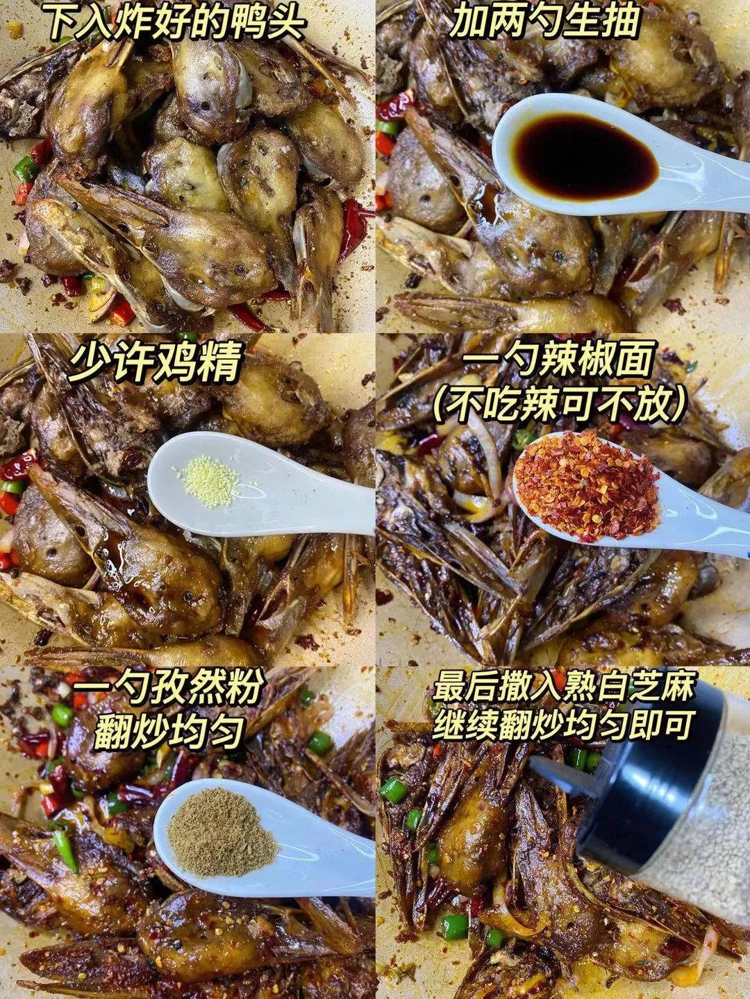 香酥鸭头! 鸭嘴的部分非常酥脆,连骨头都可直接咬碎!鸭头内里却细嫩延绵,味道香辣却不腥别有风味! 食材:六和鸭头,洋葱,葱姜蒜,青红椒,小米辣。调料:火锅底料,桂皮,八角香叶,花椒,盐,生抽,料酒,老抽,蚝油,淀粉,干红辣椒,鸡精 干辣椒面,熟白芝麻。 做法: 1、解冻好的鸭头 洗干净,鸭头冷水下锅 下入姜片、花椒和料酒 焯水捞出冲洗干净; 2、焯好水的鸭头冷水下锅,加葱姜、花椒、香叶、桂皮、八角、料酒、两勺生抽、一勺老臭抽、两勺料酒、适量盐、一勺蚝油; 3、大火煮开后转中小火煮30分钟; 4、卤好的鸭头晾凉后对半切开,撒点淀粉; 5、油温7成热 下入鸭头炸至金黄色捞出; 6、锅中留少许底油,油热下入葱、姜、蒜、花椒、干红辣椒炒香,下入一小块火锅底料小火炒出红油; 7、下入青红椒和洋葱炒至断生; 8、下入炸好的鸭头,加两勺生抽、少许鸡精、一勺辣椒面、一勺孜然粉翻炒均匀,最后撒入熟白芝麻 继续翻炒均匀即可。