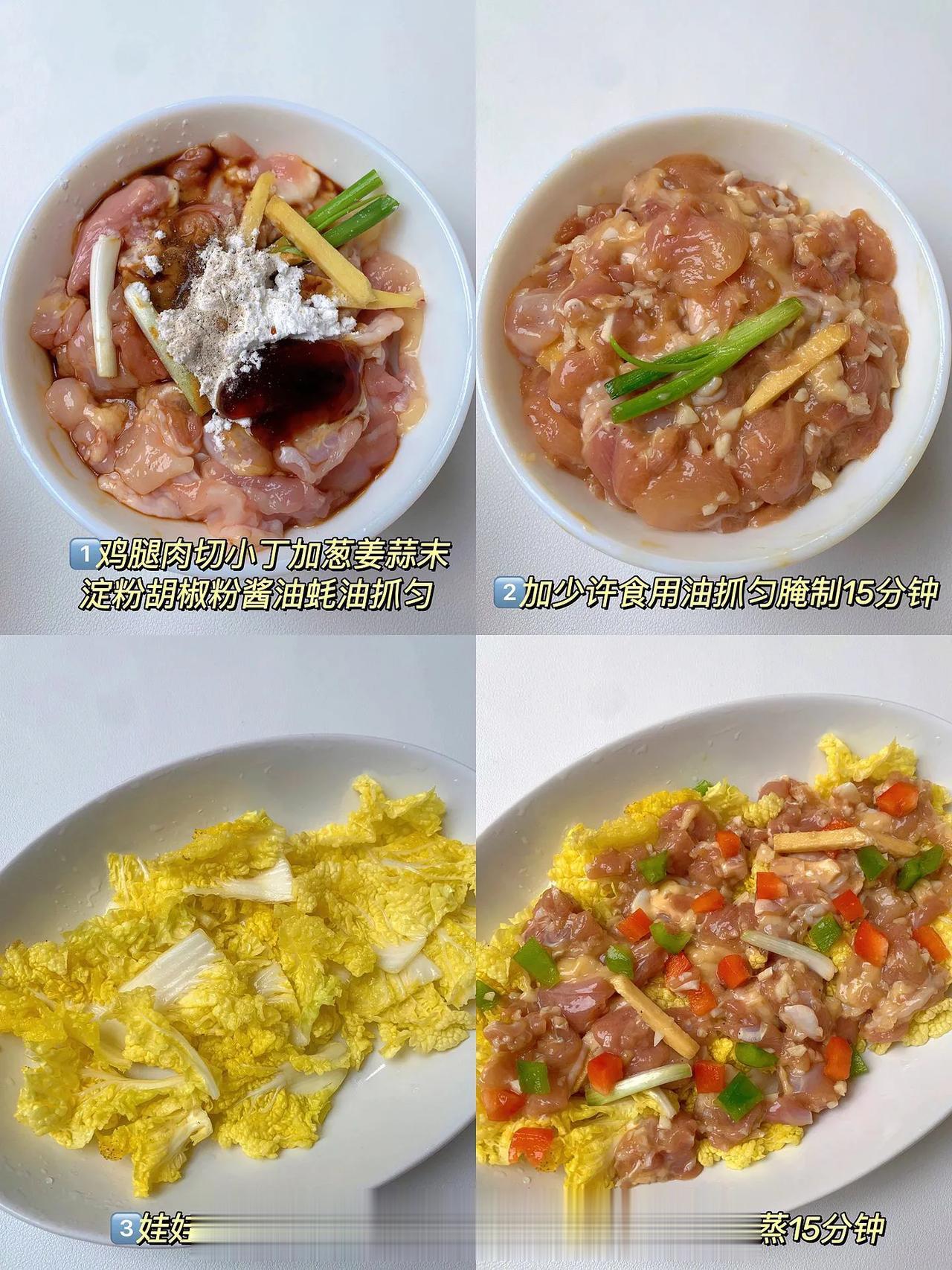 娃娃菜蒸鸡腿肉! 营养美味鲜香滑嫩蒸菜不重样,清淡健康的蒸菜又来啦!有肉有菜,蒸一蒸就搞定了真的超级方便! 做法: 1、鸡腿肉切小丁加葱、姜、蒜末、淀粉、胡椒粉、酱油、蚝油,加少许食用油抓匀腌制15分钟; 2、娃娃菜切小段加少许油、盐搅拌,铺上鸡肉水开蒸15分钟即可。