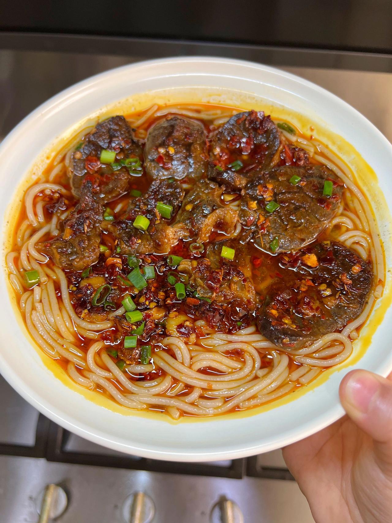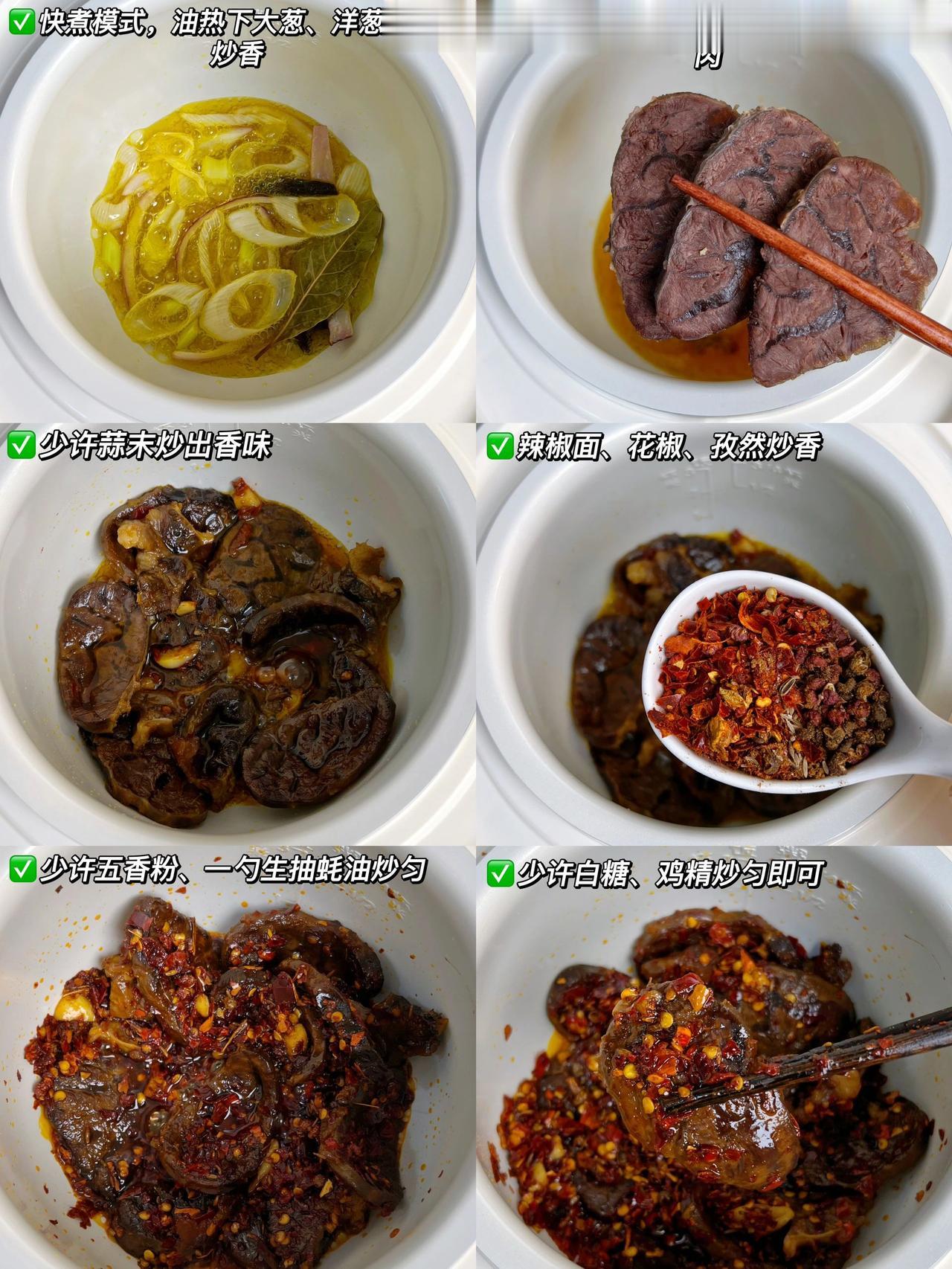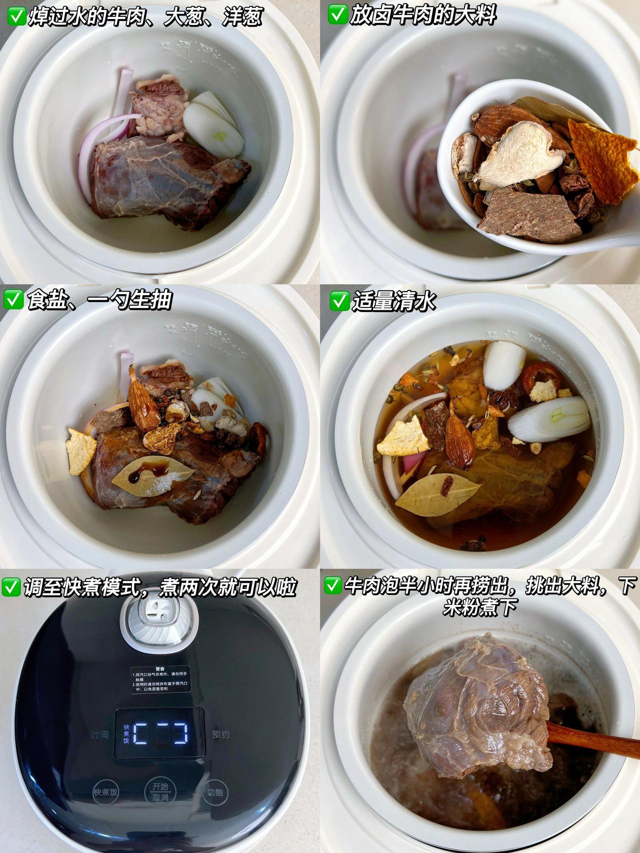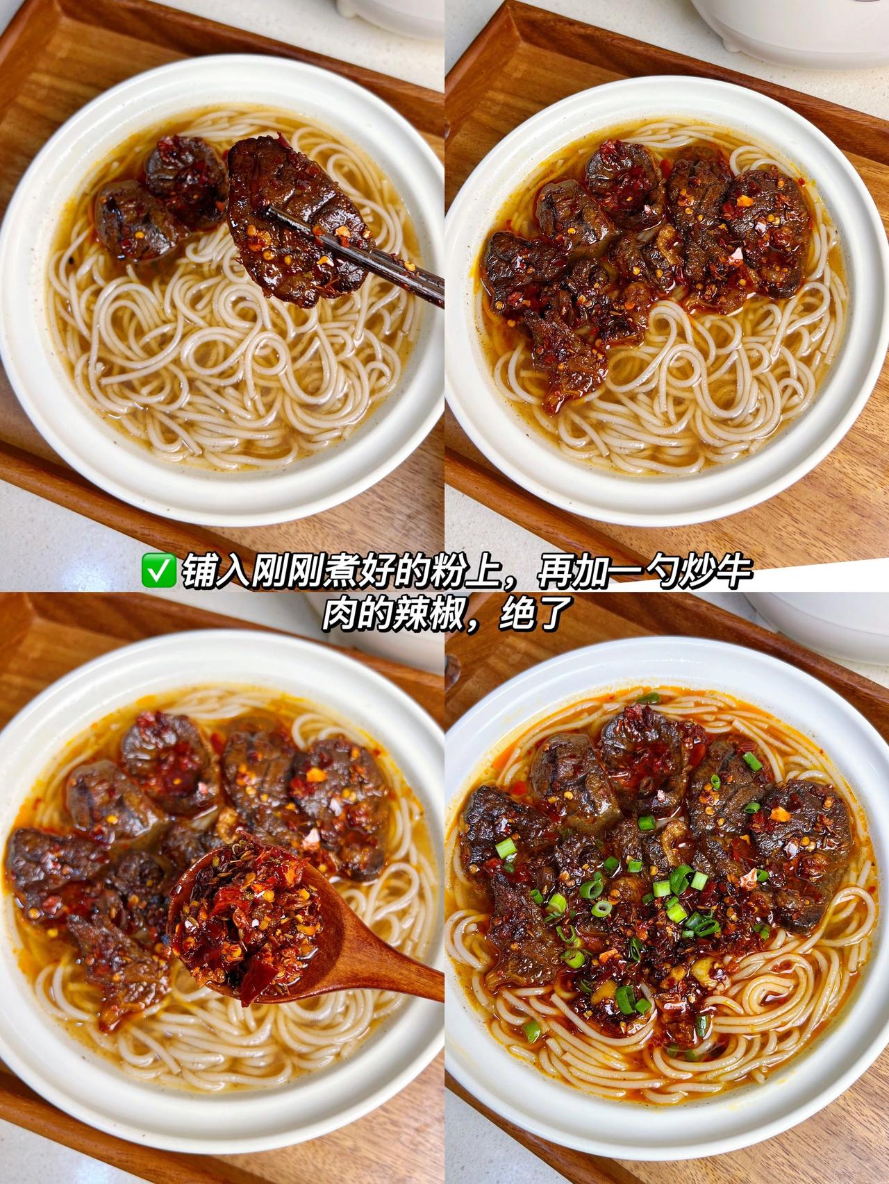 家庭版津市香辣牛肉粉!大块吃肉才过瘾! 以前在湖南吃过津市牛肉粉,心心念念好久,今天终于对它下手了,味道复刻的七七八八啦,大口吃肉!大口嗦粉!真的太过瘾啦! 食材:牛肉、洋葱、大葱、卤牛肉料包、蒜、干辣椒; 做法:1、牛肉冷水下锅,放葱姜焯水2分钟,捞出牛肉放进电饭煲内,放大葱、洋葱、卤牛肉料包、盐、一勺生抽、适量清水,调至快煮模式,煮两次就可以啦; 2、牛肉泡半个小时再捞出放凉切片备用,卤牛肉的汤挑去汤渣,下泡好的米粉煮2分钟,再盛出备用; 3、电饭煲调至快煮模式,油热放大葱、洋葱、八角桂皮香叶炒出香味,再挑出料渣,少许豆瓣酱炒香,下牛肉、蒜末炒1分钟,放辣椒面、花椒、孜然炒香,放五香粉、一勺生抽蚝油、鸡精、白糖炒匀,再倒入刚刚煮好的粉上即可;