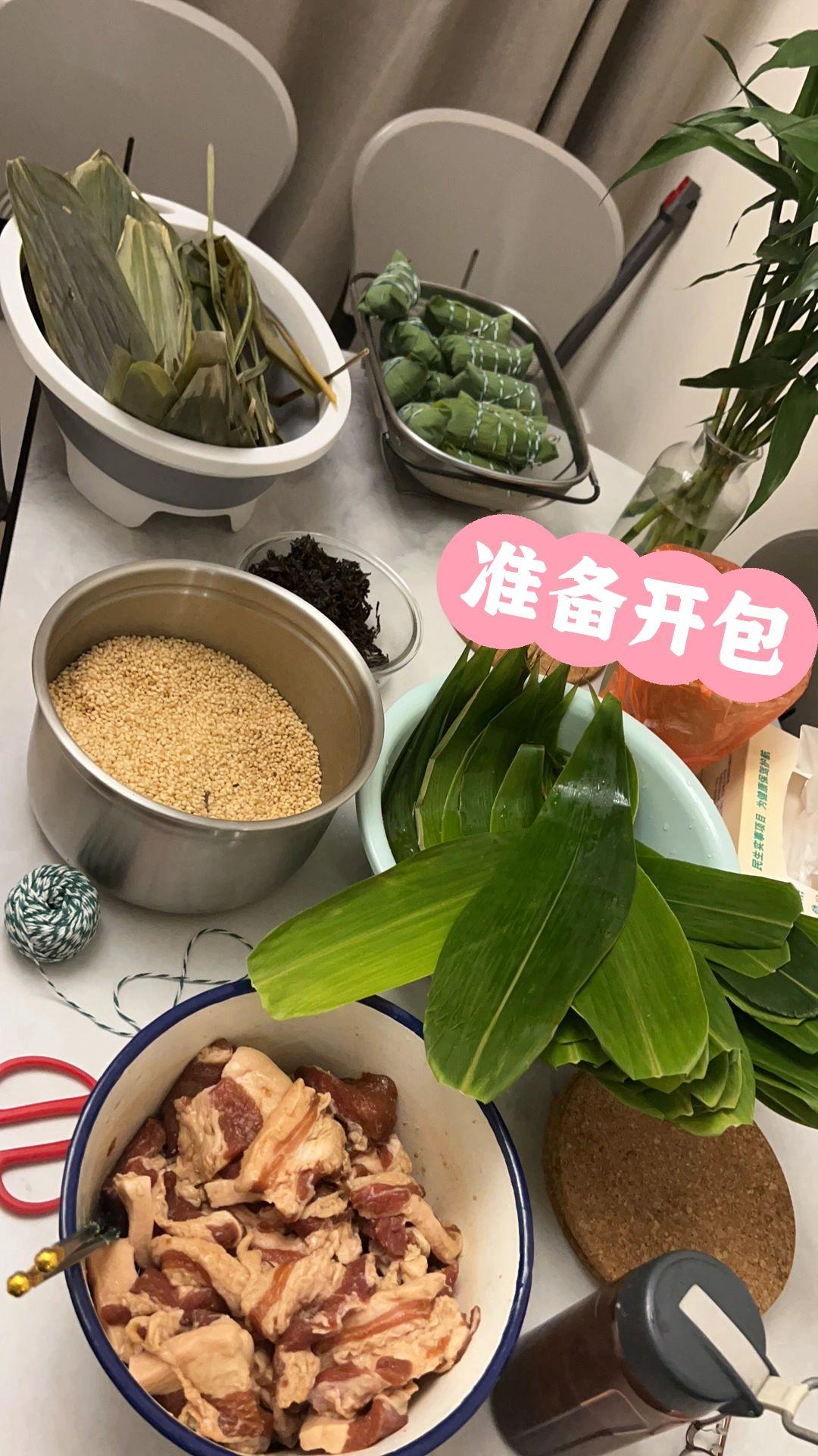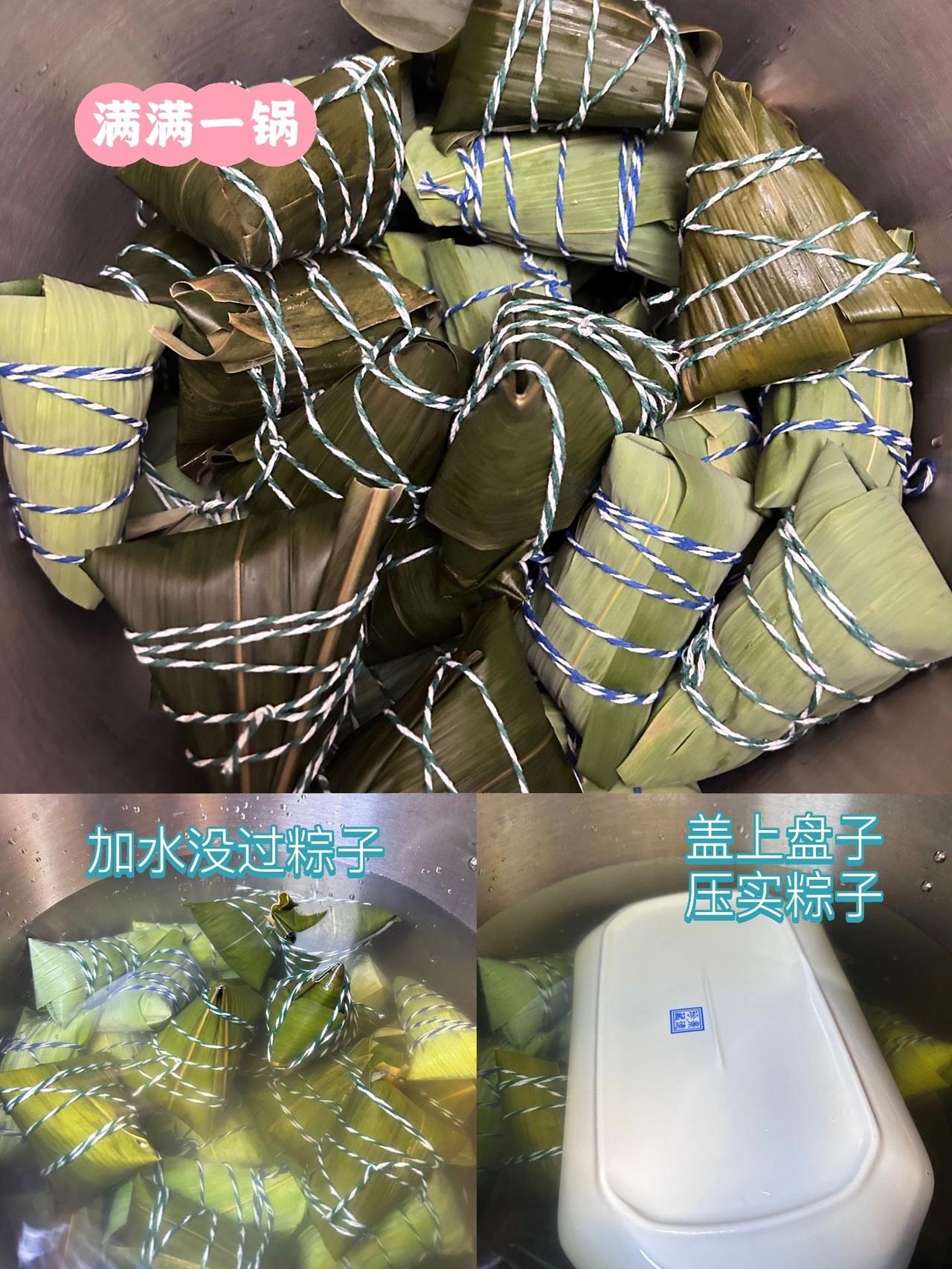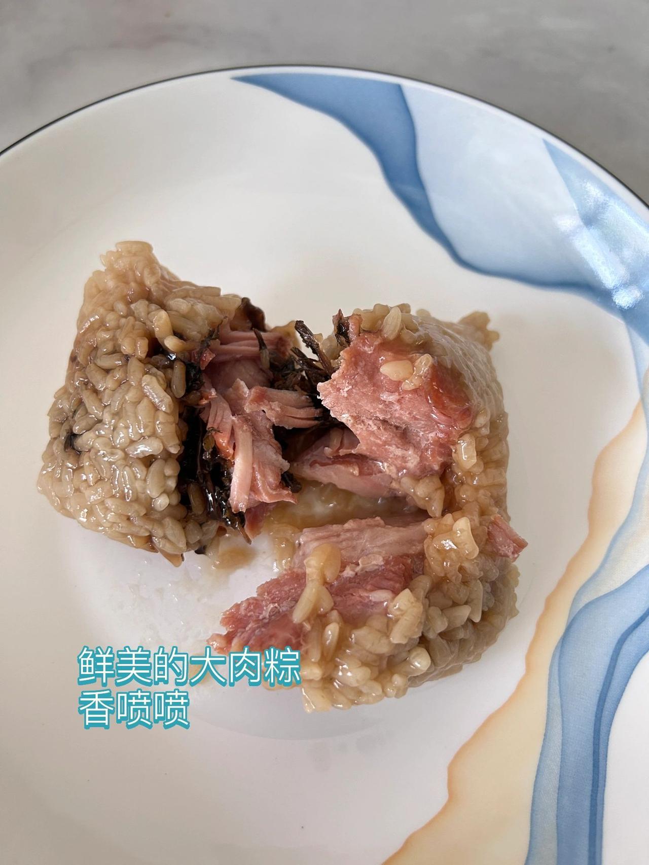 端午快到啦,有手就会的大肉粽,干货教程 每年农历端午节是我的生日、无论是在国内还是在国外,我都会亲自包上一锅梅菜大肉粽和朋友们分享,这个配方真的是年年都被朋友追着要,今天我就将这个舔指肉粽的配方分享给大家 【腌肉准备】去皮五花肉 4.5斤|味极鲜酱油 450g|蚝油 45g|砂糖 200g|鸡精 10g|味精 10g 【糯米准备】糯米 4斤|味极鲜酱油 400g|砂糖 20g|鸡精 10g|味精 5g 【梅干菜准备】梅干菜 250g|味极鲜酱油 25g|砂糖 25g|鸡精 5g|味精 5g|油 25g 【粽子材料准备】干粽叶 1包|新鲜粽叶 1包|棉绳 2捆 【制作方法】1.将1和2食材分别混合均匀,分别腌制24小时,期间不停翻拌,使食材混合的更加均匀。 2.将3的梅干菜先洗净去沙,然后混合所有食材,放入锅内翻炒,使汤汁收干,放一旁备用。 3.4干粽叶泡热水直到叶片变柔软,约15分钟左右,取出备用。新鲜粽叶可以直接食用。 4.将所有食材准备就绪后,就可以来包粽子啦!包粽子步骤请看图7。 5.此配方粽子可包40个左右。将包好的粽子放入锅内。 6.加冷水没过粽子,要确保每一个粽子都在水面以下,在水面上压一个盘子。 7.大火烧开水后转中火慢炖1小时30分钟,将粽子上下翻搅一下,继续煮1小时30分钟,总共煮3小时。之后再转烤箱100度,慢炖8小时,出锅。 知识点:1.粽子糯米不用放的过多,绳子不用过紧缠绕,因为煮的过程中糯米会膨胀。 2.煮粽子必须煮满3小时,如果第一次糯米没煮熟,回锅后糯米就很难再熟了。 3.肥肉融化至糯米里的关键就在于烤箱内8小时的慢炖,这一步真的少不了,也可以放入电饭煲,摁保温键,一个晚上即可。 是不是很简单,快码住做起来吧!