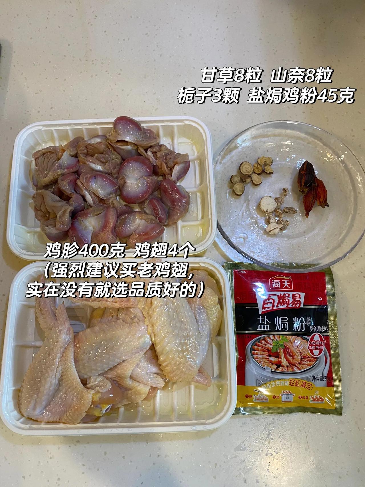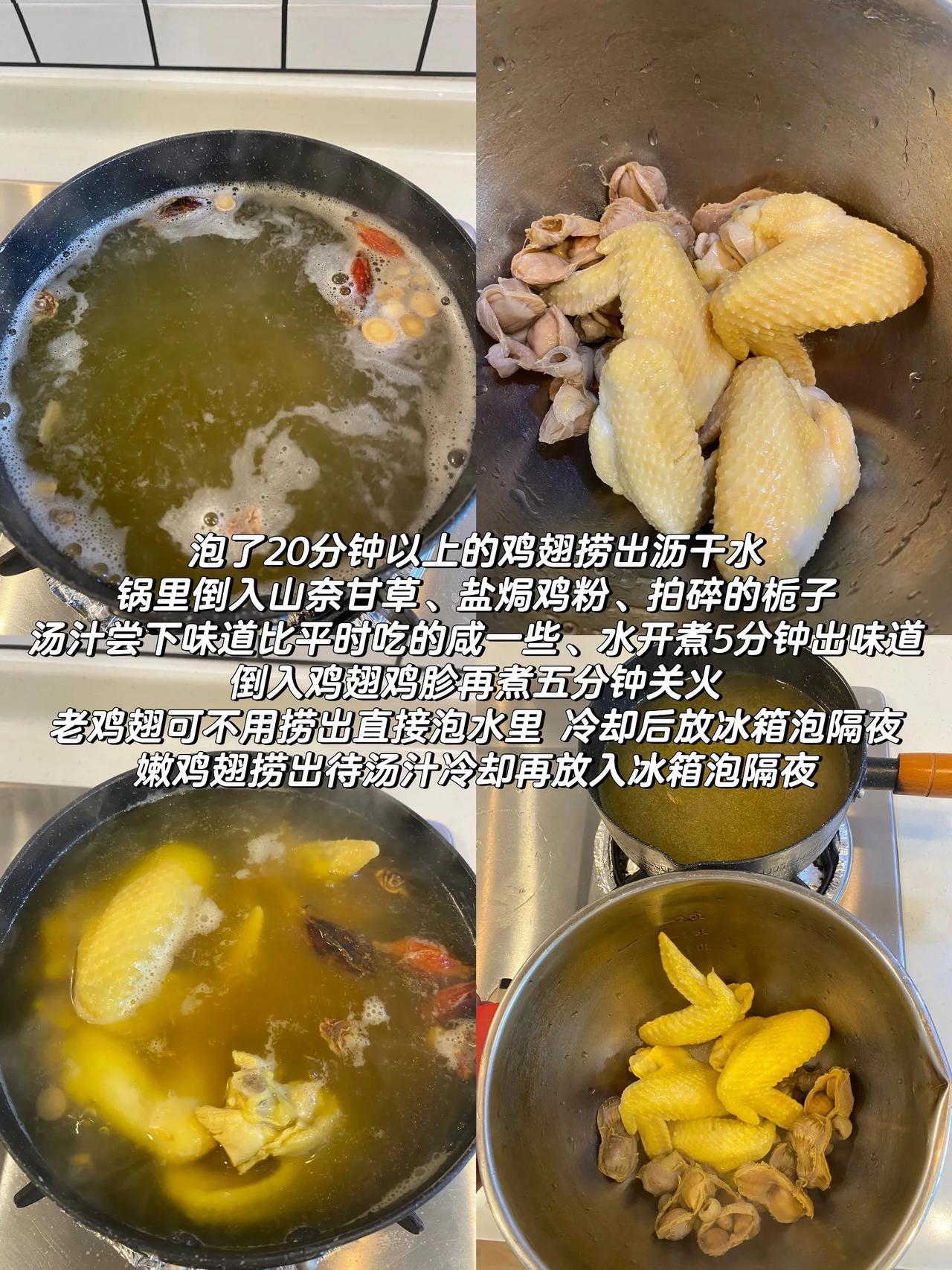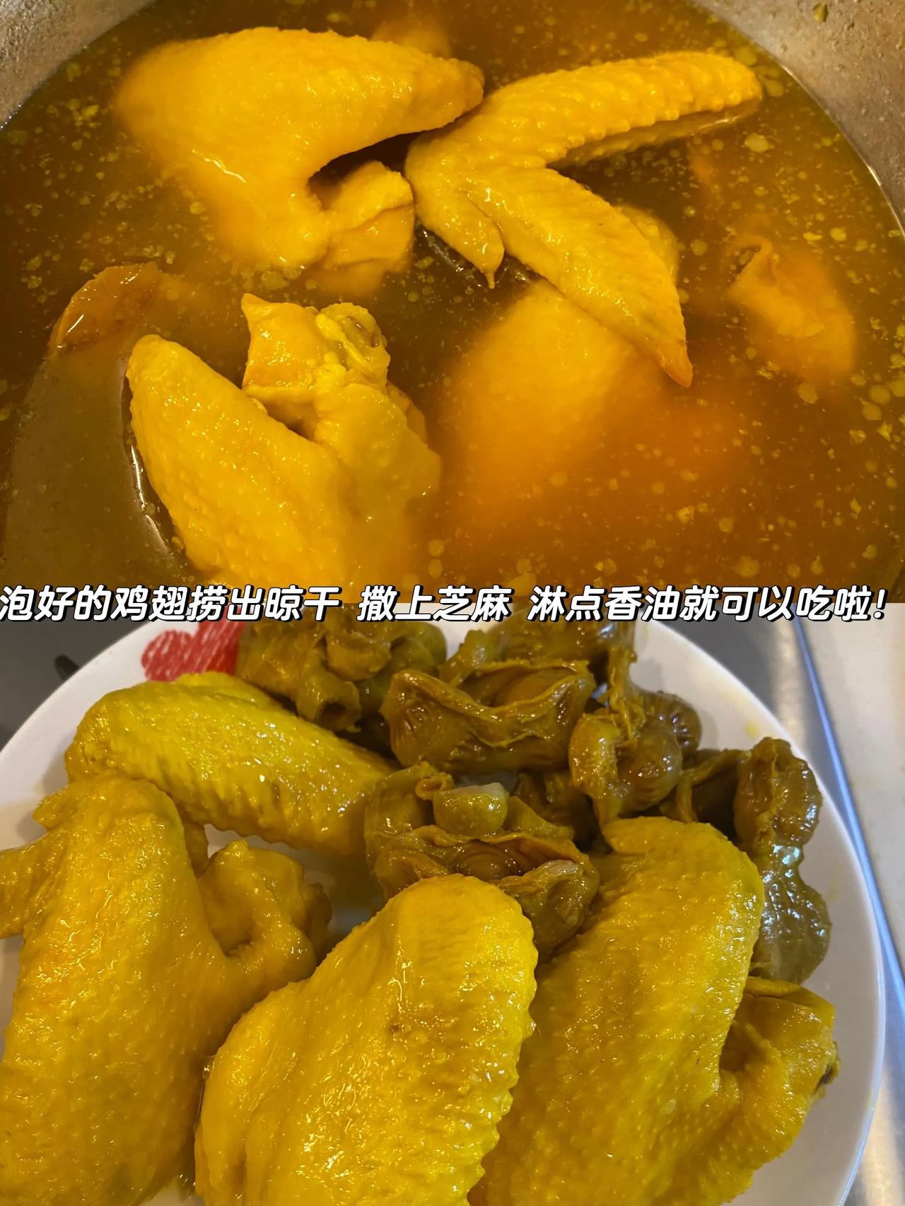 45一斤的盐焗鸡翅我可不惯着它!!分享一下我的做法~好吃到舔手指[可爱] 材料:鸡胗400克 鸡翅4个(强烈建议买老鸡翅,实在没有就选品质好的)甘草8粒 山奈8粒 ,栀子3颗 盐焗鸡粉45克 1.水开姜葱料酒焯水出泡沫即可关火,捞出冷水洗干净油星子 ,洗净泡冷水放冰箱备用(这一步很重要,不然成品会黏糊糊不够清爽) 2. 锅里倒入山奈甘草、盐焗鸡粉、拍碎的栀子,尝下味道比平时吃的咸一些、水开煮5分钟出味,倒入鸡翅鸡胗再煮五分钟关火,老鸡翅可不用捞出直接泡水里,冷却后放冰箱泡隔夜,嫩鸡翅捞出待汤汁冷却再放入冰箱泡隔夜 3. 泡好的鸡翅捞出晾干 撒上芝麻 淋点香油就可以吃啦! 4.换成鸡脚也是一样做法哦[赞]