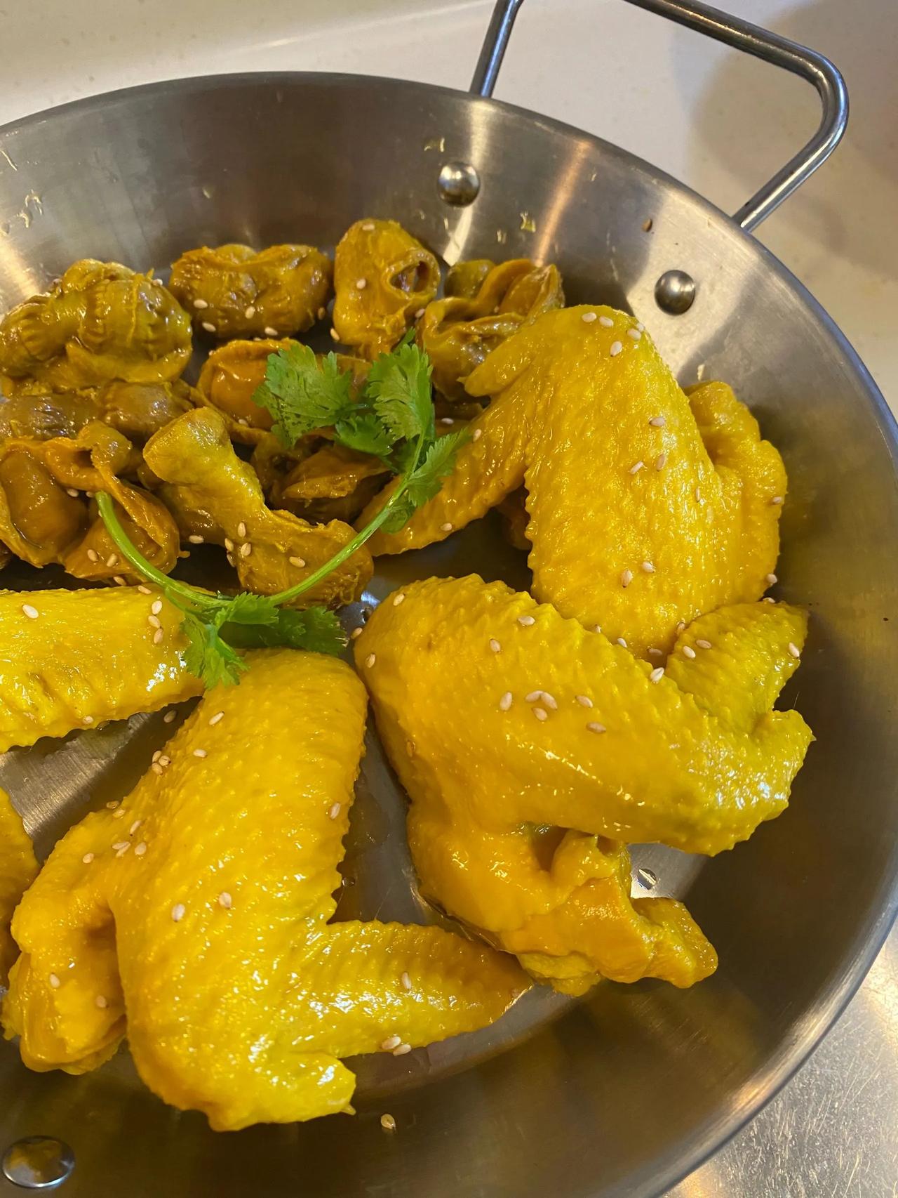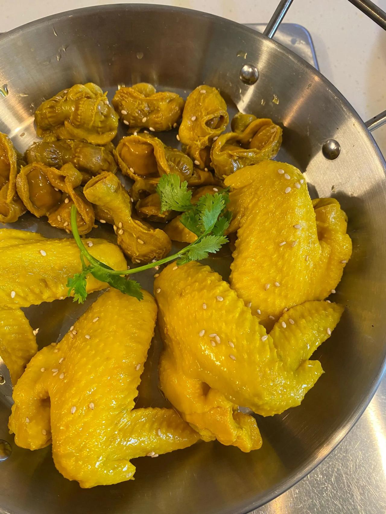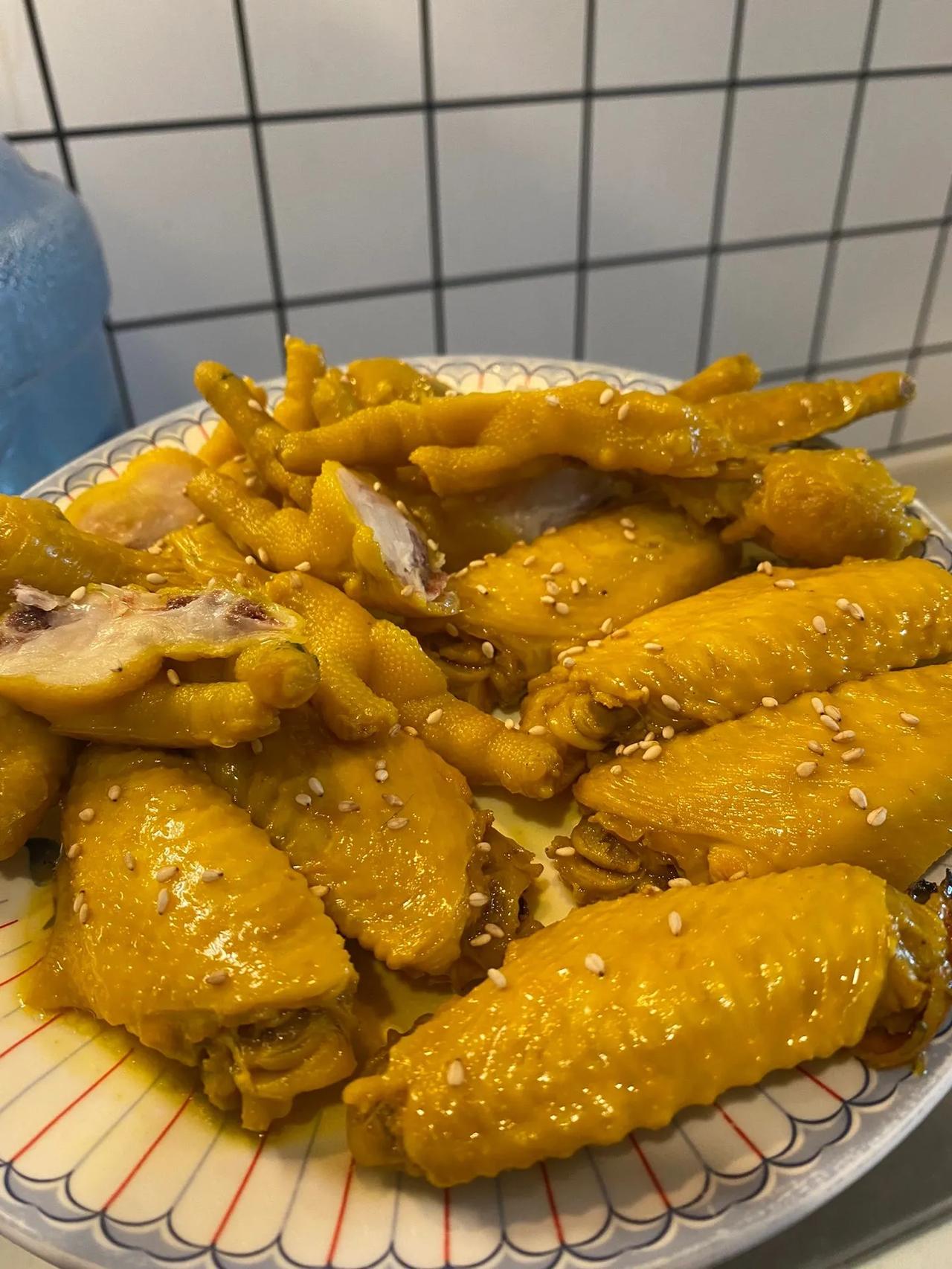 45一斤的盐焗鸡翅我可不惯着它!!分享一下我的做法~好吃到舔手指[可爱] 材料:鸡胗400克 鸡翅4个(强烈建议买老鸡翅,实在没有就选品质好的)甘草8粒 山奈8粒 ,栀子3颗 盐焗鸡粉45克 1.水开姜葱料酒焯水出泡沫即可关火,捞出冷水洗干净油星子 ,洗净泡冷水放冰箱备用(这一步很重要,不然成品会黏糊糊不够清爽) 2. 锅里倒入山奈甘草、盐焗鸡粉、拍碎的栀子,尝下味道比平时吃的咸一些、水开煮5分钟出味,倒入鸡翅鸡胗再煮五分钟关火,老鸡翅可不用捞出直接泡水里,冷却后放冰箱泡隔夜,嫩鸡翅捞出待汤汁冷却再放入冰箱泡隔夜 3. 泡好的鸡翅捞出晾干 撒上芝麻 淋点香油就可以吃啦! 4.换成鸡脚也是一样做法哦[赞]