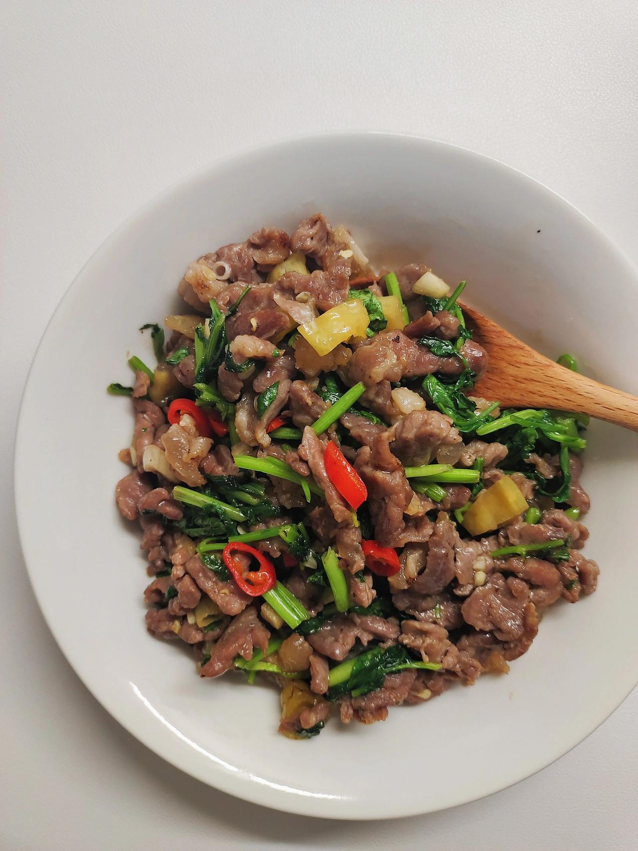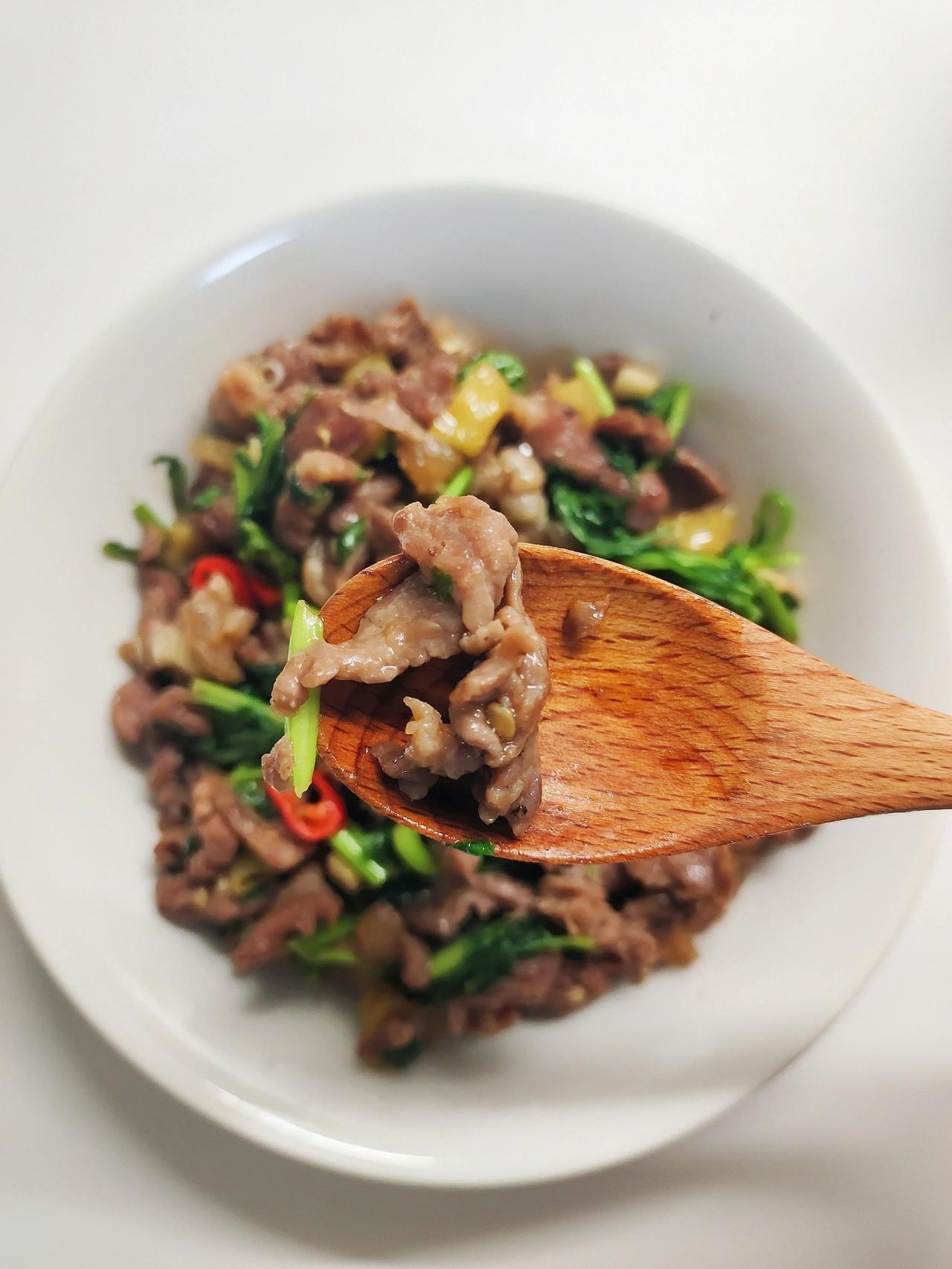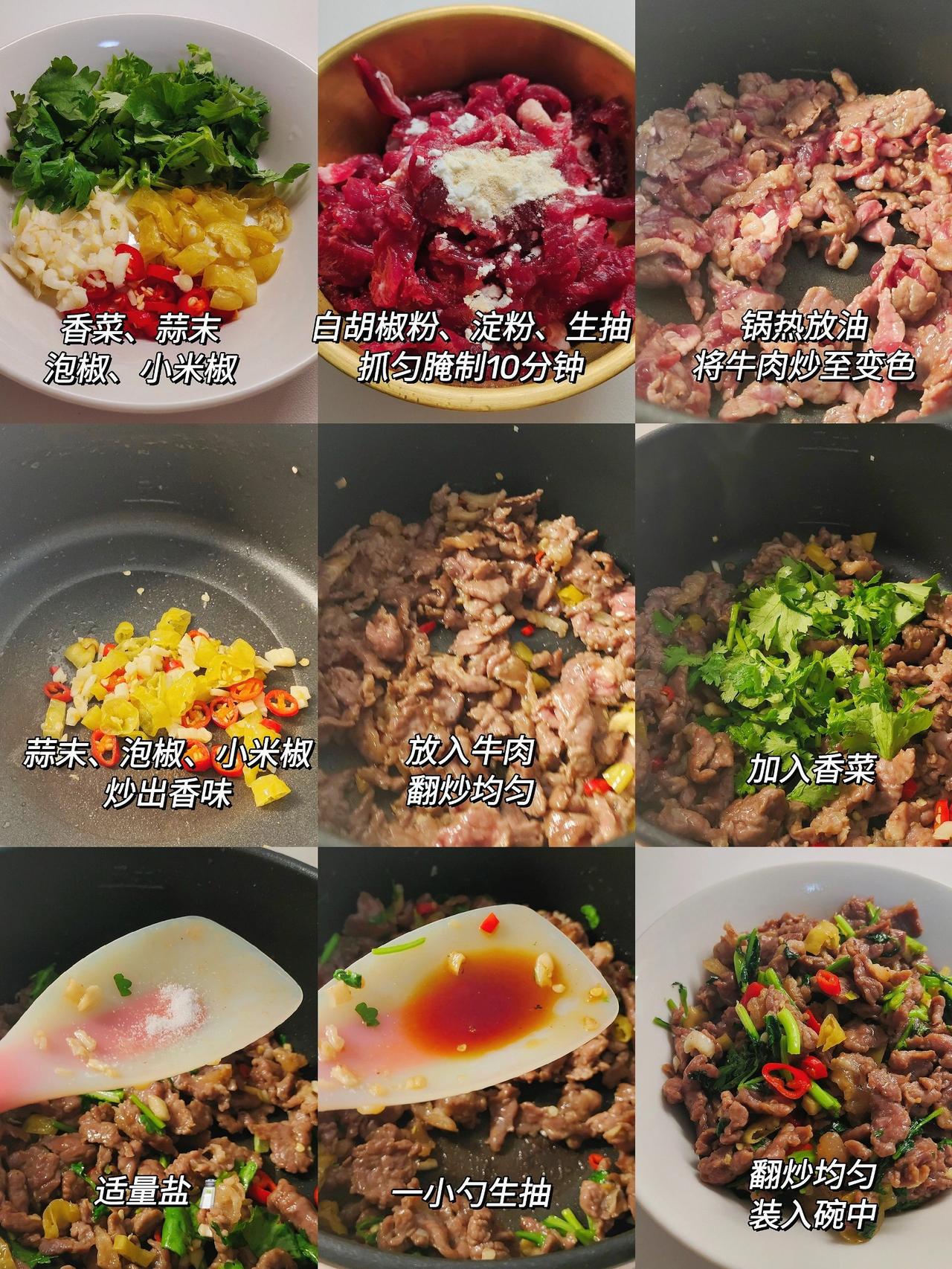 小时候,每当我在学校吃完午餐回到家时,总是会被面前这道诱人的小炒黄牛肉所迷住。 那滋味简直让人叹为观止!热乎乎的酱汁包裹着嫩滑多汁的牛肉,加上微微甜辣的口感,每一口都让我兴奋不已。就是因为这一道菜,我的妈妈成了我心目中最棒的厨师之一。 现在长大了,即使离开家也能够自己做出这道小炒黄牛肉,但每次吃到它依然能让我想起妈妈的爱和那些快乐的孩童时光。真正好的食物并不只是入口的美味,更往往承载着生活的温情和家庭的关爱。 香辣好吃的小炒黄牛肉 做法简单又下饭,这一盘太爱了 食材:牛肉、香菜、蒜末、泡椒、小米辣 做法:1、牛肉切片加一勺淀粉、一勺生抽、一勺胡椒粉、腌制10分钟 2、热锅冷油倒入牛肉炒至变色盛出来 3、将蒜末、小米辣、泡椒炒香,再倒入牛肉和香菜炒均匀,最后放入一勺盐、 一勺生抽翻炒均匀即可出锅~