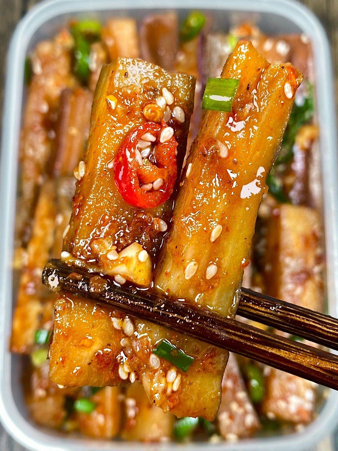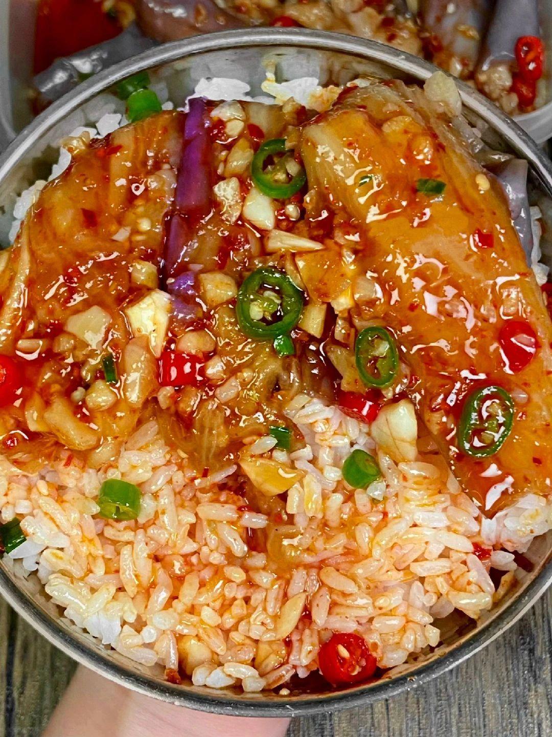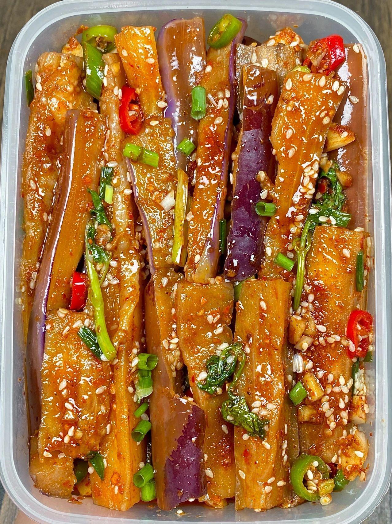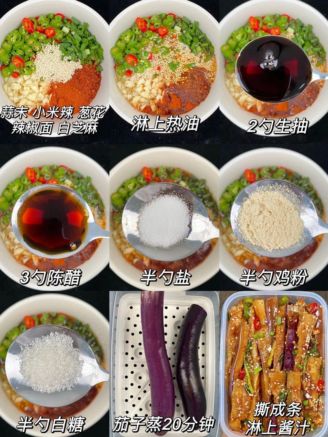 酸辣开胃又下饭,这个凉拌茄子绝了~ 家里有茄子的都快去试试这个凉拌茄子,真的老好吃了,香辣过瘾、蒜香浓郁,真的好下饭啊~ 食材:茄子、小米椒、香菜、蒜、葱 做法步骤:1、茄子洗净放锅蒸20分钟左右,出锅撕成段 2、酱汁:蒜末、小米椒、葱花、白芝麻、辣椒面,淋上热油,再加2勺生抽、3勺陈醋、半勺盐、半勺鸡粉、半勺白糖 3、茄子淋上酱汁,搅拌均匀即可~