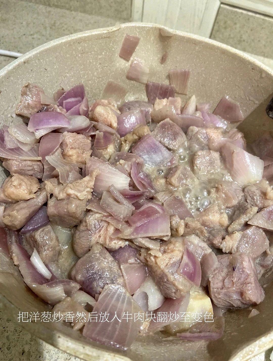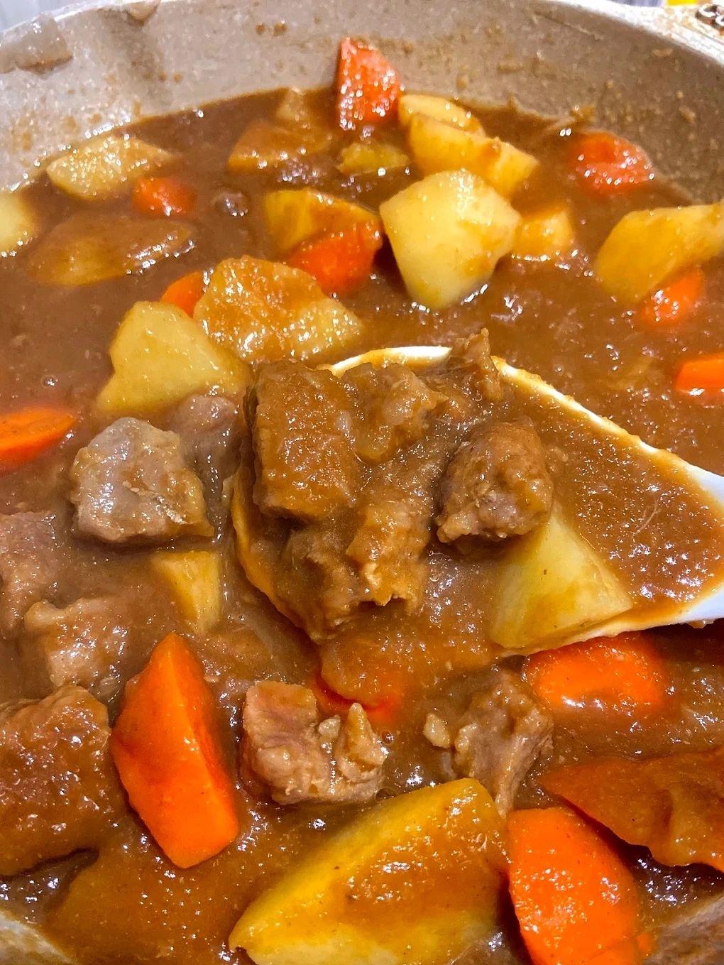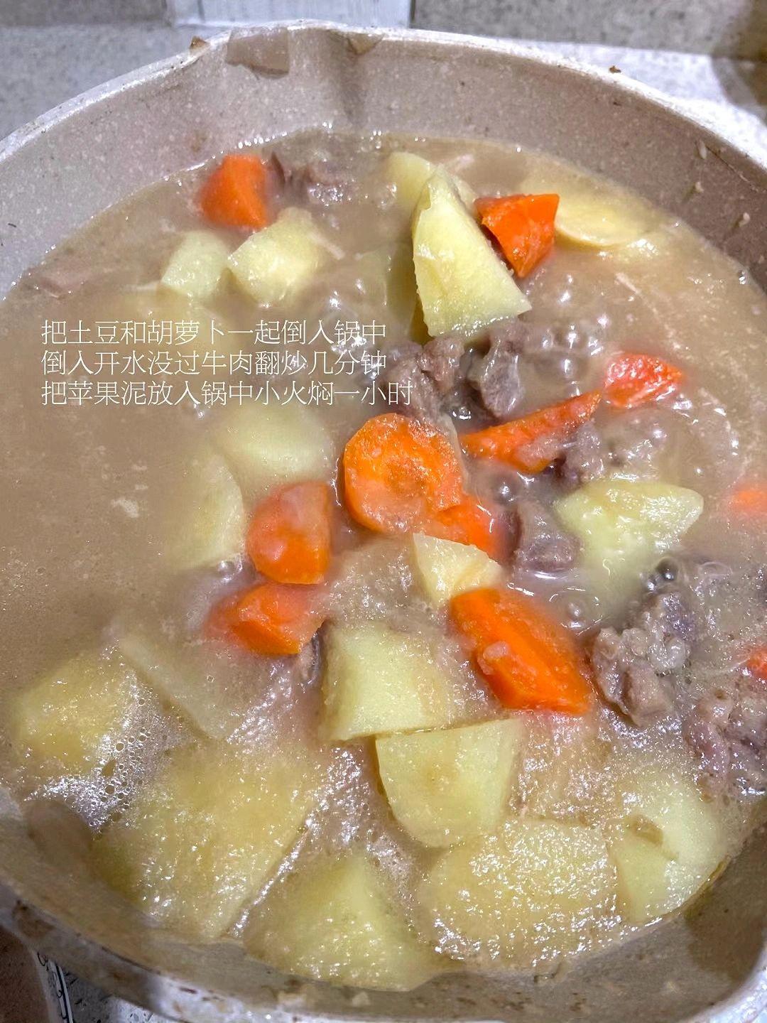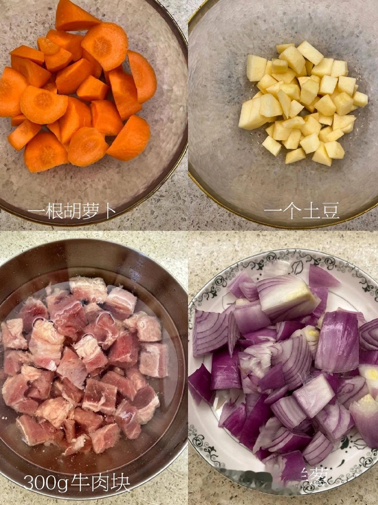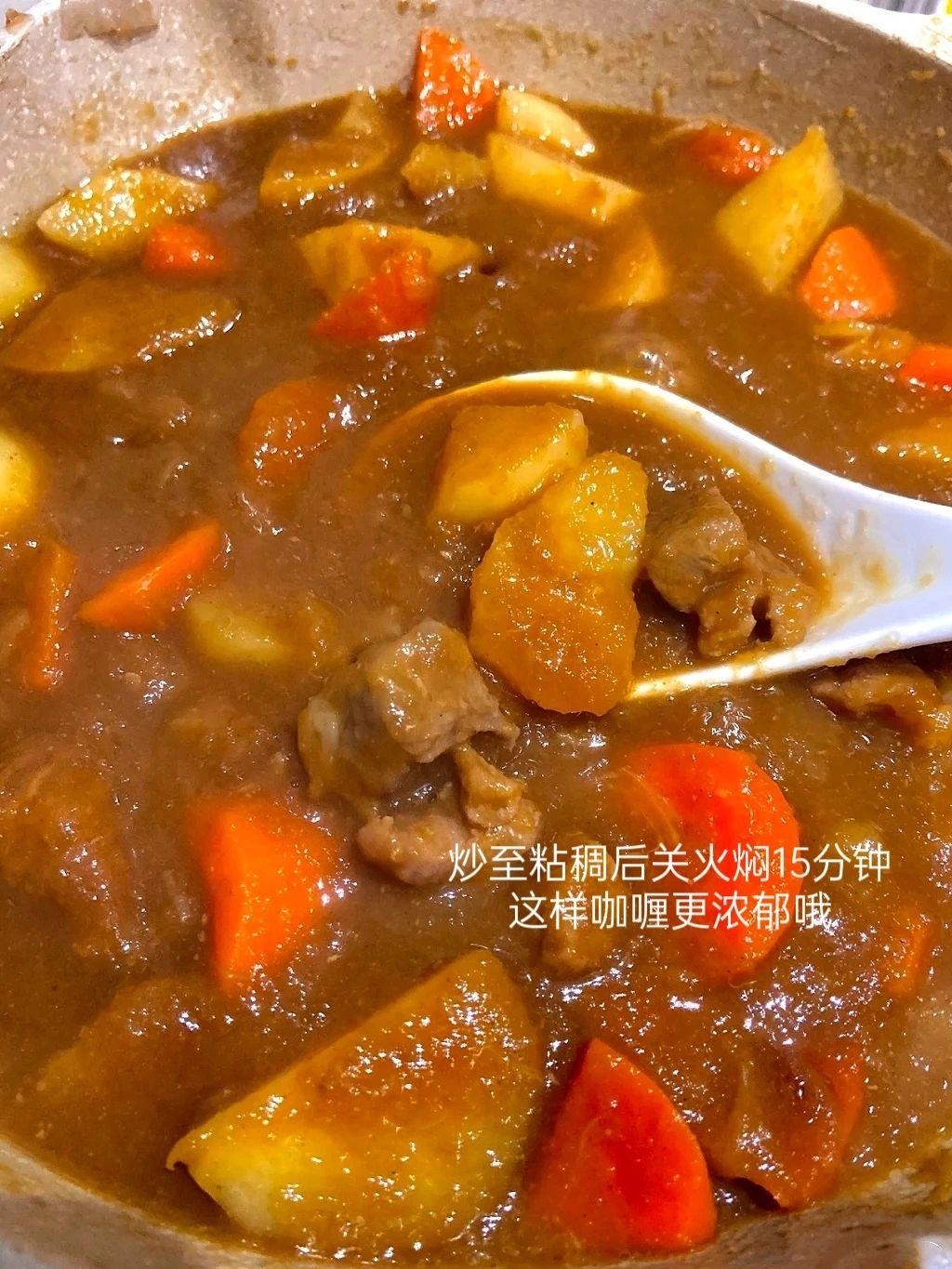 离谱!这咖喱牛肉饭我可以吃一辈子!! 咖喱牛肉饭真的太好吃了,这碳水的快乐谁懂啊!爱吃米饭的一定不能错过这道下饭菜啊!快学起来~ 准备材料:洋葱一个,土豆两个,胡萝卜两根, 牛腩一块,苹果1个,咖喱块一份。 具体做法:1、首先把材料准备好,牛腩化冻切块,放入凉水,浸泡出血水,浸泡半小时以上,中间换水两次,洗干净备用。 2、把洋葱切块,胡萝卜切块,土豆切块 3、砂锅热油,放入洋葱炒香,然后倒入牛腩翻炒至变色,加一勺料酒继续翻炒,几分钟后加开水,水要没过牛肉,大火煮开撇去浮沫,加盖子转小火焖一小时 4、接着苹果去皮切块,打成苹果泥备用,牛腩好了以后加入土豆块胡萝卜块,加入苹果泥小火焖15分钟,让胡萝卜土豆熟透,最后放入咖喱块,一勺蜂蜜,一勺老抽,一勺生抽,炒至粘稠后,关火焖15分钟,这样咖喱会更浓郁! 淋在米饭上真的绝了!超好吃!