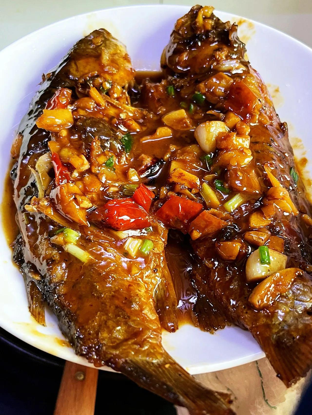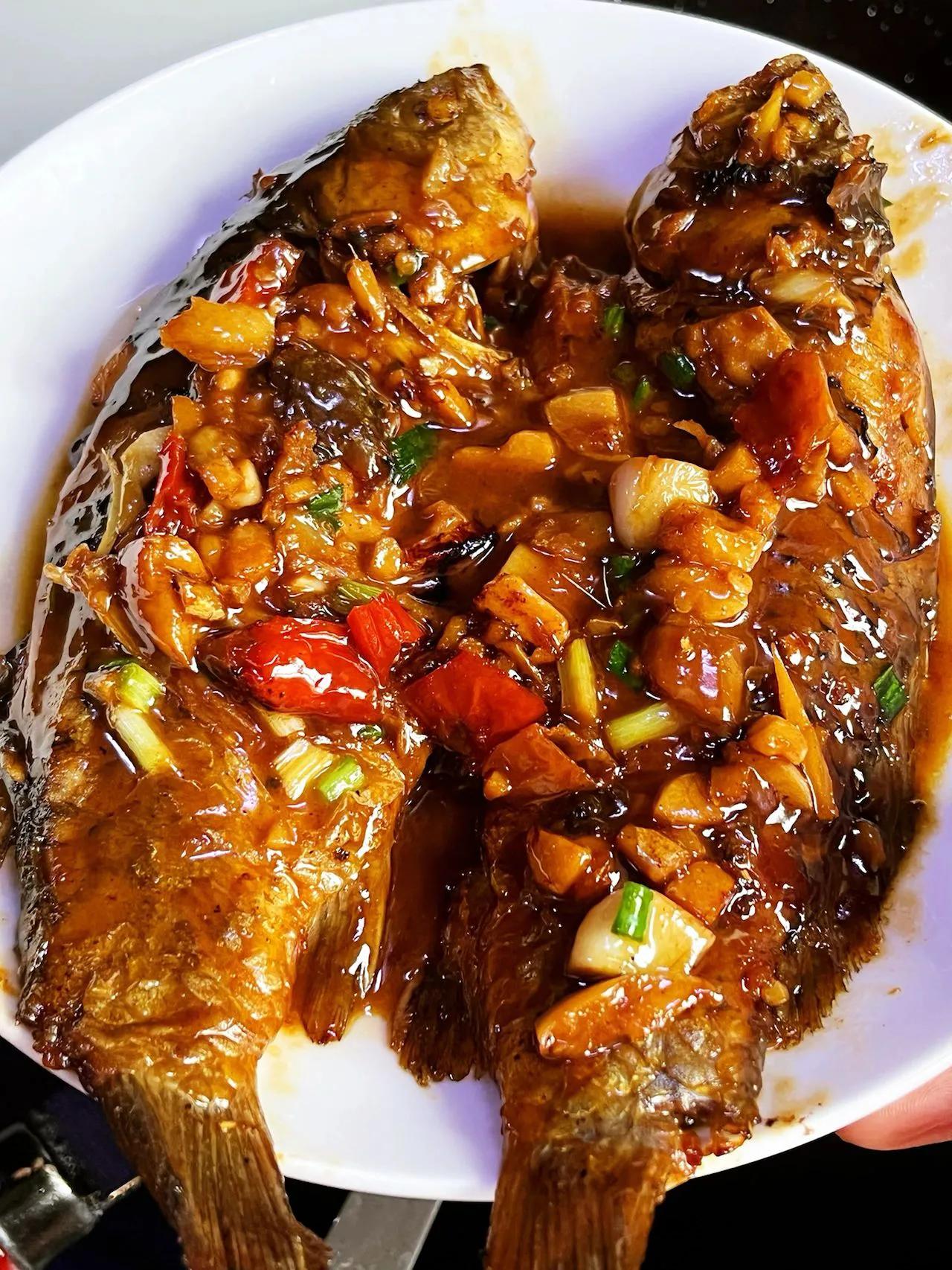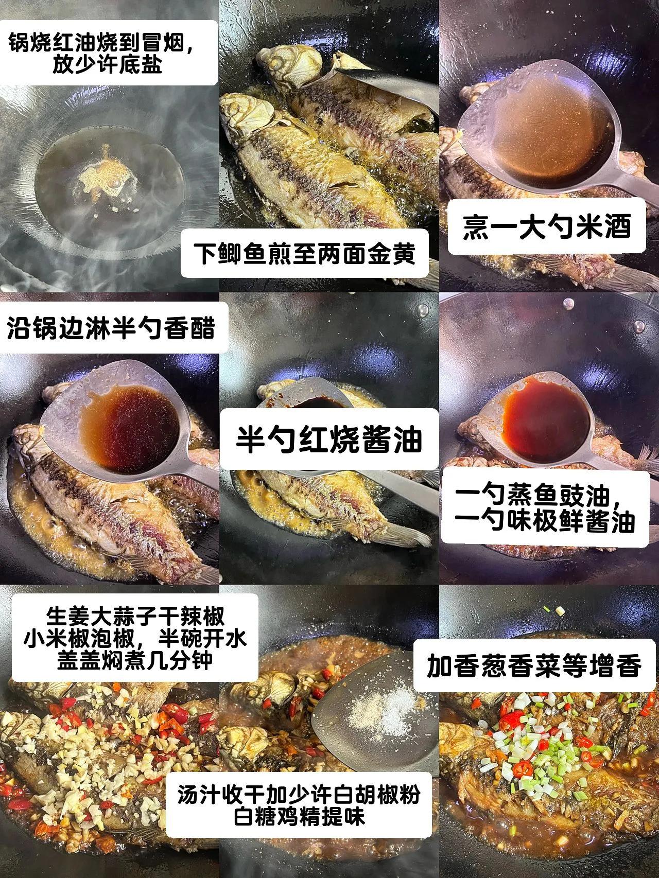 以后要是想吃鱼了,你就像我这样做个红烧鲫鱼。做法简单特别好吃! 做法: 1、鲫鱼洗净控干水,生姜、大蒜子、小米椒、干辣椒、泡椒、香葱切好; 2、锅烧红油烧到冒烟,放少许底盐,下鲫鱼煎至两面金黄; 3、烹一大勺米酒,沿锅边淋半勺香醋,倒入半勺红烧酱油、一勺蒸鱼豉油、一勺味极鲜酱油; 4、倒入切好的生姜、大蒜子、干辣椒、小米椒、泡椒,倒半碗开水,盖上盖焖煮几分钟; 5、汤汁收干加少许白胡椒粉、白糖、鸡精提味,加香葱、香菜等增香即可。
