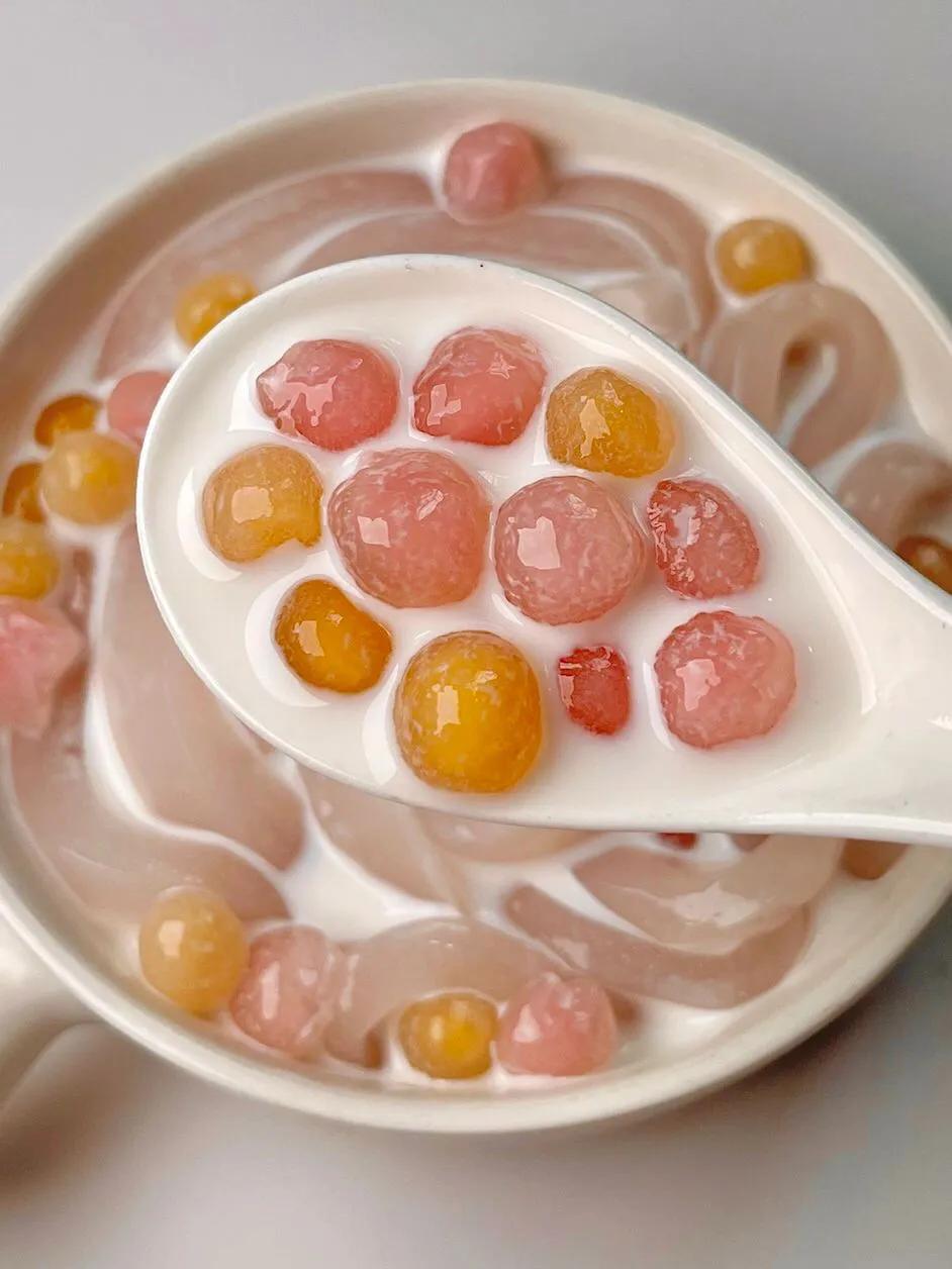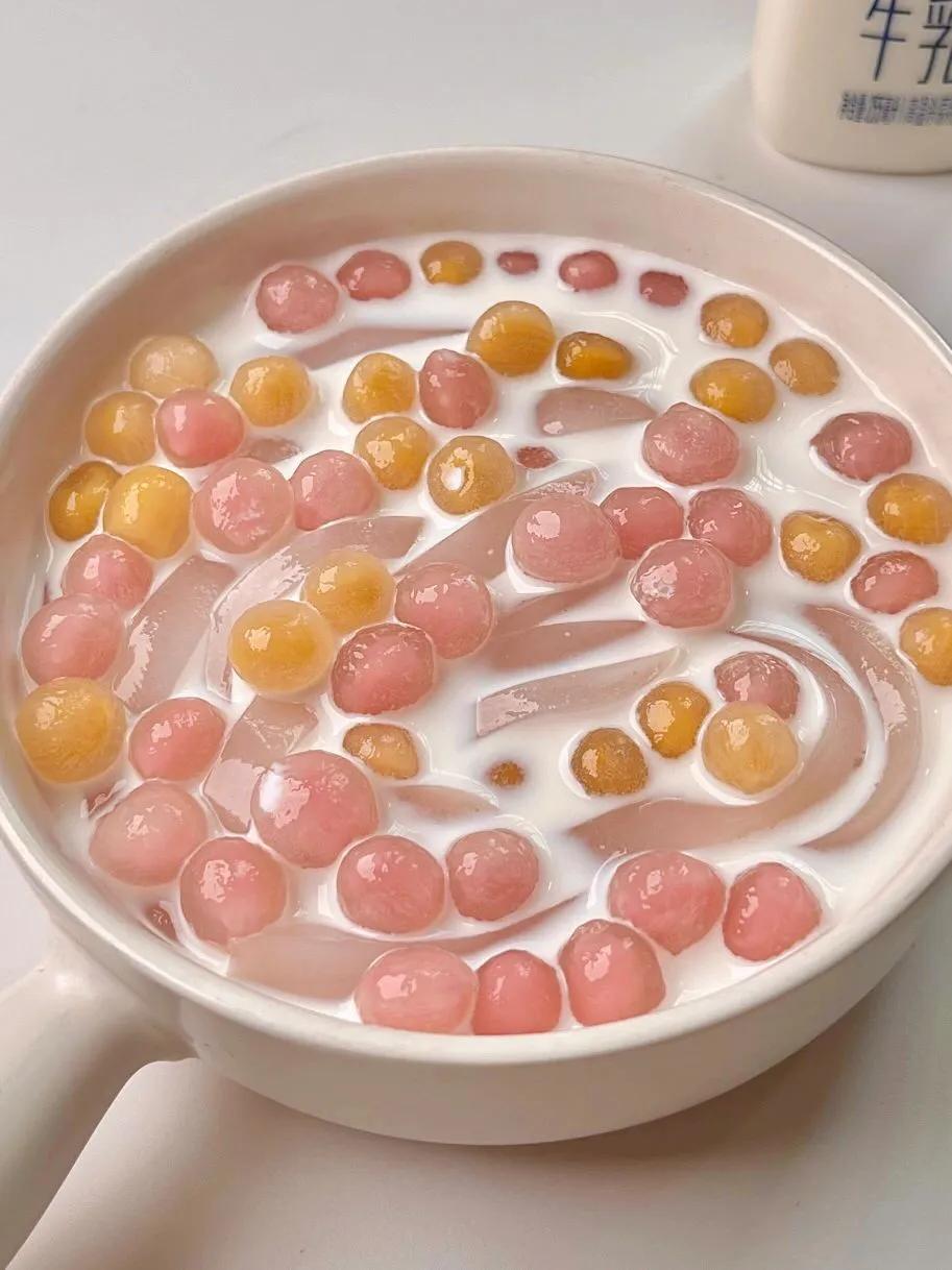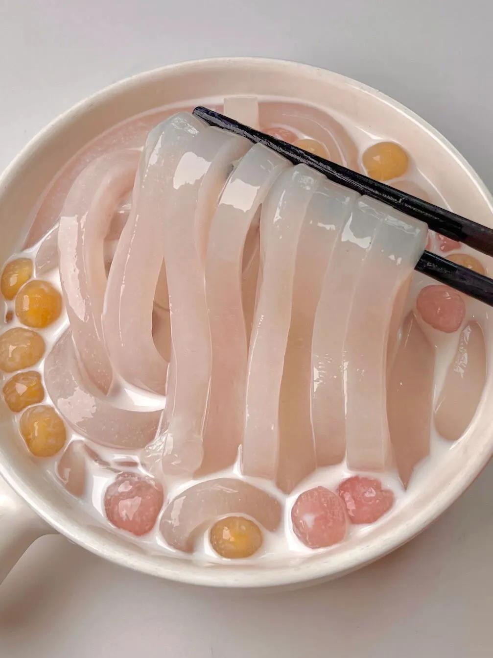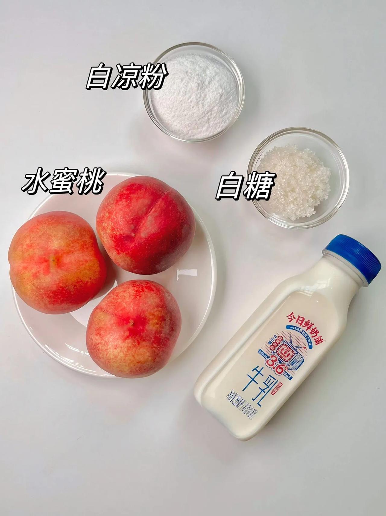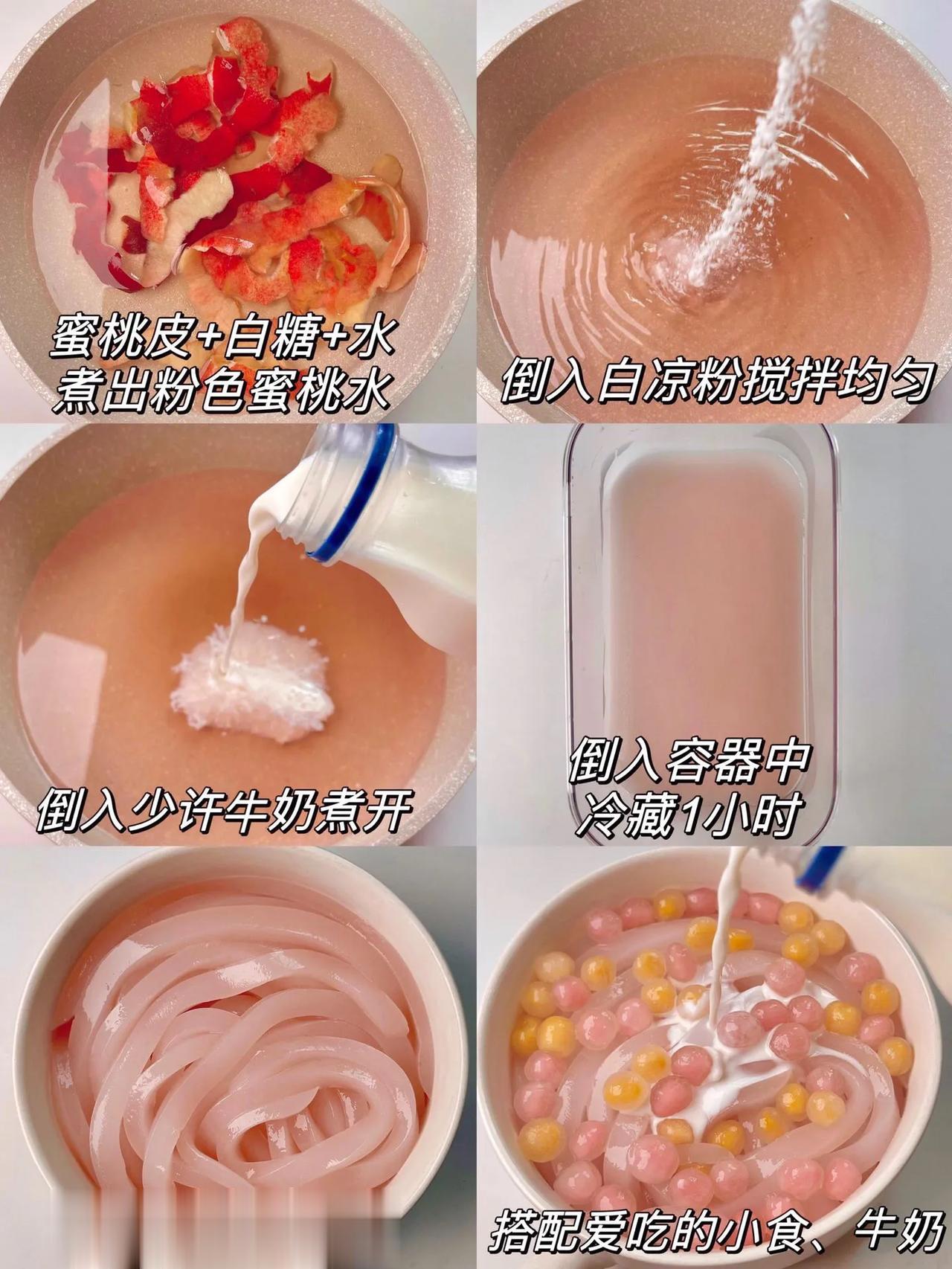 冰凉爽口!水蜜桃奶冻!桃味浓郁超好喝! 今天给大家分享一道夏日甜品!水蜜桃奶冻!桃味浓郁,冰凉爽口!做法简单,赶紧换掉奶茶吧~ 做法: 1、蜜桃皮+白糖+水煮出粉色蜜桃水,倒入白凉粉搅拌均匀; 2、倒入少许牛奶煮开,再倒入容器中冷藏1小时; 3、切条装入碗中,搭配爱吃的小食、牛奶即可。
