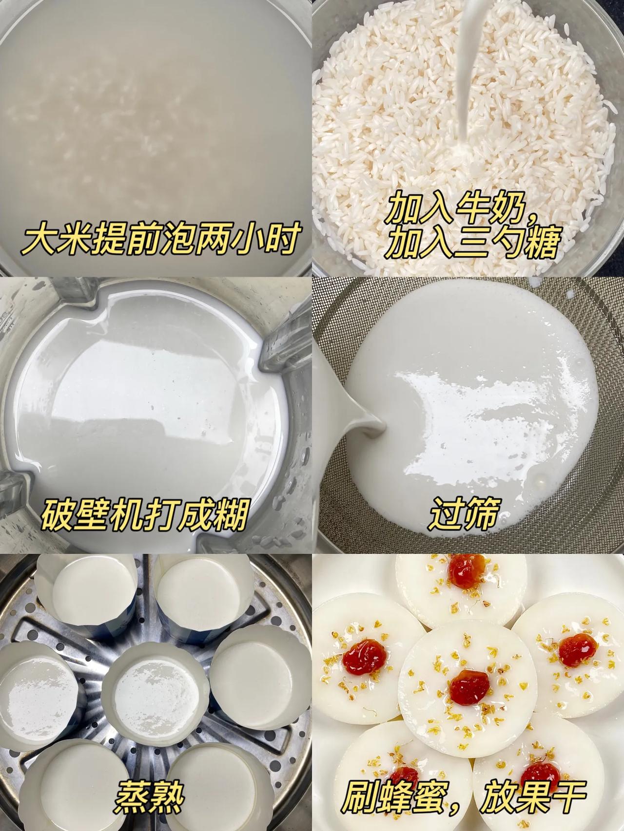 家里只要有大米就能做奶香米糕,Q糖软糯! 食材:大米200克,牛奶180毫升,白糖25克,蜂蜜和果干。 做法: 1、大米提前泡两小时,加入牛奶、三勺糖,破壁机打成糊后过筛; 2、放锅上蒸熟,刷蜂蜜,放果干即可。