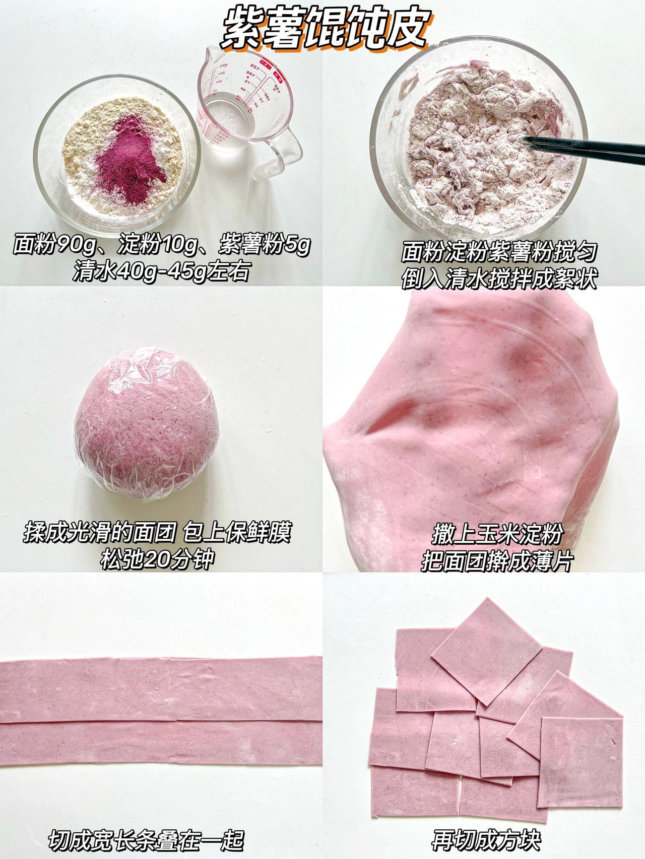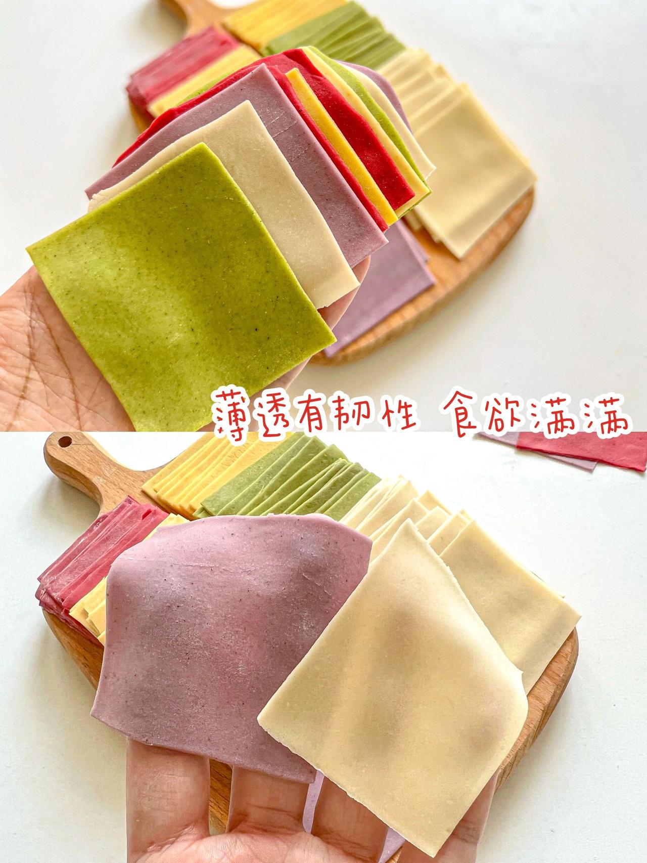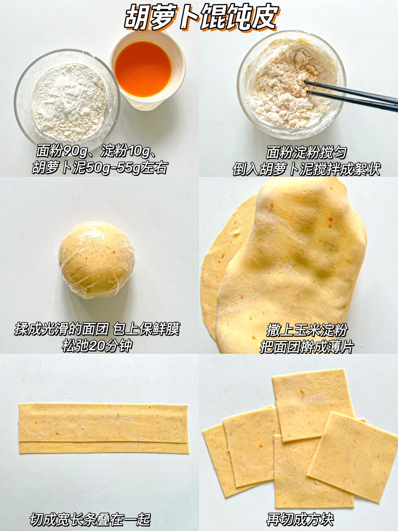 自制果蔬馄饨皮·无盐无碱·做法简单又健康 哈喽~我们家真的是馄饨大户,全家都很喜欢吃馄饨,我又担心外面的馄饨皮不够健康,所以在家自制啦!来给大家分享6种口味的馄饨皮,有不吃蔬菜的宝宝也可以试试这么做哦! 没有果蔬粉可以用果蔬泥来和面,面团是偏硬一点的状态 吃不完的可以冷冻保存 可以不放淀粉直接用100g面粉 · 胡萝卜馄饨皮:90g面粉➕10g淀粉➕50g左右胡萝卜泥 紫薯馄饨皮:90g面粉➕10g淀粉➕5g紫薯粉➕40g-45g清水 南瓜馄饨皮:90g面粉➕10g淀粉➕5g南瓜粉➕40g-45g清水 甜菜馄饨皮:90g面粉➕10g淀粉➕5g红甜菜粉➕40g-45g清水 菠菜馄饨皮:90g面粉➕10g淀粉➕5g菠菜粉➕40g-45g清水 原味馄饨皮:90g面粉➕10g淀粉➕40g-45g清水 做法:1、面粉淀粉果蔬粉混合➕清水(或果蔬泥)搅拌成絮状 2、揉成光滑的面团醒发松弛20分钟 3、撒上玉米淀粉松弛好的面团擀成薄片 4、切成宽长条叠在一起,切成方块就搞定了 - 多种颜色可以增加吃饭的乐趣,也可以教宝宝认识颜色哦