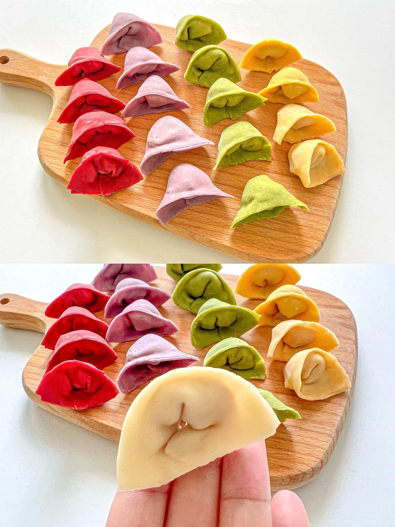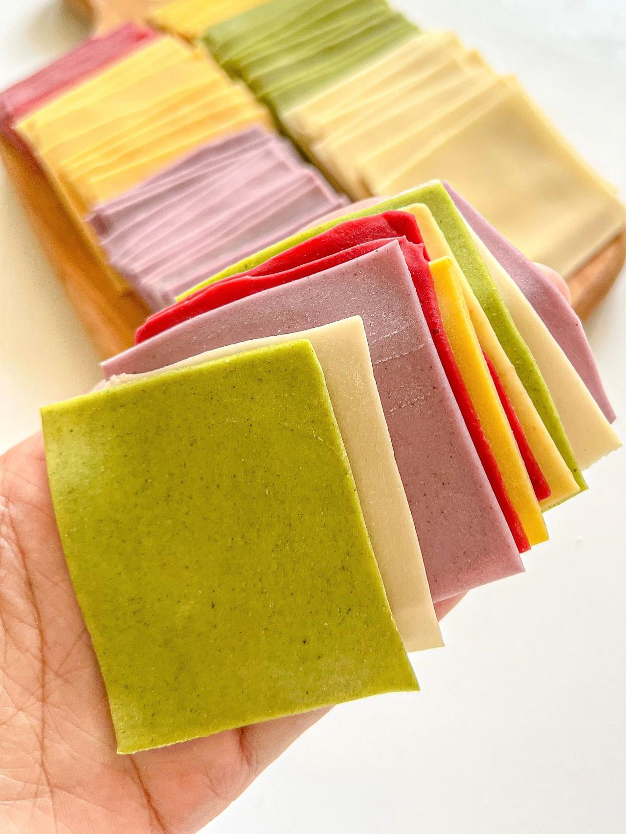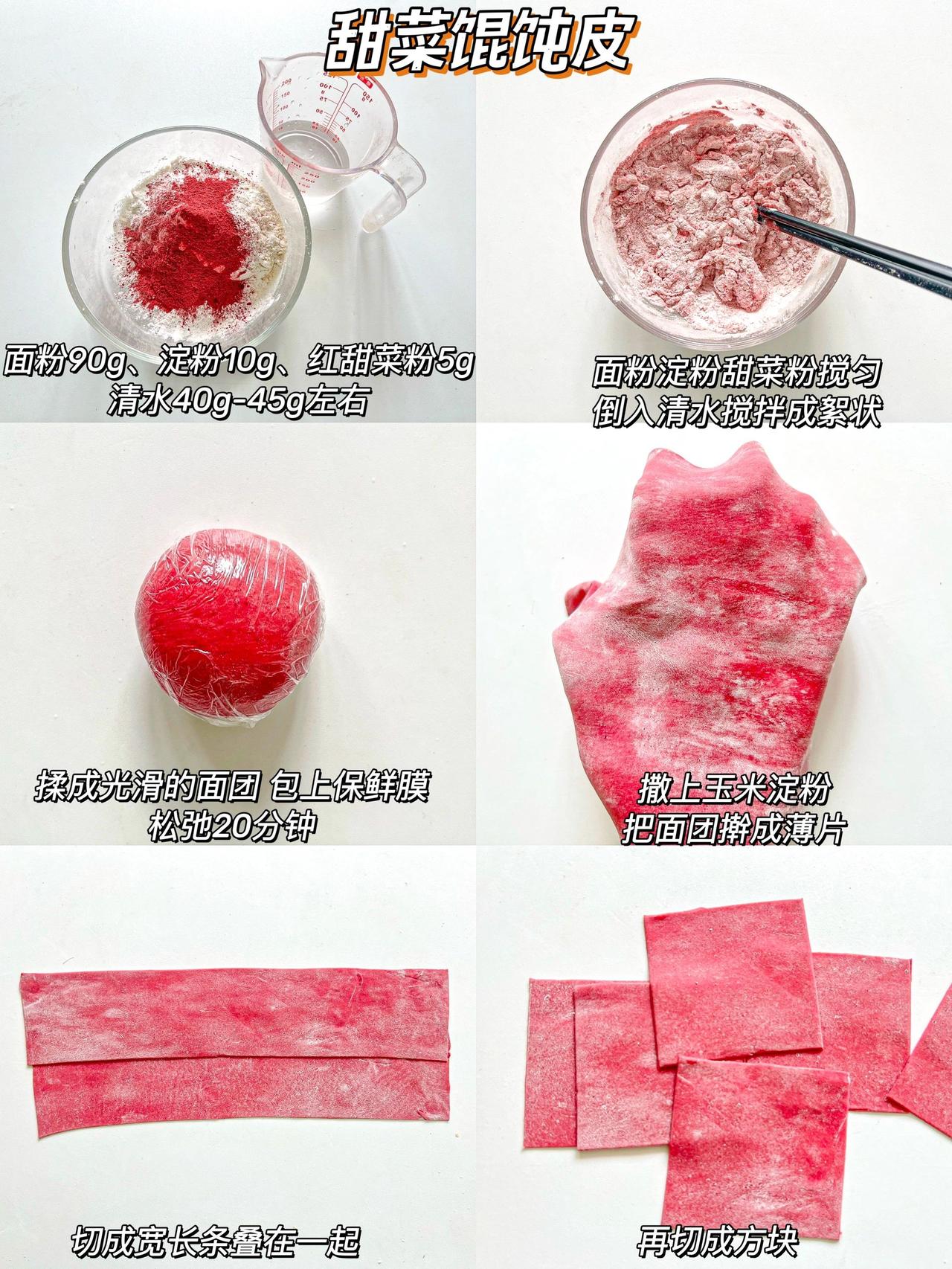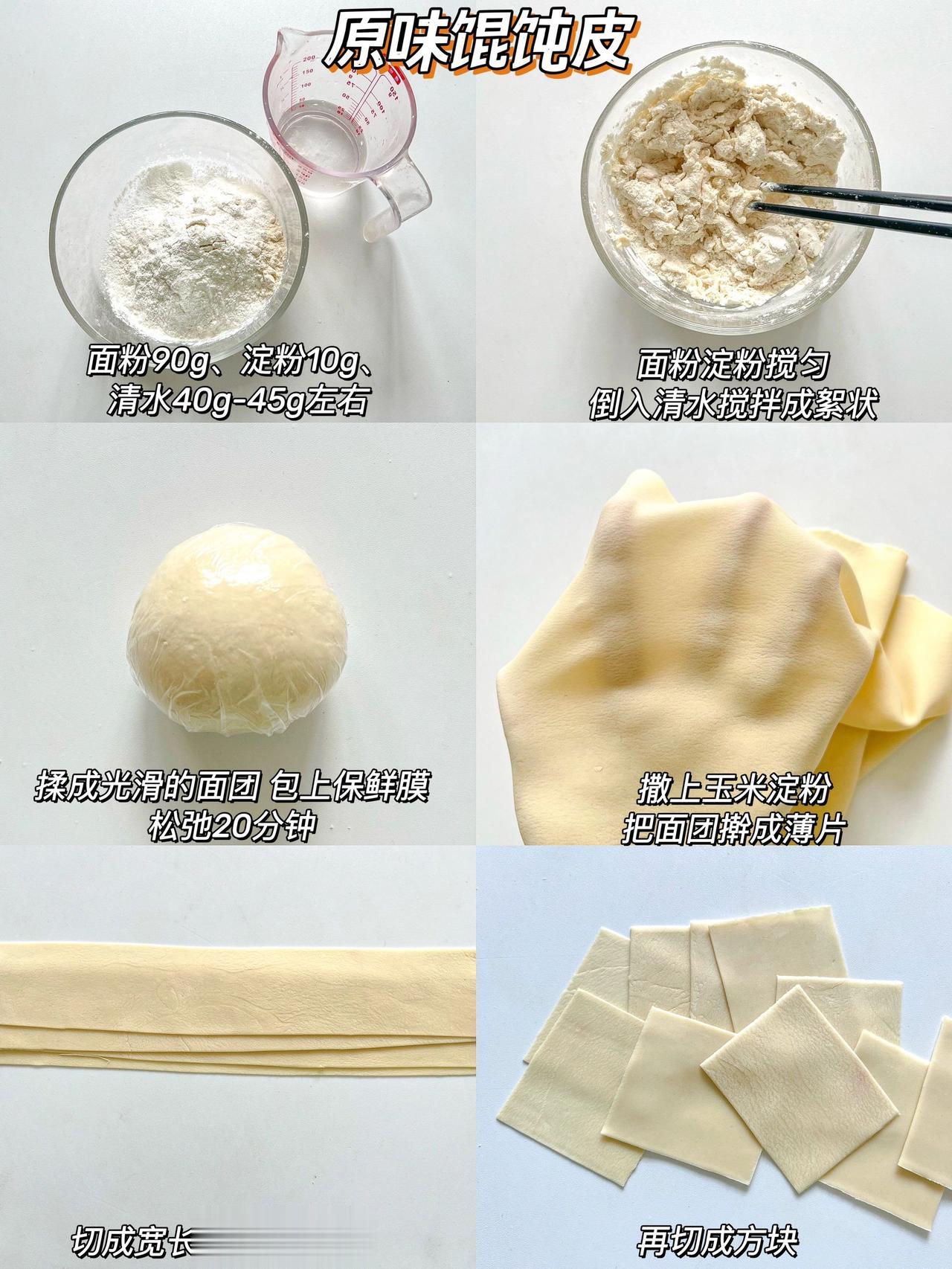 自制果蔬馄饨皮·无盐无碱·做法简单又健康 哈喽~我们家真的是馄饨大户,全家都很喜欢吃馄饨,我又担心外面的馄饨皮不够健康,所以在家自制啦!来给大家分享6种口味的馄饨皮,有不吃蔬菜的宝宝也可以试试这么做哦! 没有果蔬粉可以用果蔬泥来和面,面团是偏硬一点的状态 吃不完的可以冷冻保存 可以不放淀粉直接用100g面粉 · 胡萝卜馄饨皮:90g面粉➕10g淀粉➕50g左右胡萝卜泥 紫薯馄饨皮:90g面粉➕10g淀粉➕5g紫薯粉➕40g-45g清水 南瓜馄饨皮:90g面粉➕10g淀粉➕5g南瓜粉➕40g-45g清水 甜菜馄饨皮:90g面粉➕10g淀粉➕5g红甜菜粉➕40g-45g清水 菠菜馄饨皮:90g面粉➕10g淀粉➕5g菠菜粉➕40g-45g清水 原味馄饨皮:90g面粉➕10g淀粉➕40g-45g清水 做法:1、面粉淀粉果蔬粉混合➕清水(或果蔬泥)搅拌成絮状 2、揉成光滑的面团醒发松弛20分钟 3、撒上玉米淀粉松弛好的面团擀成薄片 4、切成宽长条叠在一起,切成方块就搞定了 - 多种颜色可以增加吃饭的乐趣,也可以教宝宝认识颜色哦
