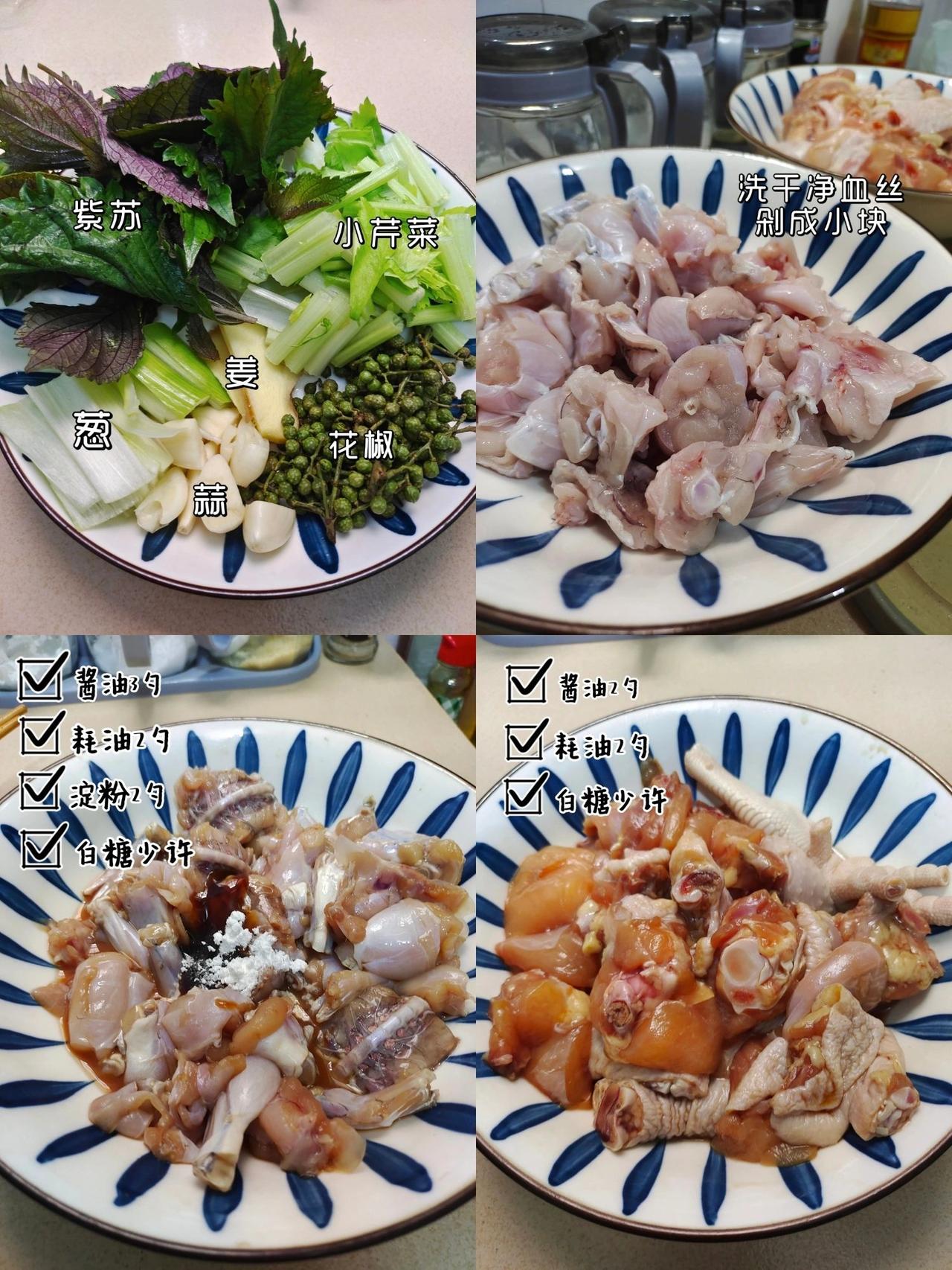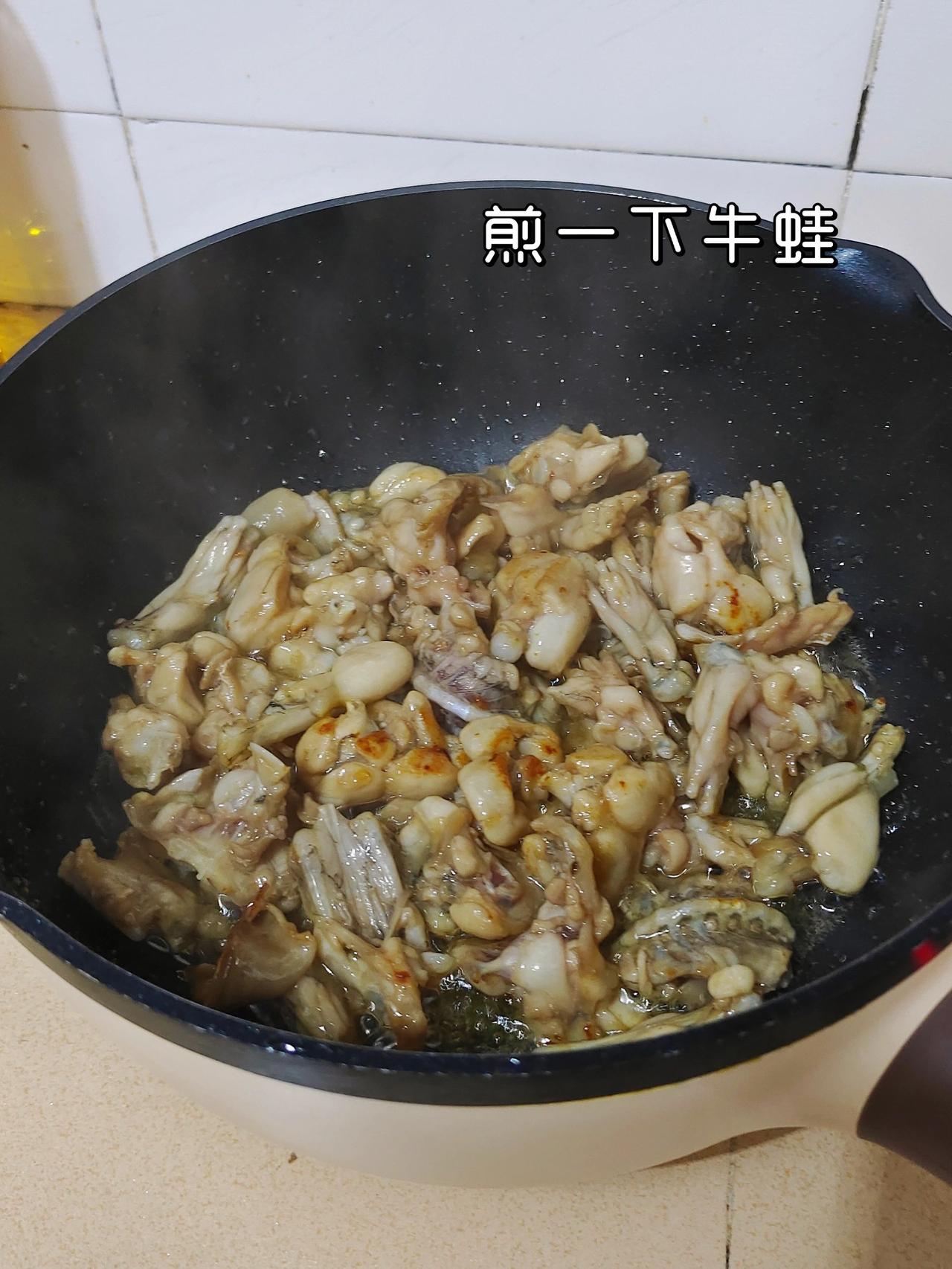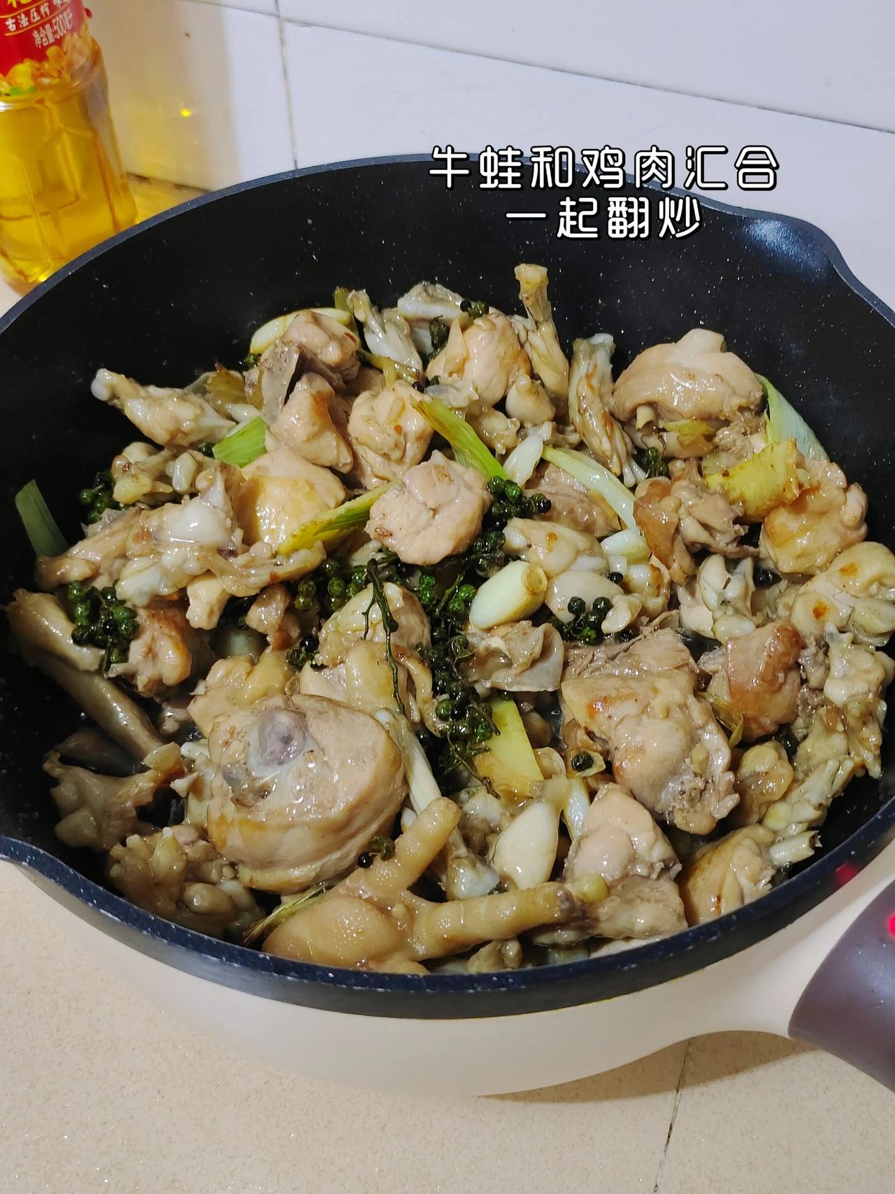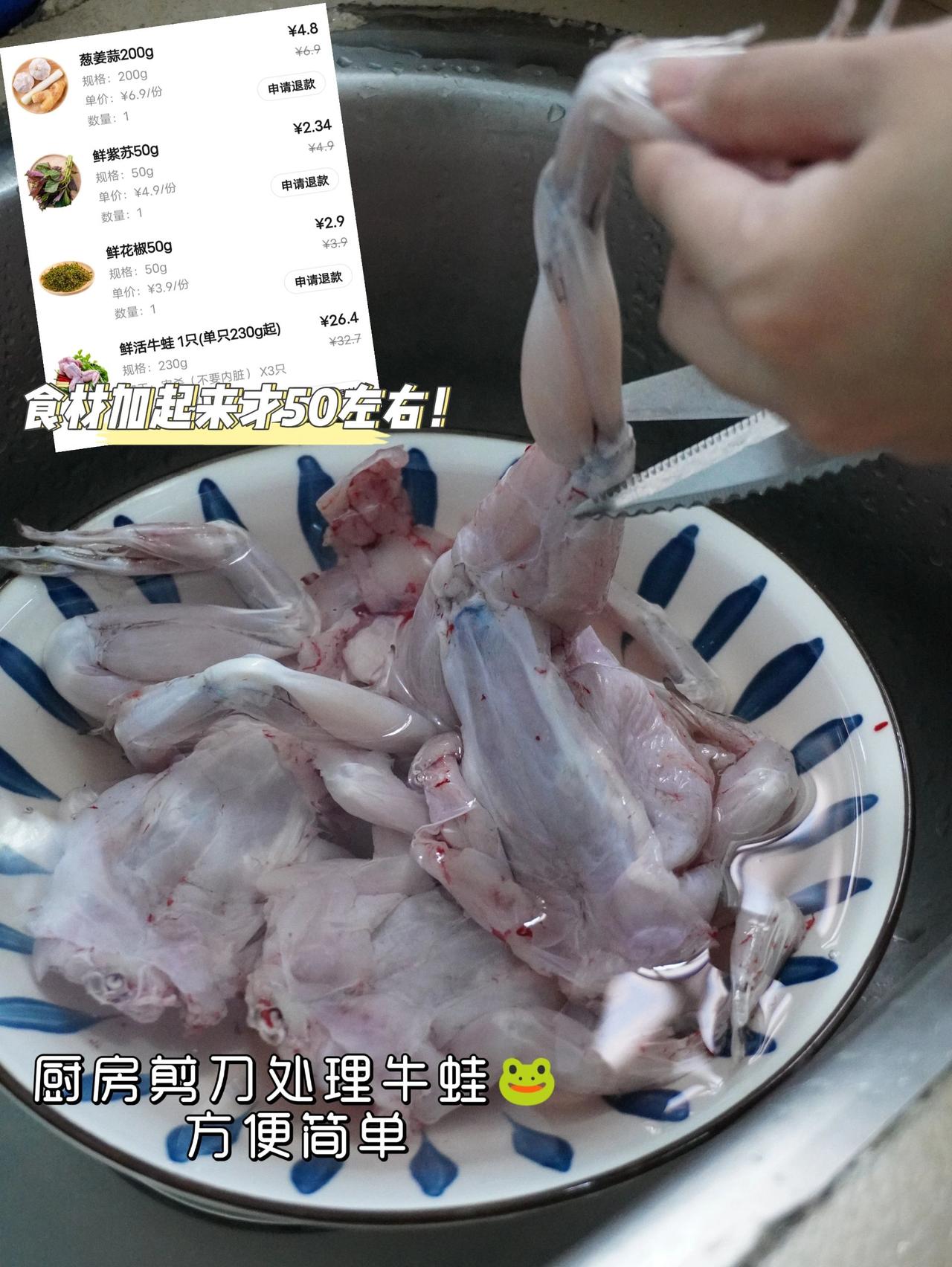 周末了,嘴真的太馋了!外面一直下雨,不想出门但是好想念蛙蛙 想起冰箱剩下的鸡肉,马上在买菜软件下单牛蛙,50左右就拥有一满满大锅椒麻紫苏牛蛙鸡!自己做真的太实惠了!舍友都馋哭啦 食材:牛蛙 鸡肉 葱 姜 蒜 小香芹 紫苏 花椒 1、处理牛蛙和鸡肉。美团买牛蛙可以选择宰杀去内脏,但是太新鲜了还会动,可以先放一会儿再处理!用厨房剪刀,处理一下它的手套袜子,从关节处剪切成小块,鸡肉也浸泡去血水。 2、腌一下牛蛙和鸡肉,牛蛙加一些淀粉,方便煎炸。 3、准备好葱姜蒜,切块。小香芹切段,紫苏洗干净。 4、大火烧锅,冷油下牛蛙煎炸,捞出备用。再煎一下鸡肉,捞出备用。 5、葱姜蒜、花椒爆香,加一勺豆瓣酱 6、牛蛙和鸡肉汇合到一起!下紫苏爆炒,加一点水,加盖焖5分钟。 7、开盖大火收汁,下小香芹再炒一下,大功告成! 一大锅香喷喷的椒麻紫苏牛蛙鸡!巨下饭!舍友连炫两碗!大家都可以试试呀!