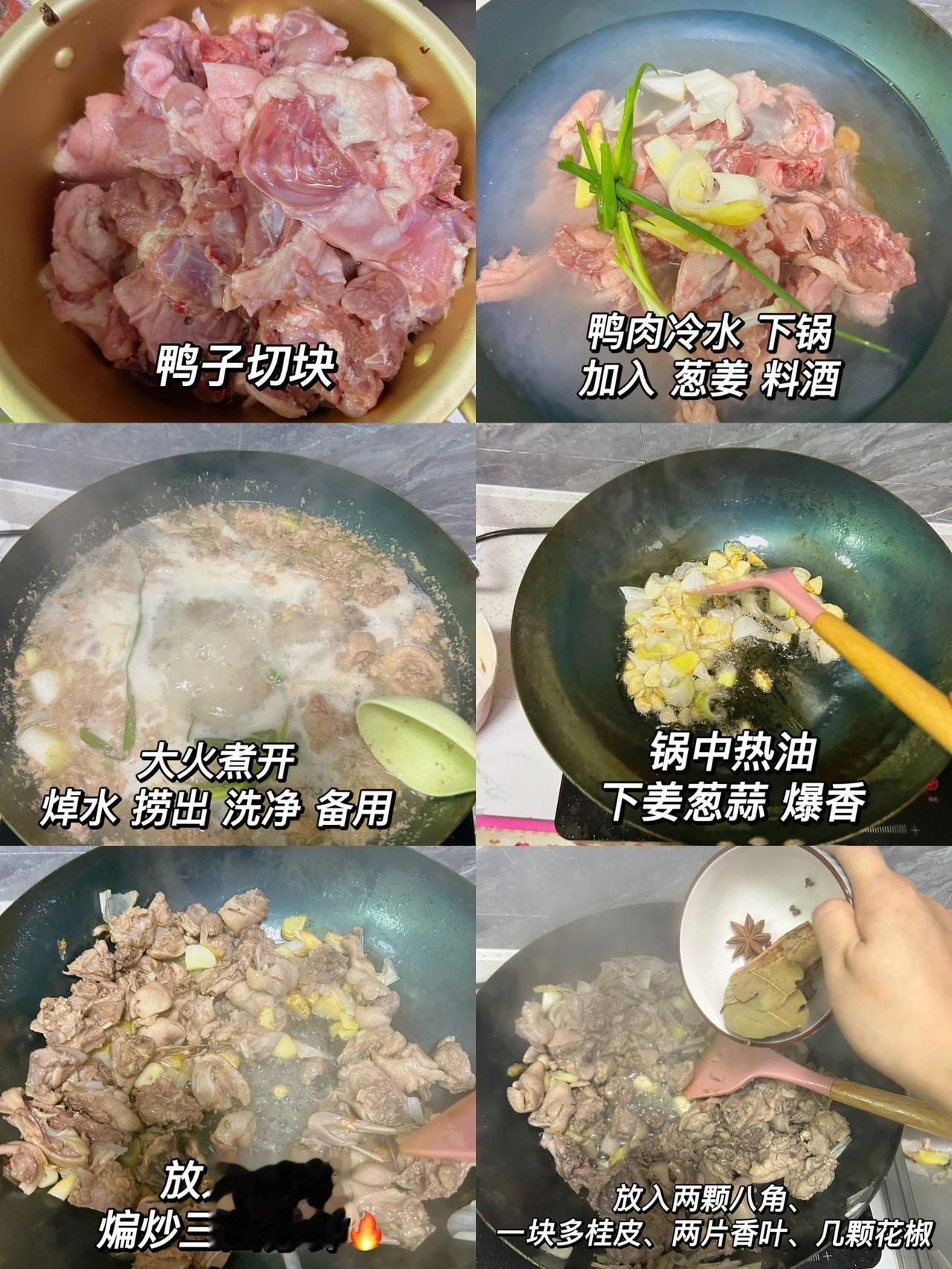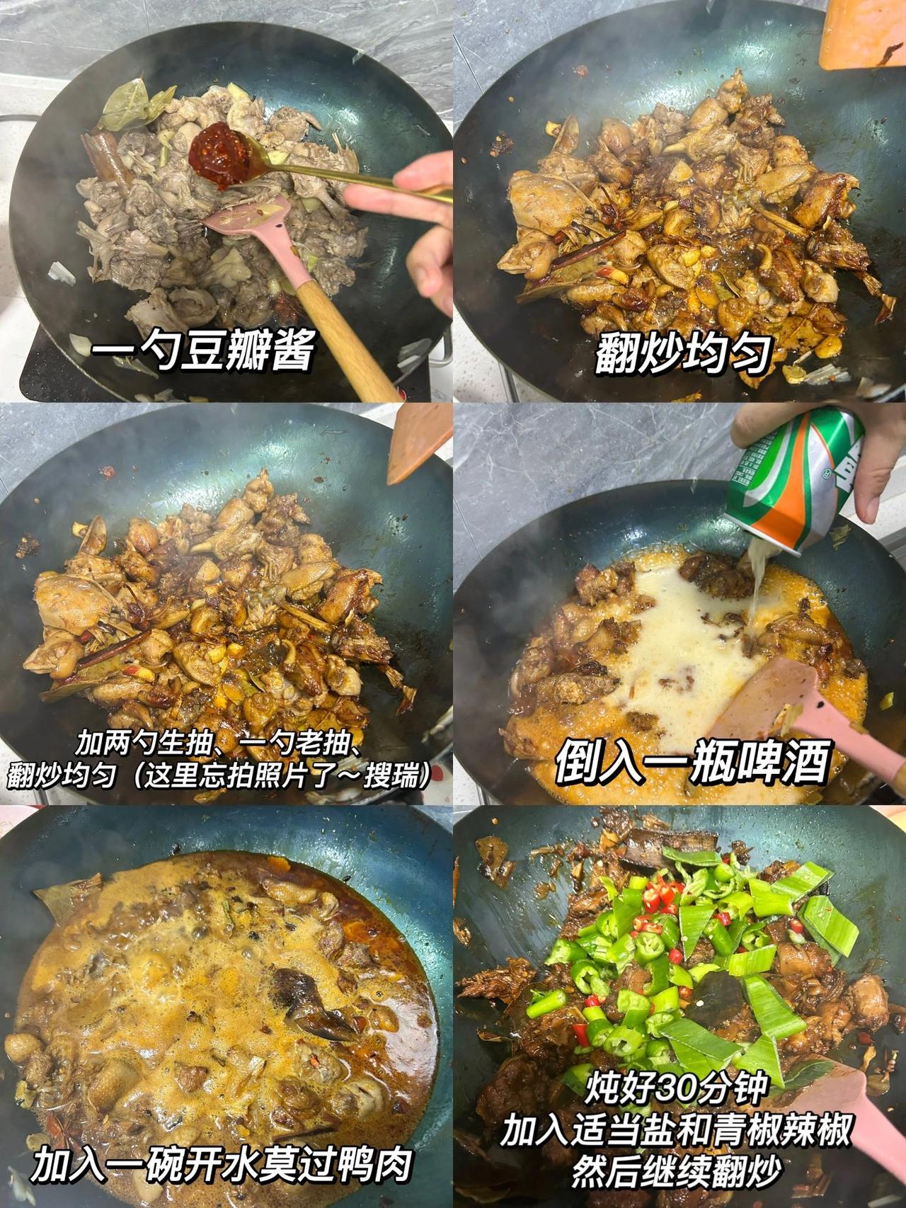 尝试第一次做香辣啤酒鸭,真的巨巨巨好吃 今天尝试做香辣啤酒鸭绝了!狂吃两碗饭 材料:一直鸭子、辣椒、小米椒、啤酒、八角桂皮香叶、豆瓣酱、生姜蒜~ 1、先把鸭子切块 ,然后在锅里放入冷水,把鸭肉倒进去放入葱姜 料酒,用大火煮开,焯水去腥,然后在捞出来,用冷水过一下。 2、锅中热油,放入葱姜蒜炒香,然后把鸭肉放进锅里煸炒三四分钟,然后再放进去两颗八角,一块桂皮,两片香叶。然后继续翻炒~ 3、然后再放入一勺豆瓣酱,翻炒均匀,在放两勺生抽、一勺老抽,继续翻炒均匀。翻炒三四分钟在往里面倒入500ml啤酒,在加入一碗开水莫过鸭肉。 4、大火煮开然后小火炖30分钟,然后在往里面放进适当得盐,在加入小米椒和青椒翻炒。就可以出锅啦~ 第一次尝试哈,但味道真的很香很绝~嘻嘻嘻烙铁们要好好吃饭哦