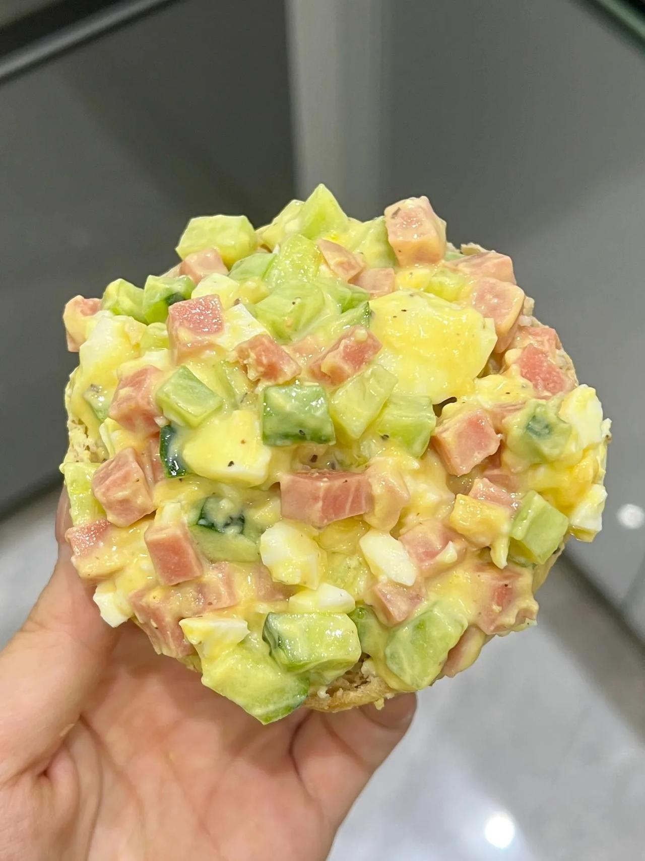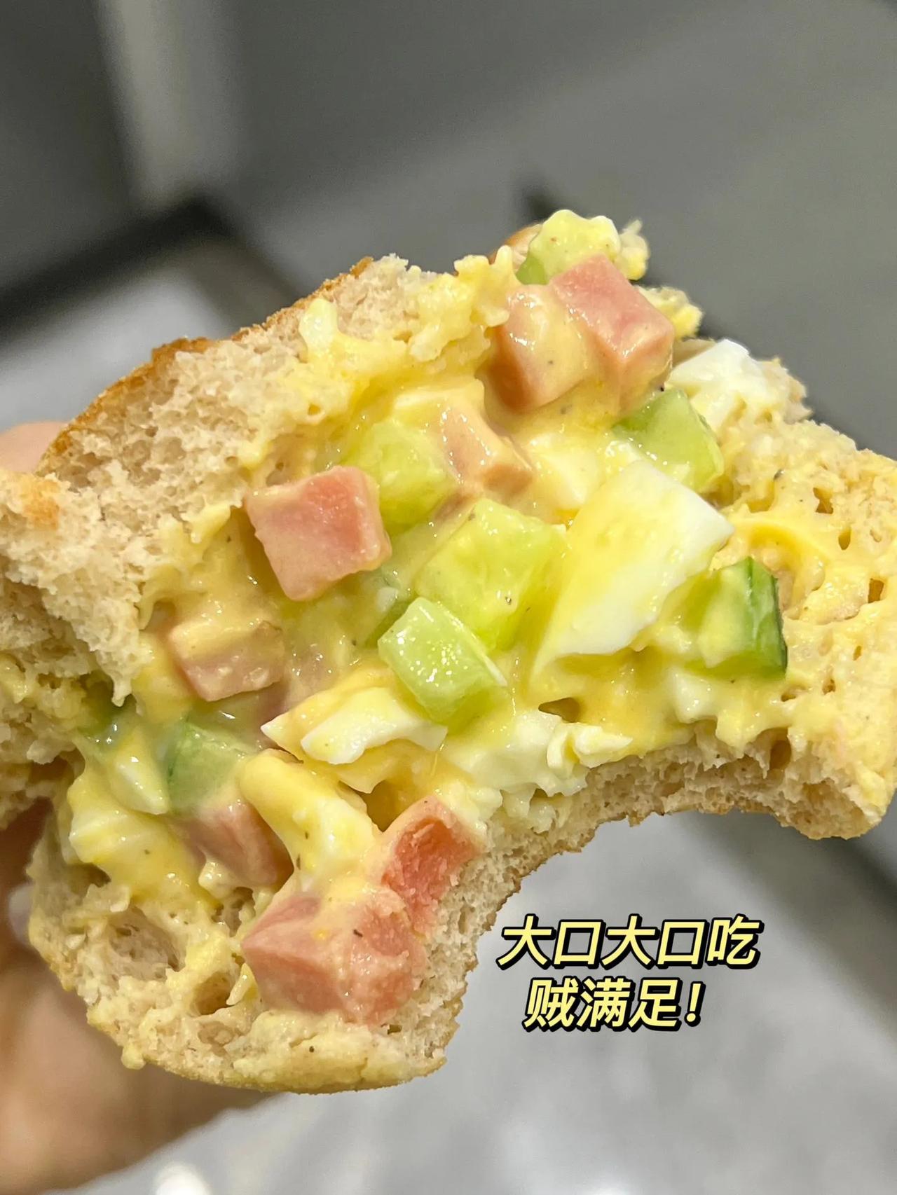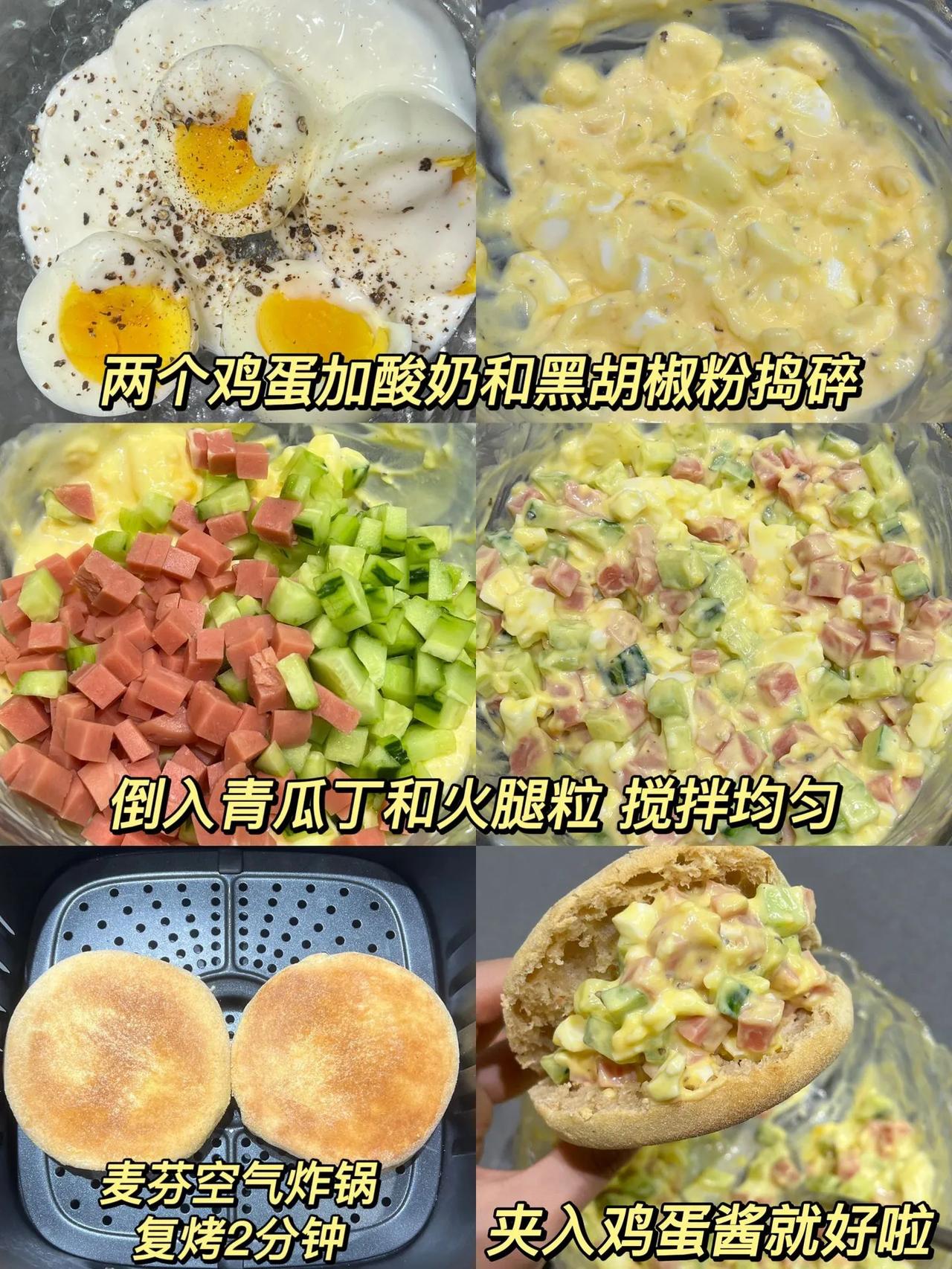 应该很少人吃过这个吧,它让我两周掉了9斤! 减脂期最难了~又要抗饿,又想吃点好吃的~ 这个全麦面包麦芬低热量~满满一口咬下去,减肥的人生,还是有盼头,有满足感的~ 做法: 1、鸡蛋酱:两个鸡蛋加酸奶和黑胡椒粉捣碎; 2、倒入青瓜丁和火腿粒搅拌均匀; 3、麦芬放入空气炸锅复烤2分钟,夹入鸡蛋酱即可。