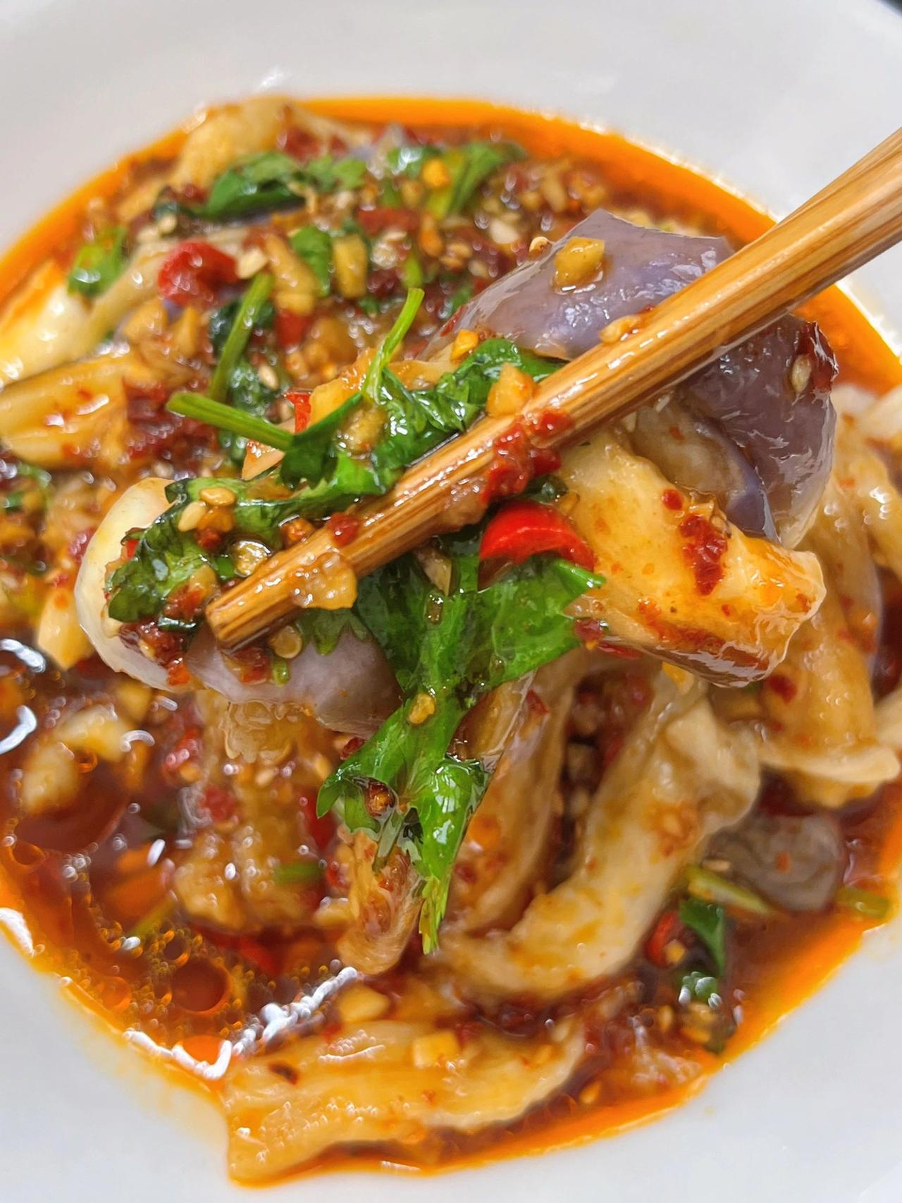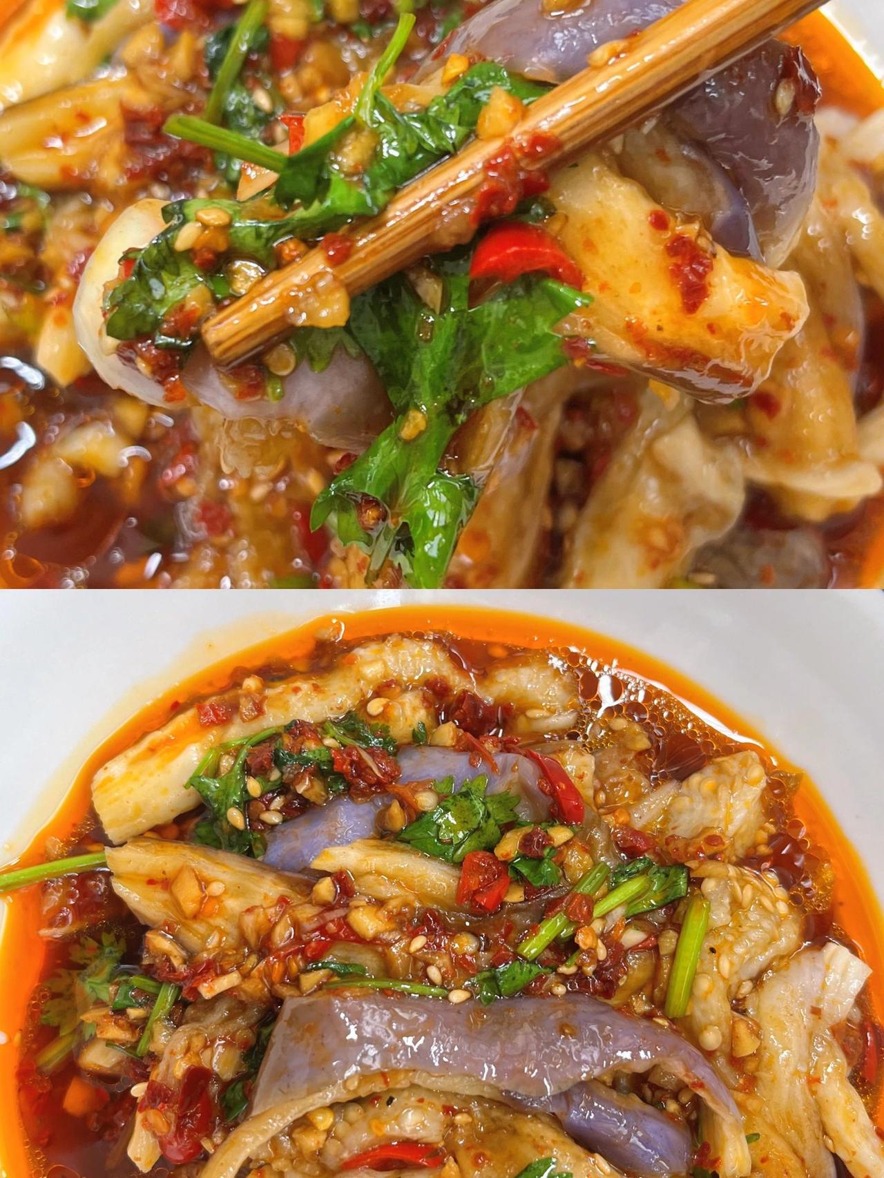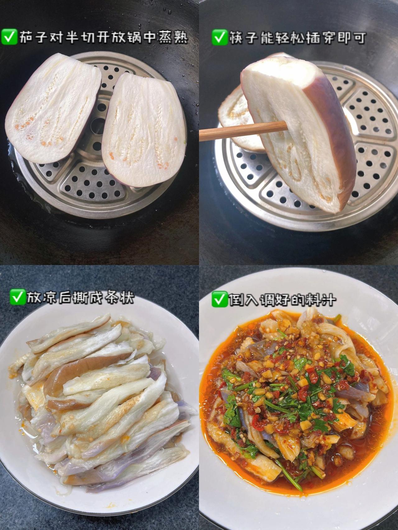 拜托,茄子这样做真的好好吃啊,凉拌茄子 炎炎夏日,凉拌菜才是首选,今天做个酸辣开胃的凉拌手撕茄子,嘎嘎下饭,一定要去试试!! 食材准备:茄子、大蒜、小米辣、香菜(或香葱) 1、茄子对半切开,放入锅中蒸至用筷子能轻松插进去即可,取出放凉后用手撕成大小均匀的条状 2、调个料汁:碗中放蒜末、小米辣、辣椒粉、白芝麻、香菜末,倒入热油激发香味,再➕2勺生抽、2勺陈醋、1勺蚝油、1勺白糖,再加点香菜叶搅拌均匀备用 3、撕成条装的茄子摆入盘中,倒入调好的料汁,搅拌均匀即可开吃啦~ 重点来咯:重点就是没有重点,因为太简单了