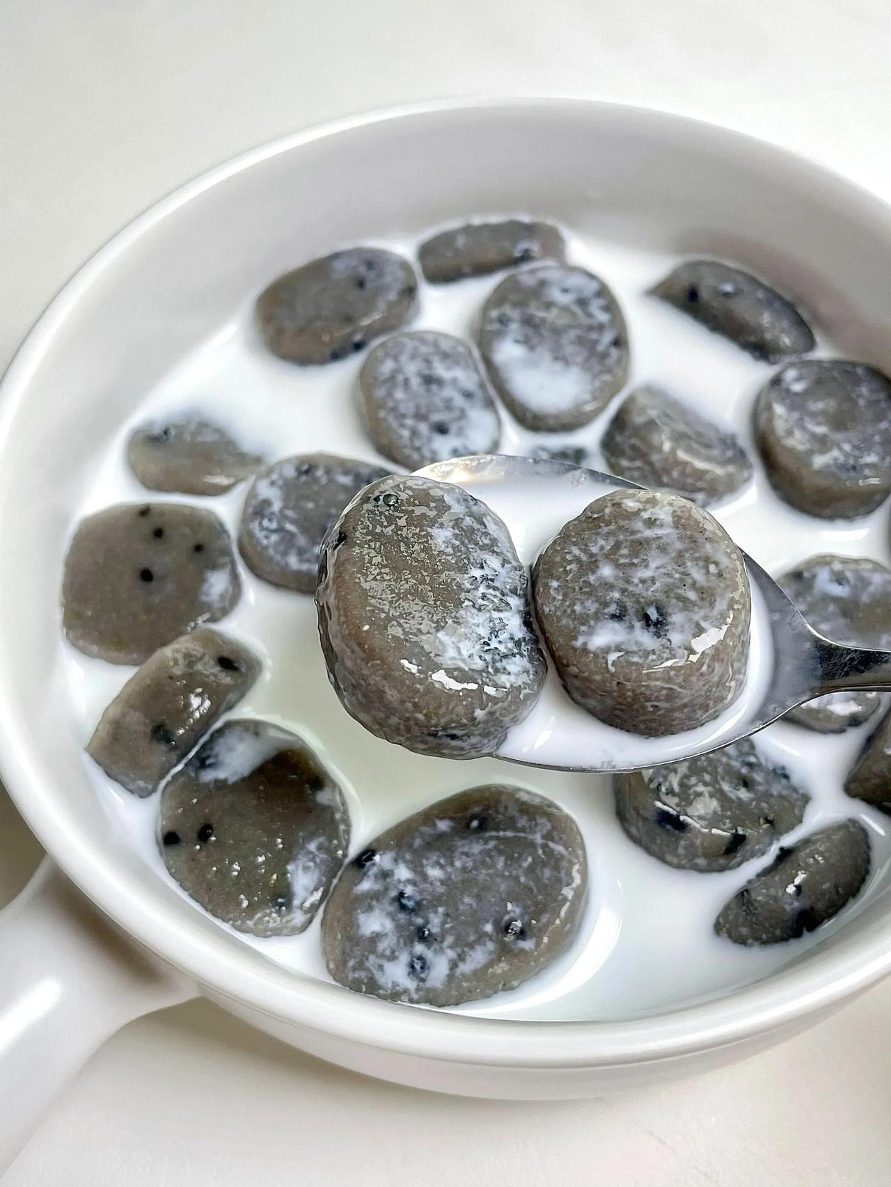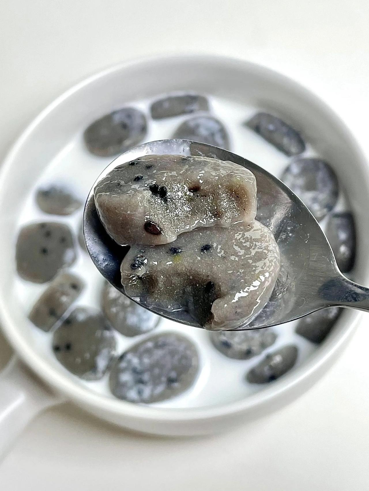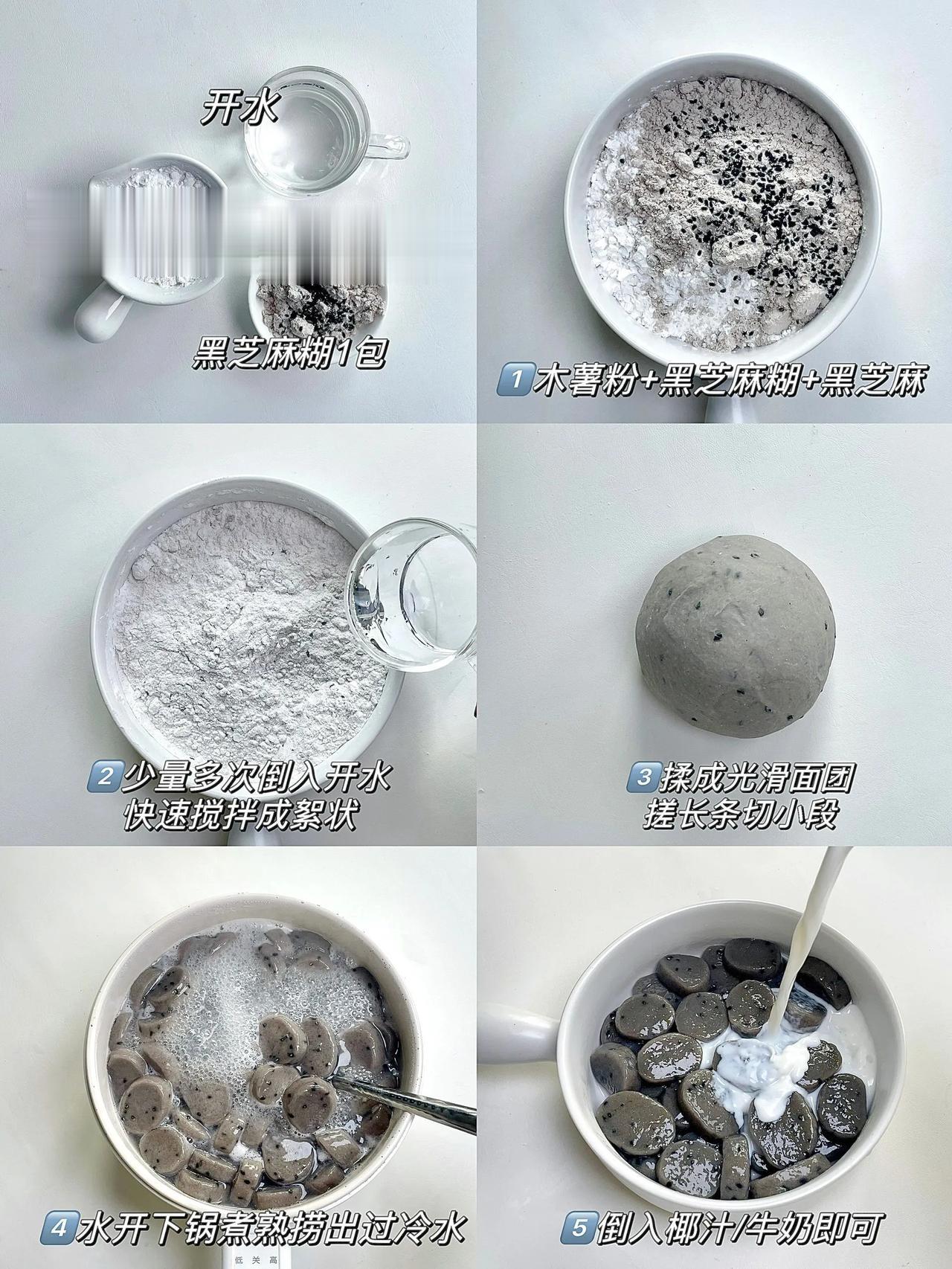 颜值爆表!比珍珠芋圆更好吃的黑芝麻阿达子! 夏季少不了好吃又好喝的甜品,今天就跟大家分享一道夏日必备小甜品~黑芝麻阿达子,软糯Q弹,颜值爆表,比珍珠芋圆更加清甜可口,配上牛奶,奶茶或椰汁,口感超赞,爆炸好吃,做法简单! 做法: 1、木薯粉+黑芝麻糊+黑芝麻,少量多次倒入开水,快速搅拌成絮状,再揉成光滑面团; 2、搓长条切小段; 3、水开下锅煮熟捞出过冷水,倒入椰汁/牛奶即可。