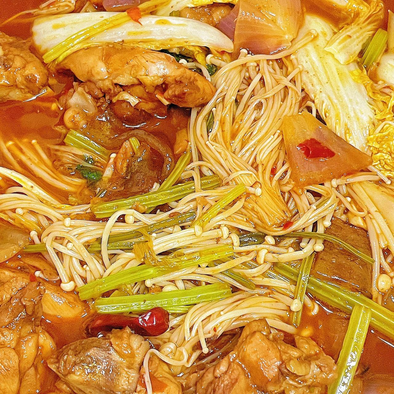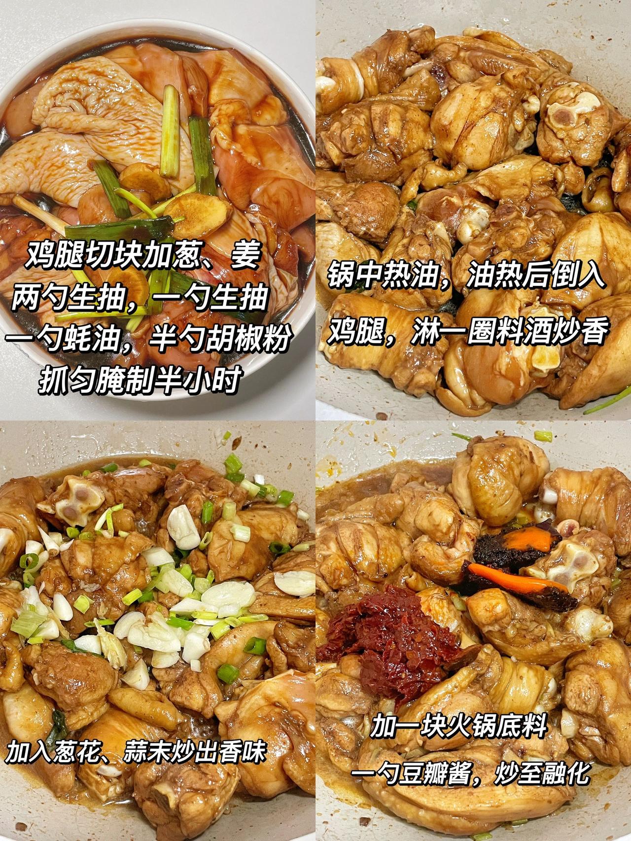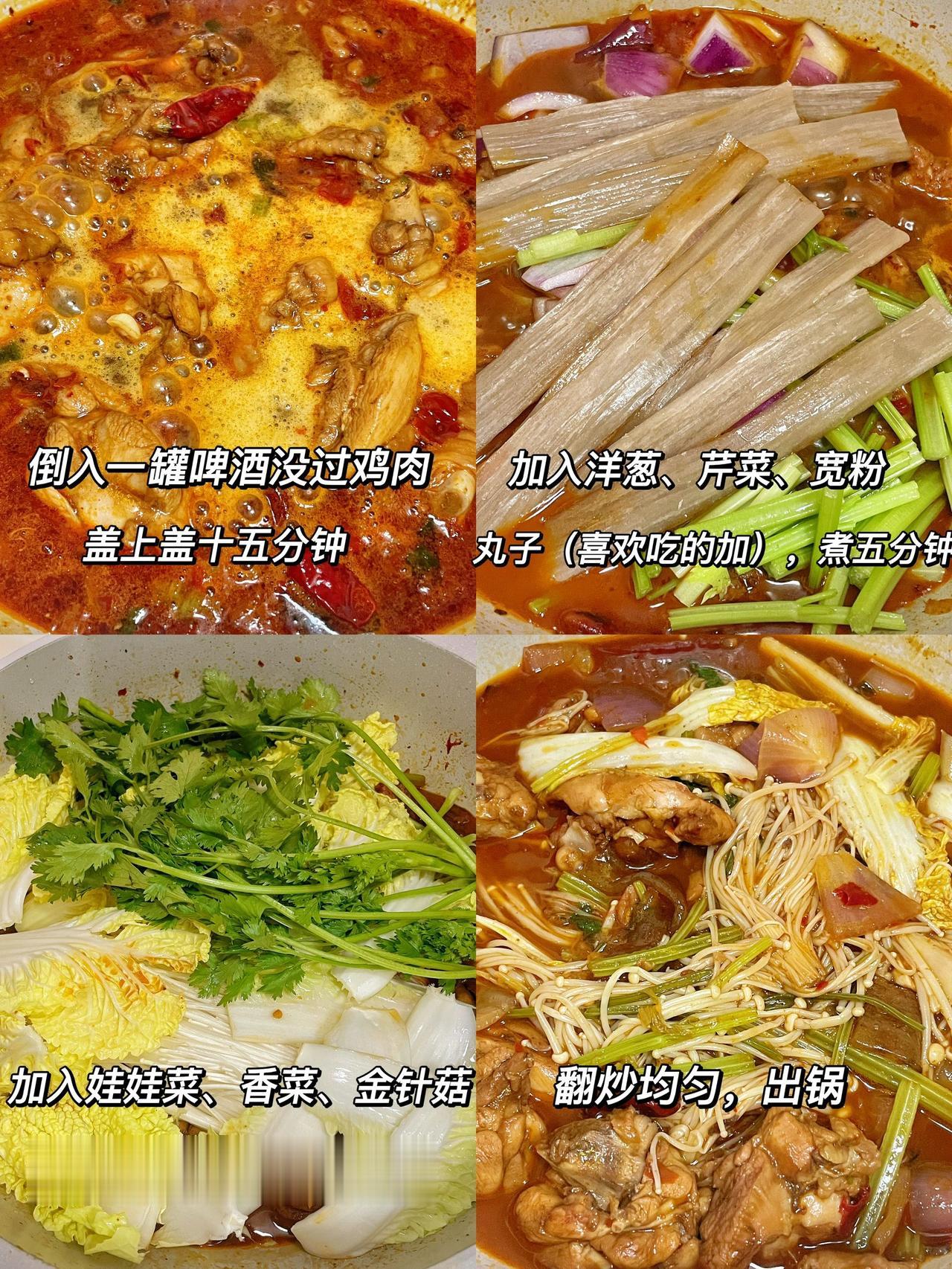 秒杀外卖的鸡公煲做法,肉嫩味足嘎嘎好吃 这个家庭版的鸡公煲真的巨巨巨好吃,肉嫩到秒杀各种外卖,超级过瘾下饭,赶紧来试试吧 注备食材:两斤鸡腿肉,葱,姜,蒜,洋葱,芹菜,宽粉,丸子,青菜(自己喜欢吃的) 1、鸡腿切块洗净后,加入葱姜料酒,两勺生抽,一勺老抽,一勺蚝油,半勺胡椒粉,抓匀腌制半小时 2、锅中热油,油热后倒入鸡腿,淋入一圈料酒,炒出水汽,加入葱、蒜,炒出香味后,放一块火锅底料、一勺豆瓣酱,炒至融化后倒入一罐啤酒没过食材,煮十五分钟 3、倒入宽粉、洋葱、芹菜,爱吃丸子的加丸子,煮五分钟后,倒入娃娃菜、金针菇、香菜等青菜再煮两分钟,翻炒均匀后出锅 煮宽粉时,需要时不时翻炒,避免粘锅,爱吃方便面的,也可加青菜时加方便面一起焖煮两分钟