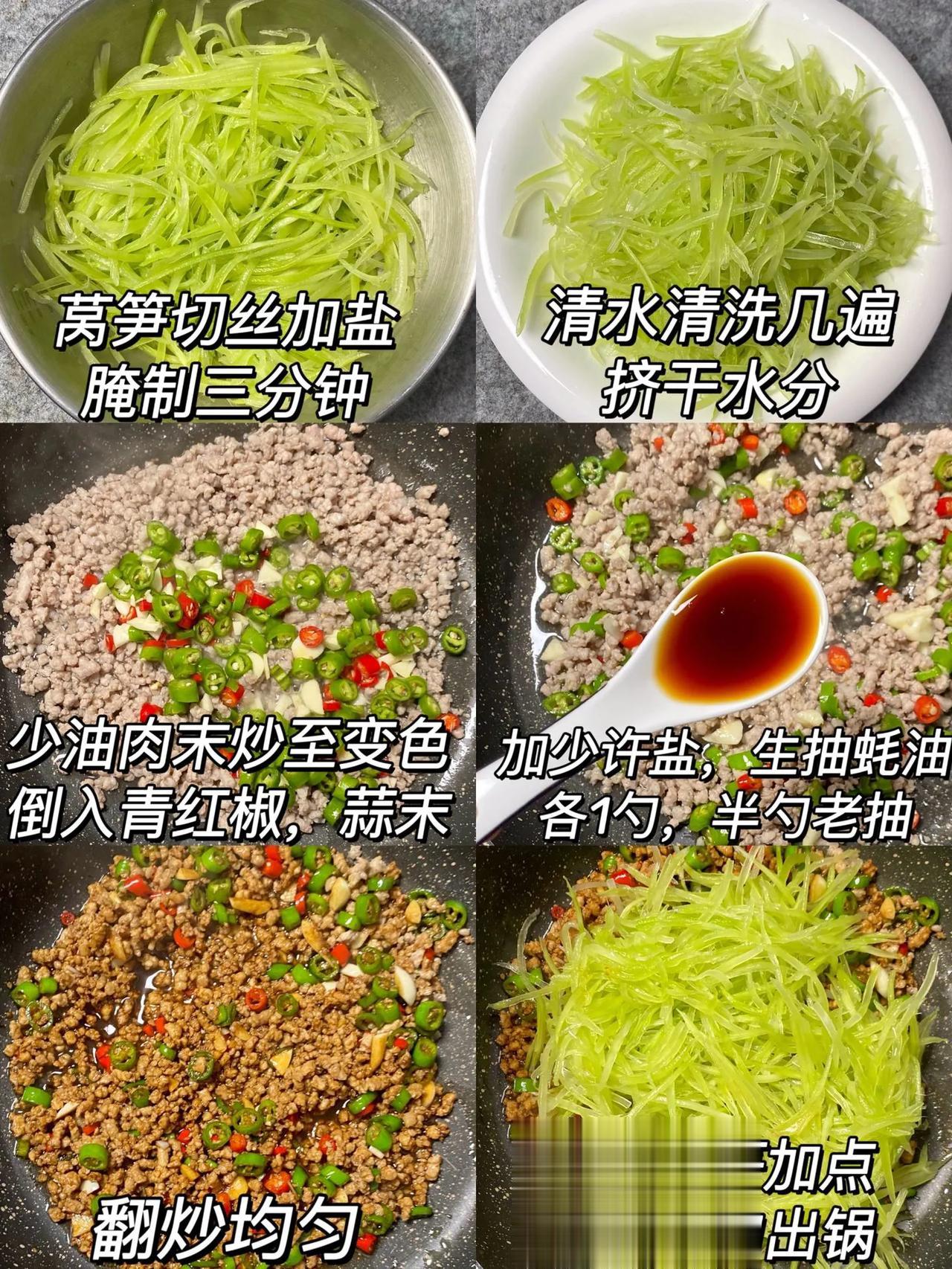 一周吃八次都不腻的莴笋炒肉……真的好吃! 这样做的莴笋炒肉也太好吃了,莴笋清脆,肉片香辣入味,配上米饭简直绝绝子!一个人吃一碟都不是问题,做法还特别简单哦! 做法: 1、莴笋切丝加盐腌制三分钟,用清水清洗几遍,挤干水分; 2、少油下入肉末炒至变色,倒入青红椒,蒜末,加少许盐,生抽,蚝油各1勺,半勺老抽翻炒均匀; 3、倒入莴笋,加点鸡精炒匀即可。