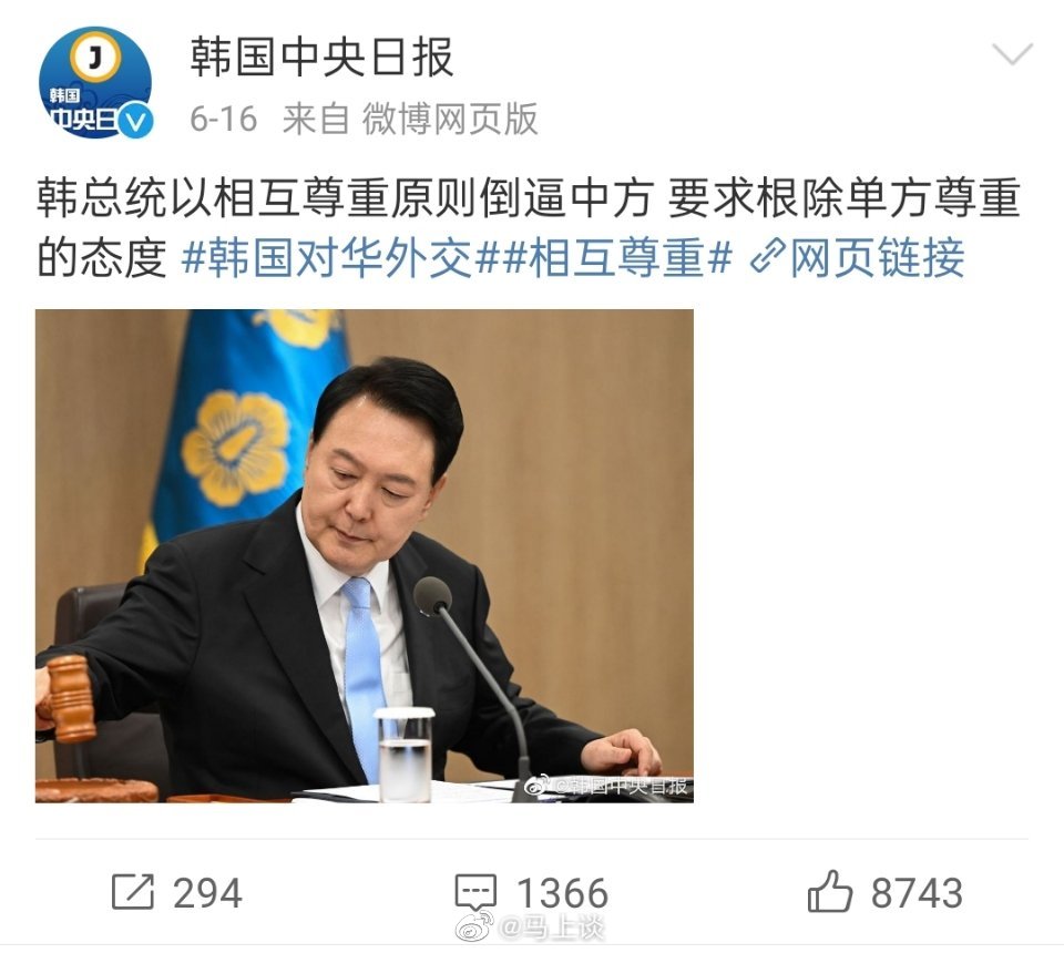 韩国中央日报:“【重启韩国】强强对决只能让中韩两败俱伤” “韩总统以相互尊重原则倒逼中方 要求根除单方尊重的态度”…韩国这家报社是找到流量密码了,以往发博鬼都不理,现在靠挑衅收割一波…[允悲][允悲][允悲]
