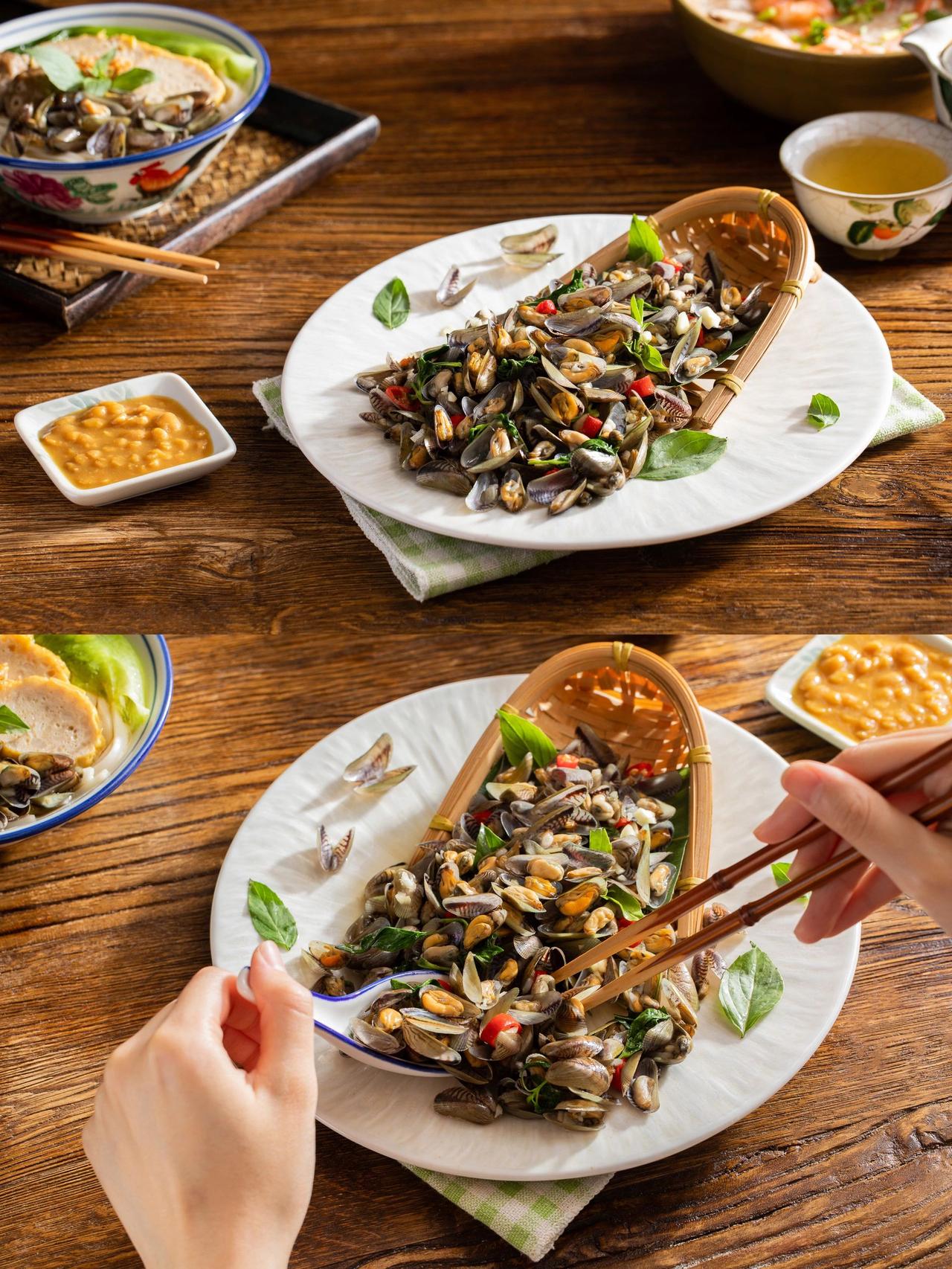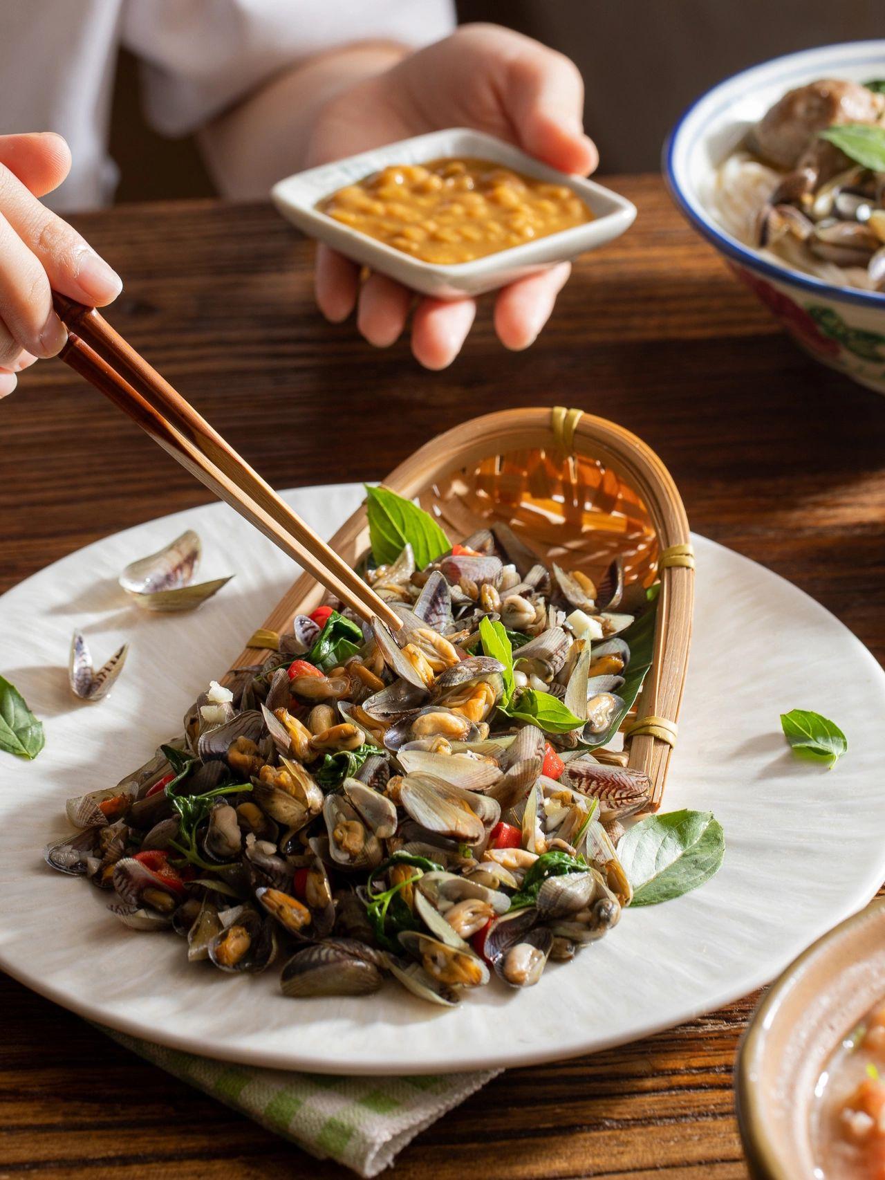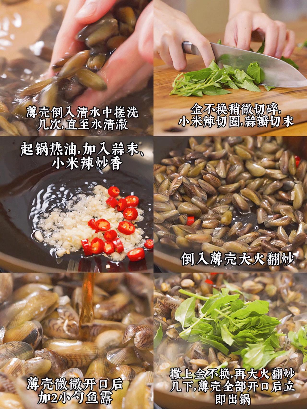 夏天必吃下酒菜一炒鲜香入魂炫不停 一到夏天,潮汕海鲜大排档的招牌下酒菜都会统一换成这道【金不换炒薄壳】 这时的薄壳蕞是肉嫩鲜甜,什么调味都不加就鲜得不可方物! 做法超简单,蒜末小米辣厚油爆香,薄壳和金不换下锅一炒,鱼露一浇就搞定,滋啦作响,香味浓郁得整间屋子都闻得到! 薄壳挂满咸鲜诱人的汤汁,趁热夹起,连肉带汁一同咀嚼,蒜香、鲜甜、辣意交织缠绕,好吃到哇塞 再配着冰爽的啤酒下肚,不知不觉就吃出了一堆薄壳小山,实在是太满足啦 ps.如果买不到薄壳,用花甲、白贝等替代也可以哦! 金不换炒薄壳 做法:1、薄壳倒入清水中搓洗几次,边洗边摘取杂物及破壳,直至水清澈 2、金不换稍微切碎,小米辣切圈,蒜瓣切末 3、起锅热油,加入蒜末、小米辣炒香,倒入薄壳大火翻炒 4、薄壳微微开口后加2小勺鱼露,撒上金不换,再大火翻炒几下,薄壳全部开口后立即出锅