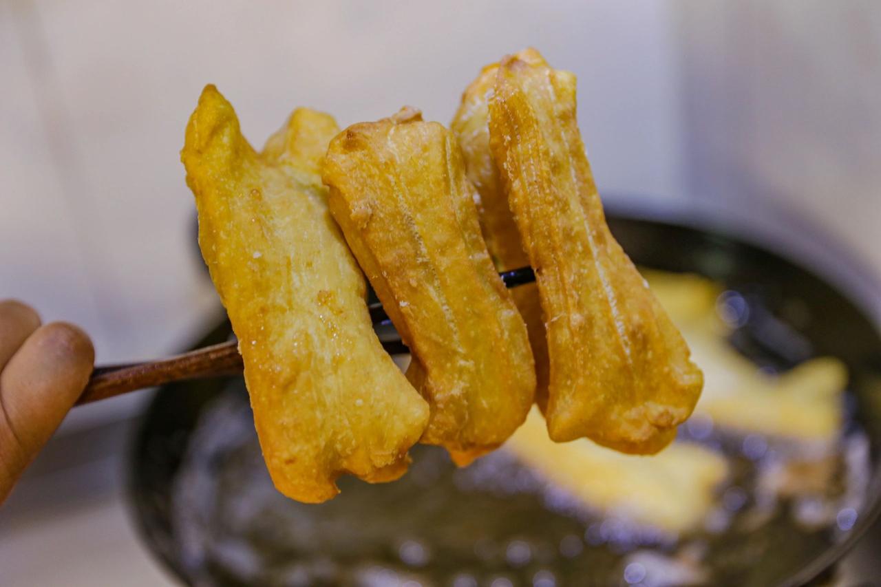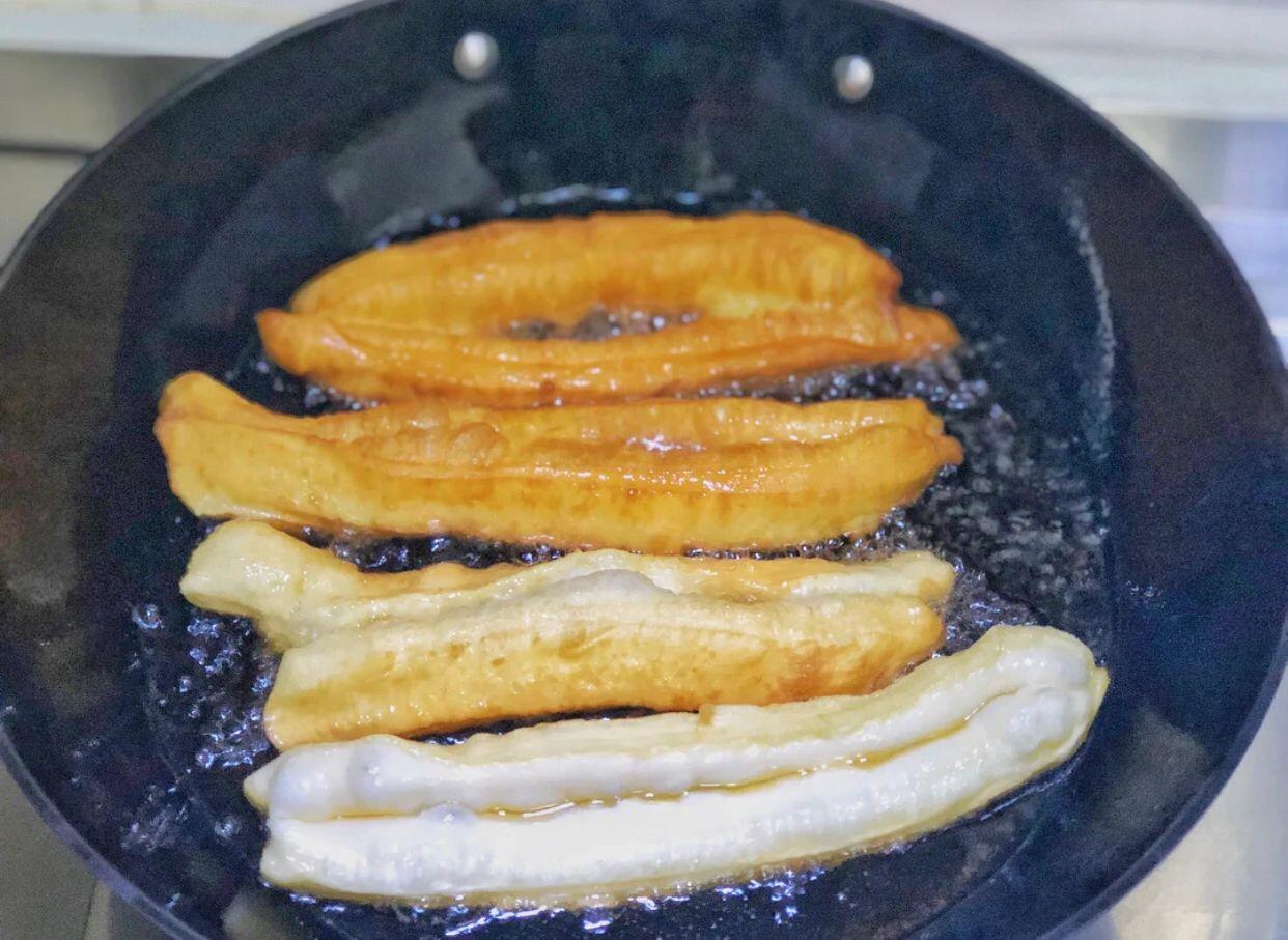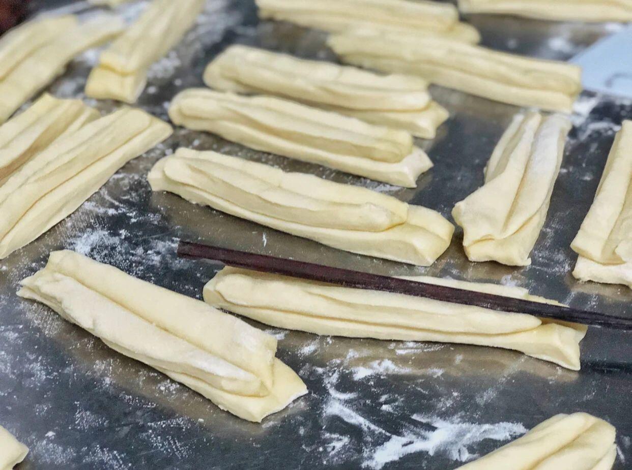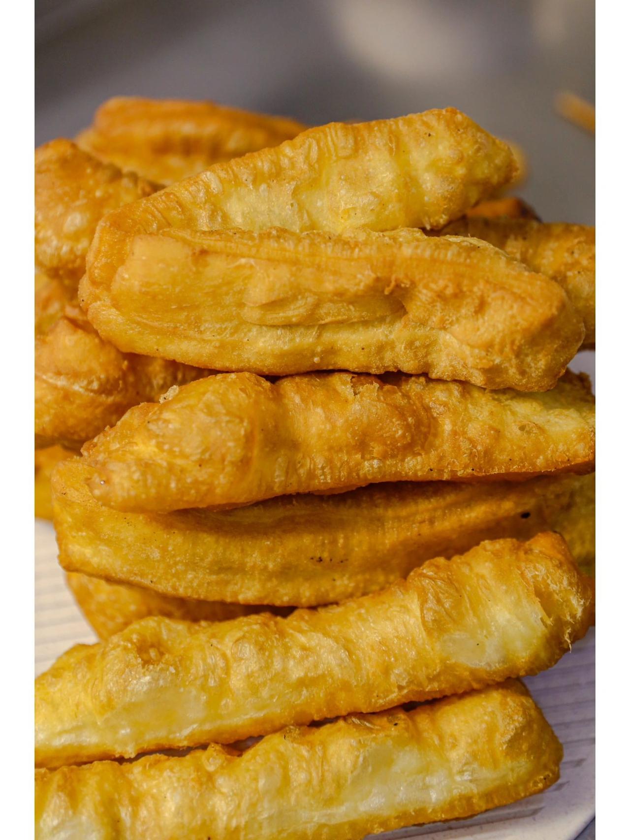 想吃油条不用排队买,妈妈用了几十年的方法 油条,是一种古老的中国式面点,口感松脆有韧劲,中国传统的早点之一,全国各地油条的叫法不一。 从小过端午节或者过年,妈妈总会炸上一些油条,也可能是顺便还是有特别讲究的说法,到目前也没有搞清楚。 现在日常生活都提倡低盐低油,在家炸油条几乎很少。况且炸油条要想做得和外面卖的一模一样,几乎更是难上加难,今天分享给妈妈用了几十年的炸油条方法,保证成品效果比卖的还要好。 当然了,之前妈妈做没有精良克数的,反复试做很多遍,在妈妈的基础上总结出来的,仅供大家参考。 【材料】食用油—15克、面粉—500克、清水—275克、鸡蛋—1个、食盐—8克、小苏打—4克、无铝泡打粉—4克 【制作步骤】1.准备一个容器,先后加入鸡蛋、无铝泡打粉、小苏打、食用油、少量多次加入清水。 2.面粉因全国各地吸水程度都不一样,一定不要一次性全部倒进去。 3.加入食用油的目的,也是为了让面更有延展性,更筋道。 4.清水少量多次倒入,用筷子慢慢搅拌成絮状,然后再用手揉成面团,最后的面团是粘手的状态,这是很正常的。 5.可以在揉面的时候手上抹点食用油,这样边揉面手上边抹油,最后成团的时候面团的表面也倒上一层油封层,保鲜膜盖好,放入冰箱冷藏发酵一个晚上。 6.隔天早上从冰箱拿出来之后放入常温下回温30分钟,不要揉面,案板上撒上一些干面,轻轻边擀边拉成长条状。 7.油条切成宽3厘米左右、厚度1厘米的长条,然后将相对湿的那一面对着放在一起,从中间一分为2,当然如果你的锅足够大和长,也可以不用切。 8.用筷子再从中间按一下,这样炸出来的油条就不会松散。 9.油温升上来大约180度左右下锅炸,下锅的时候一定要把两头捏住,从中间慢慢往两边拉长拉直,下入油锅的时候先别松手,待中间的部分稍微定型松手。 10.炸到金黄色的时候快速翻面,直至另外一面金黄。 11.如果你是第一次操作,一次性不要往锅里放太多,以免手忙脚乱。 又松又脆、又黄又香的油条就制作完成。 金黄酥脆、体大饱满,满口喷香。 炸油条一定要选择没有太多味道的食用油。