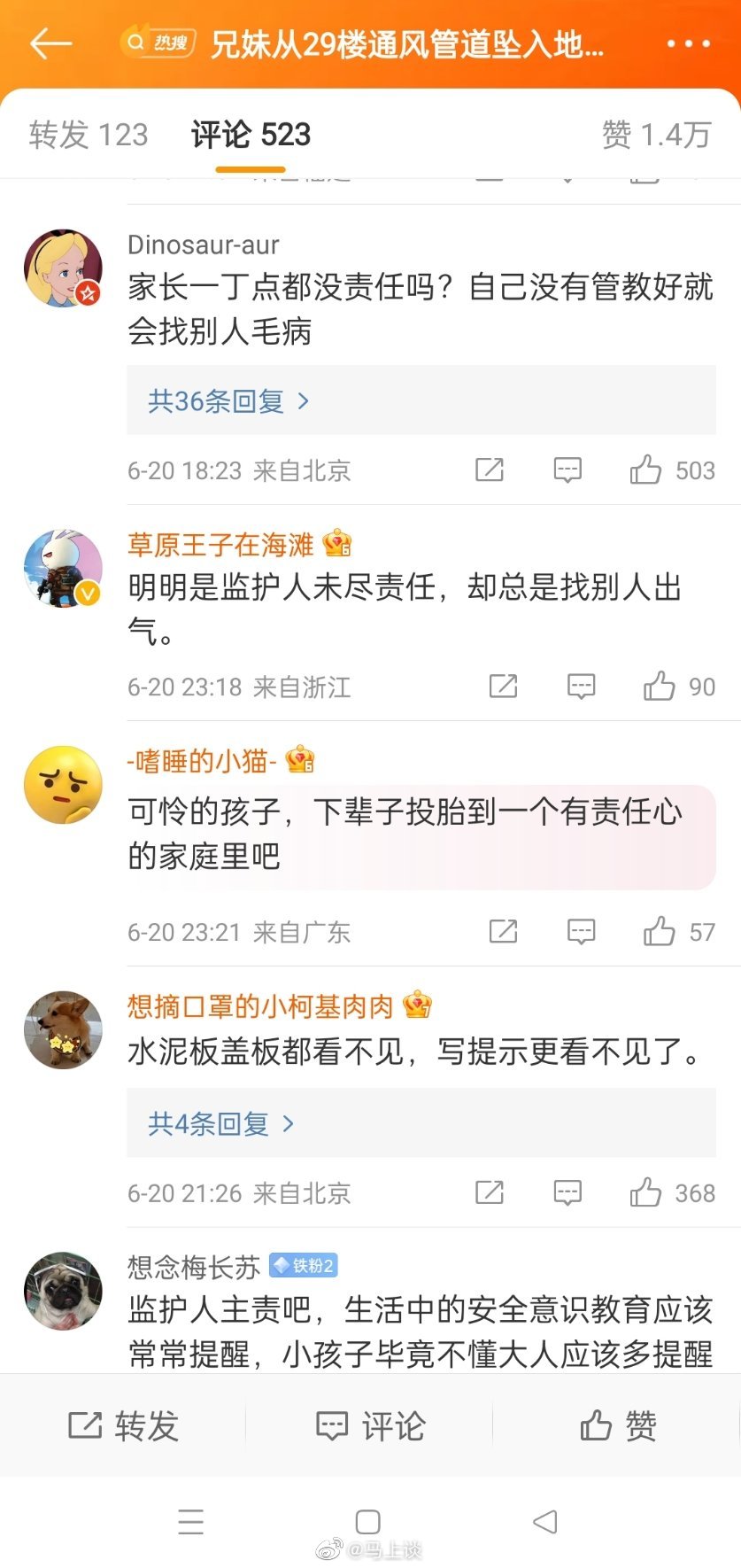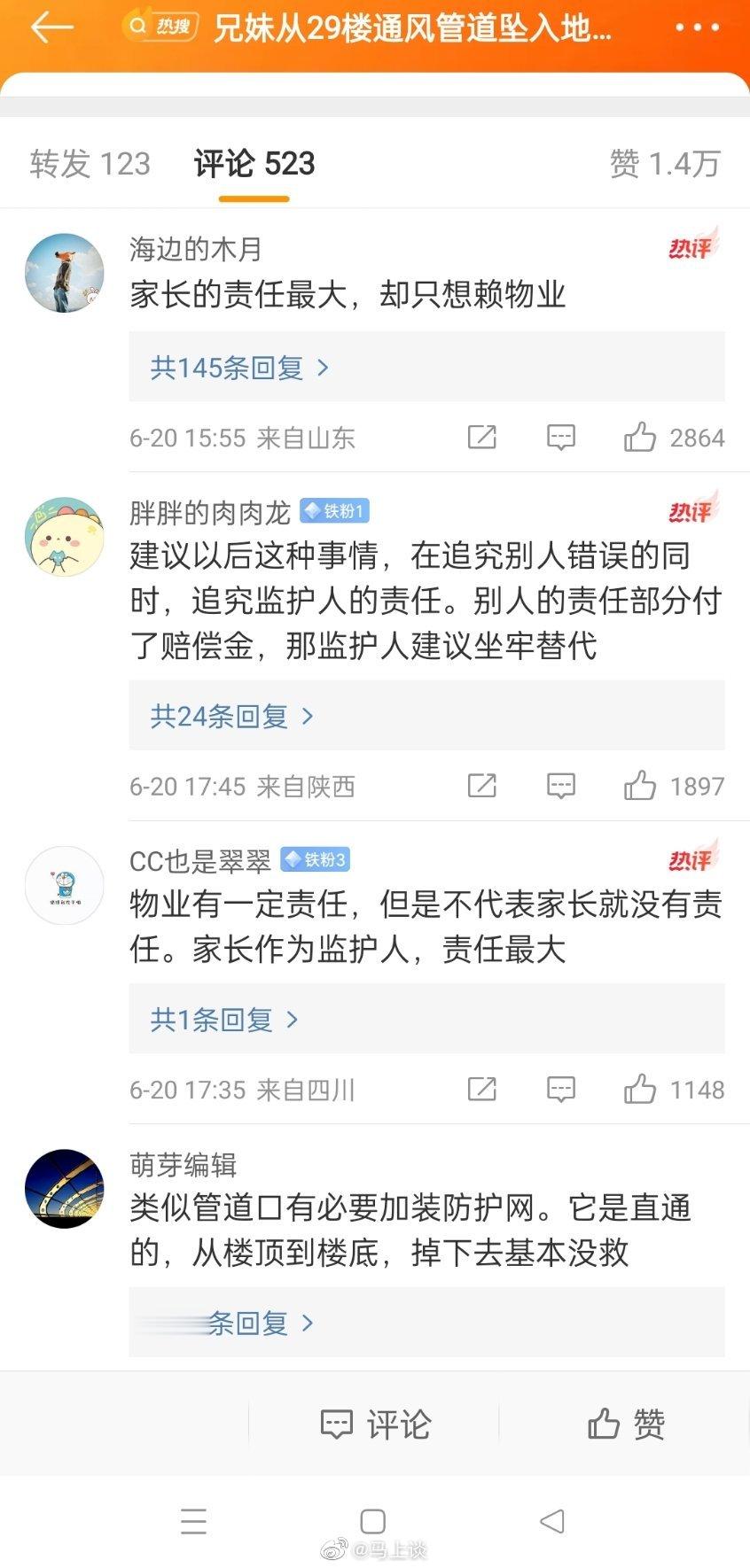 #兄妹从29楼通风管道坠入地下室身亡#真的疯了…置顶贴下一堆人批判家长,说家长主责,说家长要坐牢,更有甚者 没准儿俩孩子当时还蹦三蹦。你们是疯了吗?家长正处在丧子之痛,你们还有没有人性?