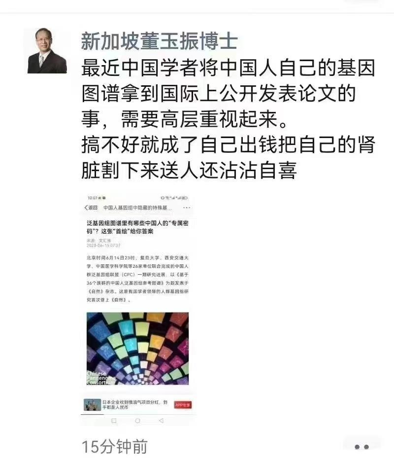 关键是我们老百姓也知道,但是他们也是中国人,他们也是这个基因图谱,难道他们有办法改变他们的基因序列?如果被外国人制成基因武器,所有中国人都跑不掉,包括他们这就不可理喻了,这个明显是拉着大家一起垫背的做法,他们就没有后代吗?