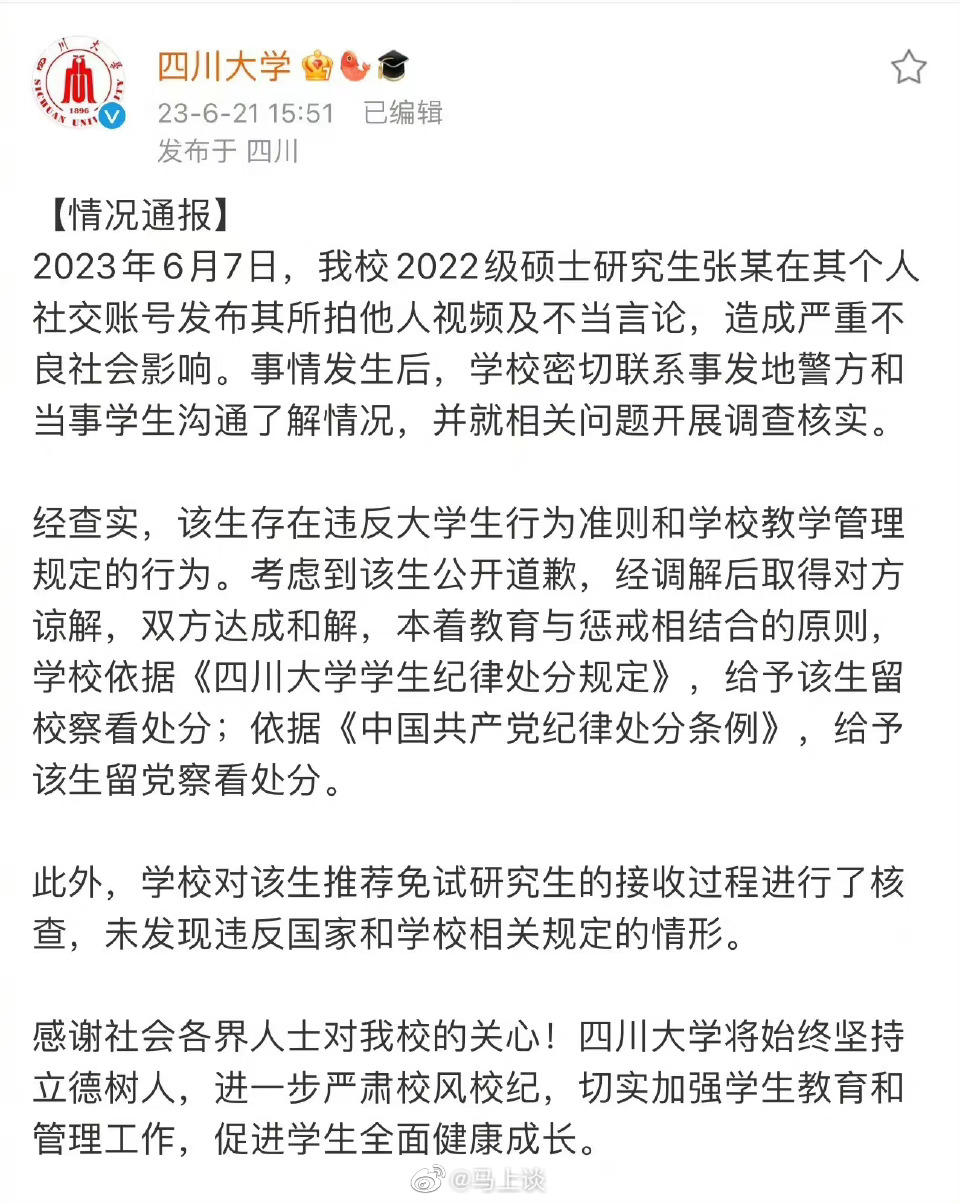 #官方通报网传大学生涉嫌卖淫800次#“将搜索到的文章标题利用某软件自动生成一篇虚假文章”…哈哈哈这是用了chatgpt吗?[笑cry]另外,#川大通报地铁事件涉事学生处理结果#只是留校留党察看,同样是造谣,为啥她这事不用警方介入?[二哈]