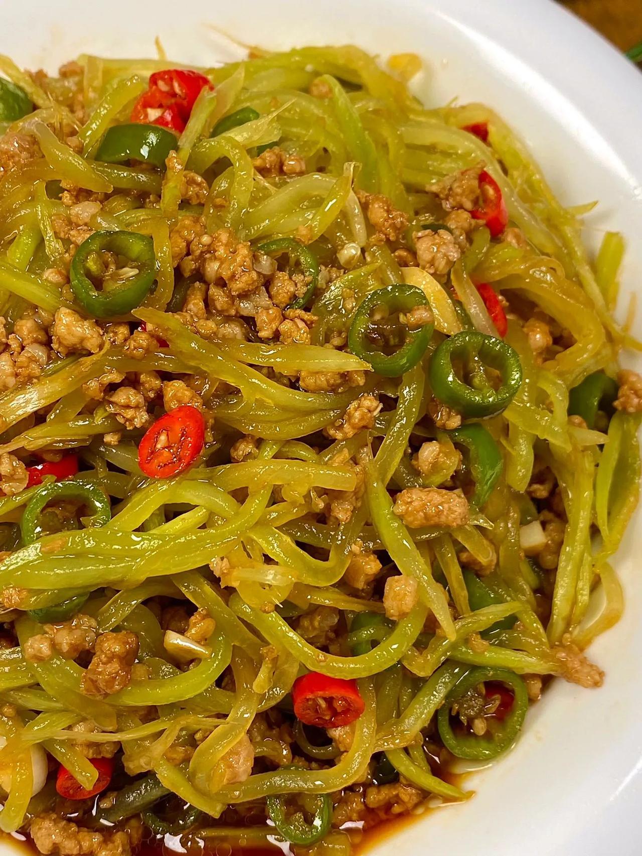 肉沫炒莴笋,手残都会! 这个莴笋的炒法真的是太简单了!分享给集美们! 做法: 1、莴笋切丝加盐腌制三分钟,再用清水清洗几遍,挤干水分; 2、锅中少油肉末炒至变色,倒入青红椒,蒜末,加少许盐,一勺生抽、一勺蚝油、半勺老抽翻炒均匀; 3、倒入莴笋加点鸡精炒匀即可。