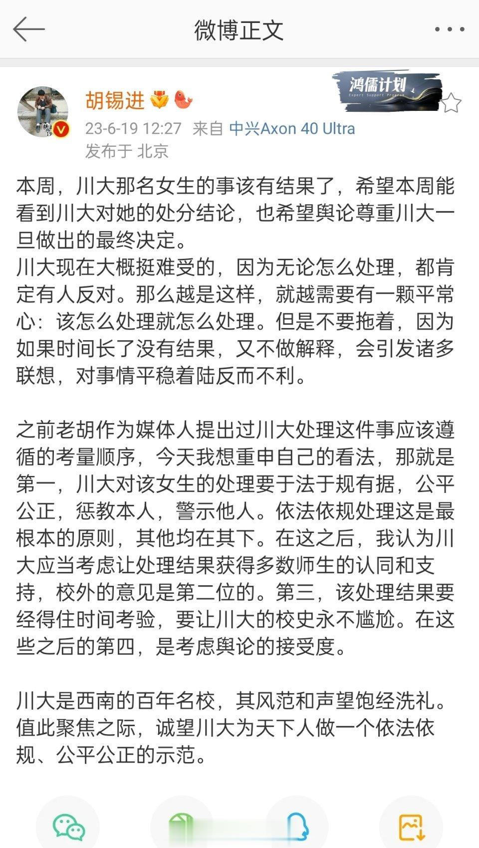 #胡锡进称川大女生应感恩学校给机会#老胡是不是6月19日也得到了消息,所以才会出