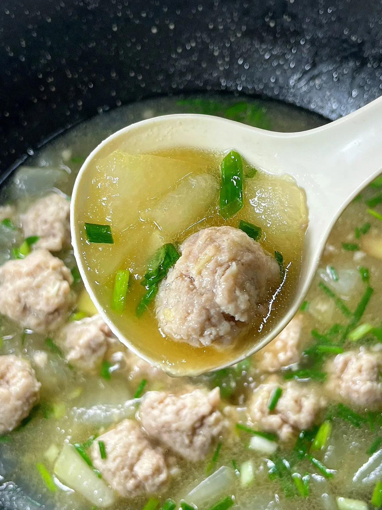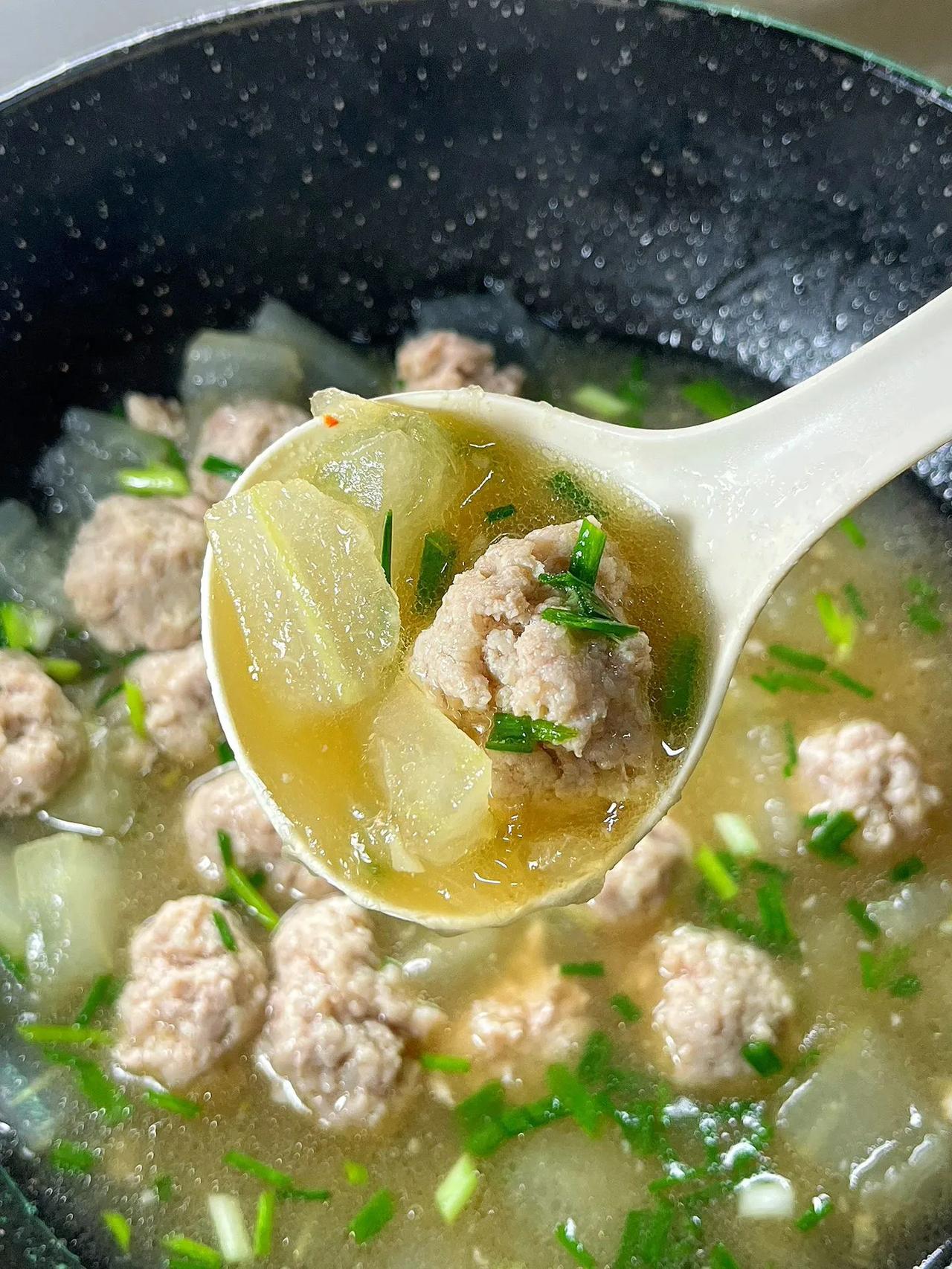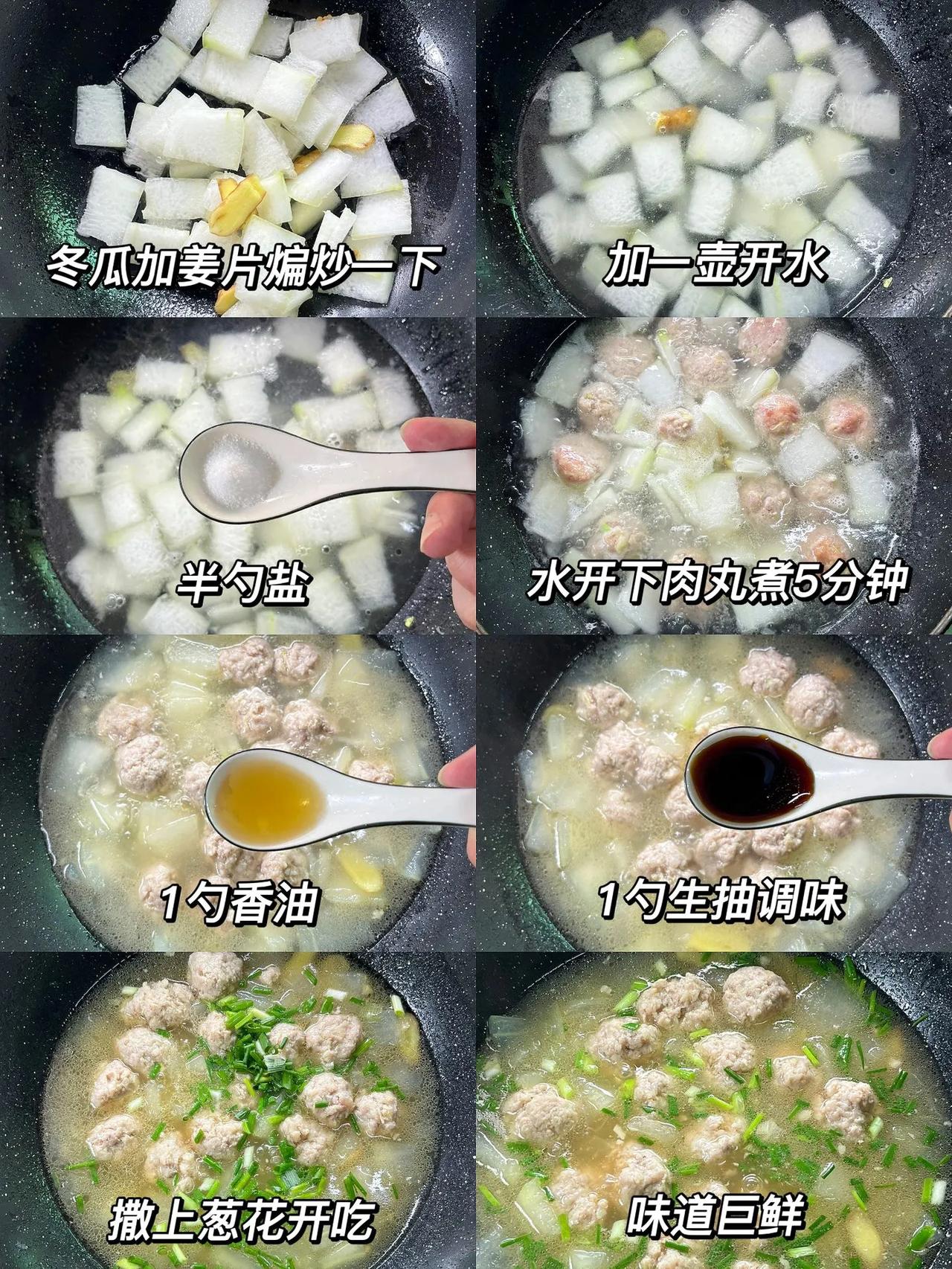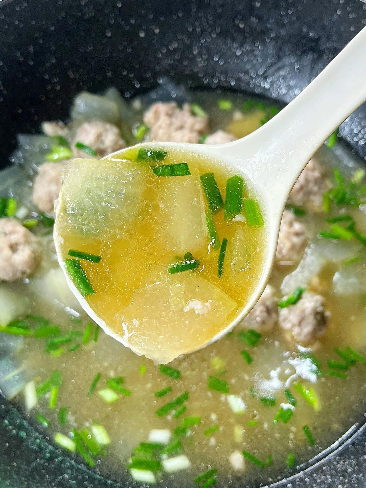 汤鲜味美!巨好喝的冬瓜肉丸汤教程来咯! 今天给大家分享一道营养又美味的冬瓜肉丸汤!冬瓜清甜,丸子软嫩入味,汤的味道非常鲜美是一家老小都爱喝的汤做法简单,快来试试吧~ 做法: 1、猪肉馅倒入葱姜、大蒜水、1勺生抽、1勺蚝油、1勺香油、少许盐、1勺淀粉搅匀备用; 2、冬瓜加姜片煸炒一下,加一壶开水,放入半勺盐; 3、水开下肉丸煮5分钟,放入1勺香油、1勺生抽调味,出锅前撒上葱花即可。