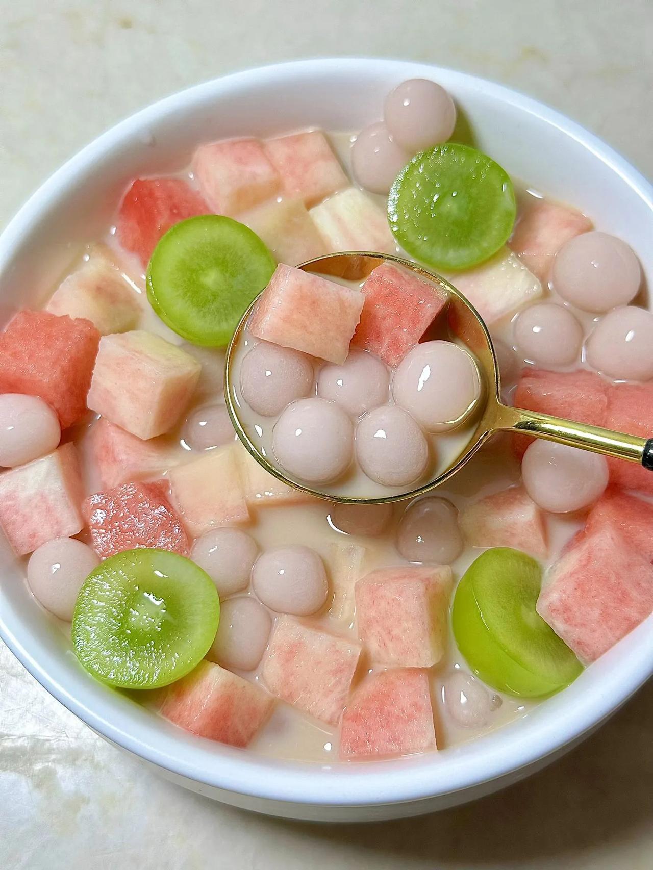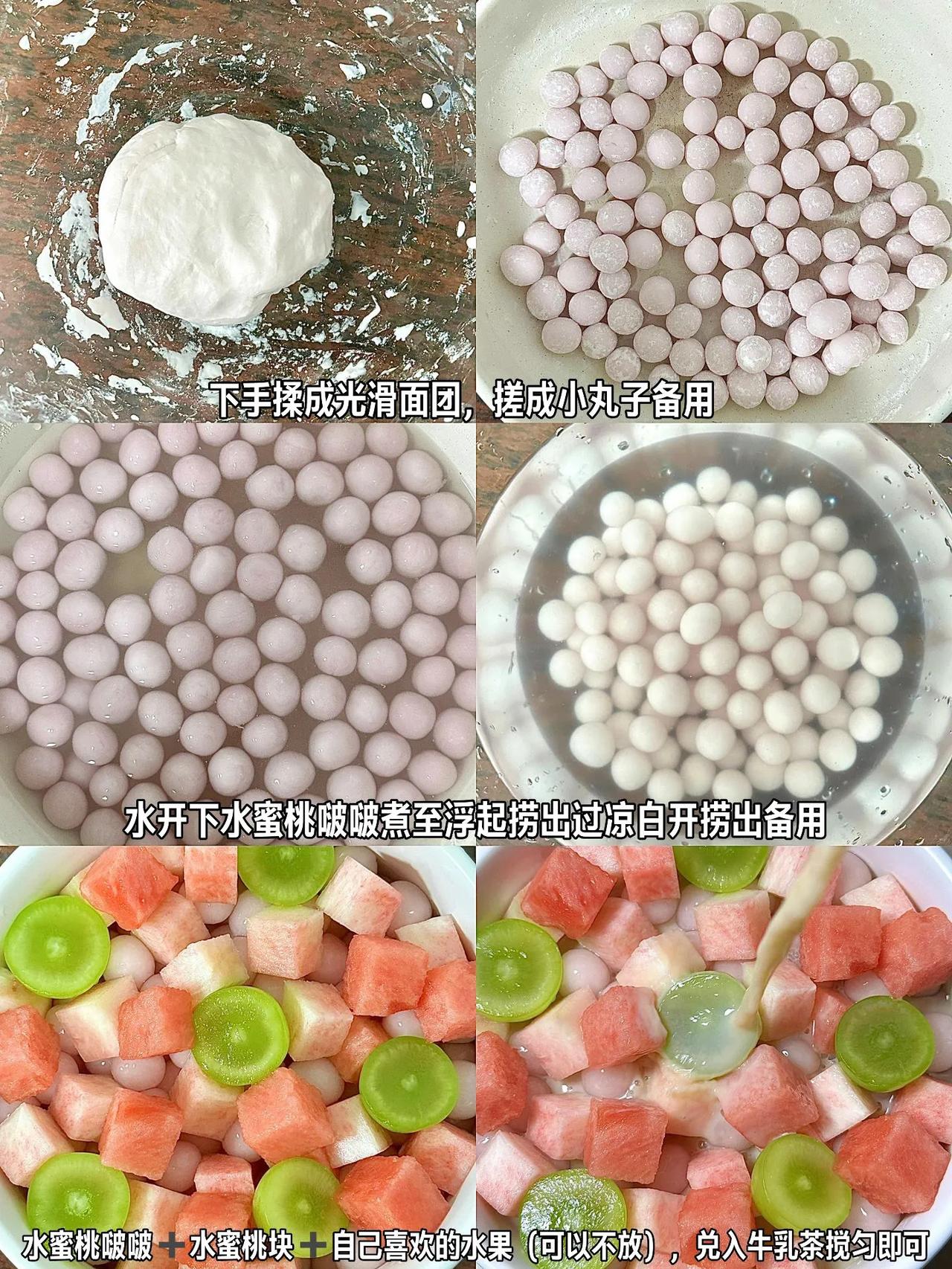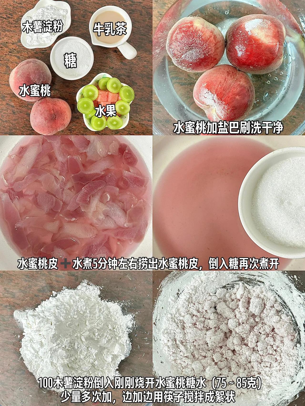 真的无法拒绝粉粉嫩嫩还好喝的饮品! 不喜欢喝咖啡的姐妹们看看这款水蜜桃啵啵牛乳,蜜桃酱的甜提升了牛乳的丝滑度,将仅存的一丝丝不易感觉到的涩都中和掉了!一点都不甜腻!喝进去的时候还有啵啵的韧劲和蜜桃的脆嫩 怎么说呢,嗯~怎么不好喝呢。 做法: 1、水蜜桃加盐巴刷洗干净; 2、水蜜桃皮+水煮5分钟左右捞出水蜜桃皮,倒入糖再次煮开; 3、100g木薯淀粉倒入刚刚烧开水蜜桃糖水(75~85克)少量多次加,边加边用筷子搅拌成絮状; 4、下手揉成光滑面团,搓成小丸子备用; 5、水开下水蜜桃啵啵煮至浮起捞出过凉白开捞出备用; 6、水蜜桃啵啵+水蜜桃块+自己喜欢的水果(可以不放),兑入牛乳茶搅匀即可。