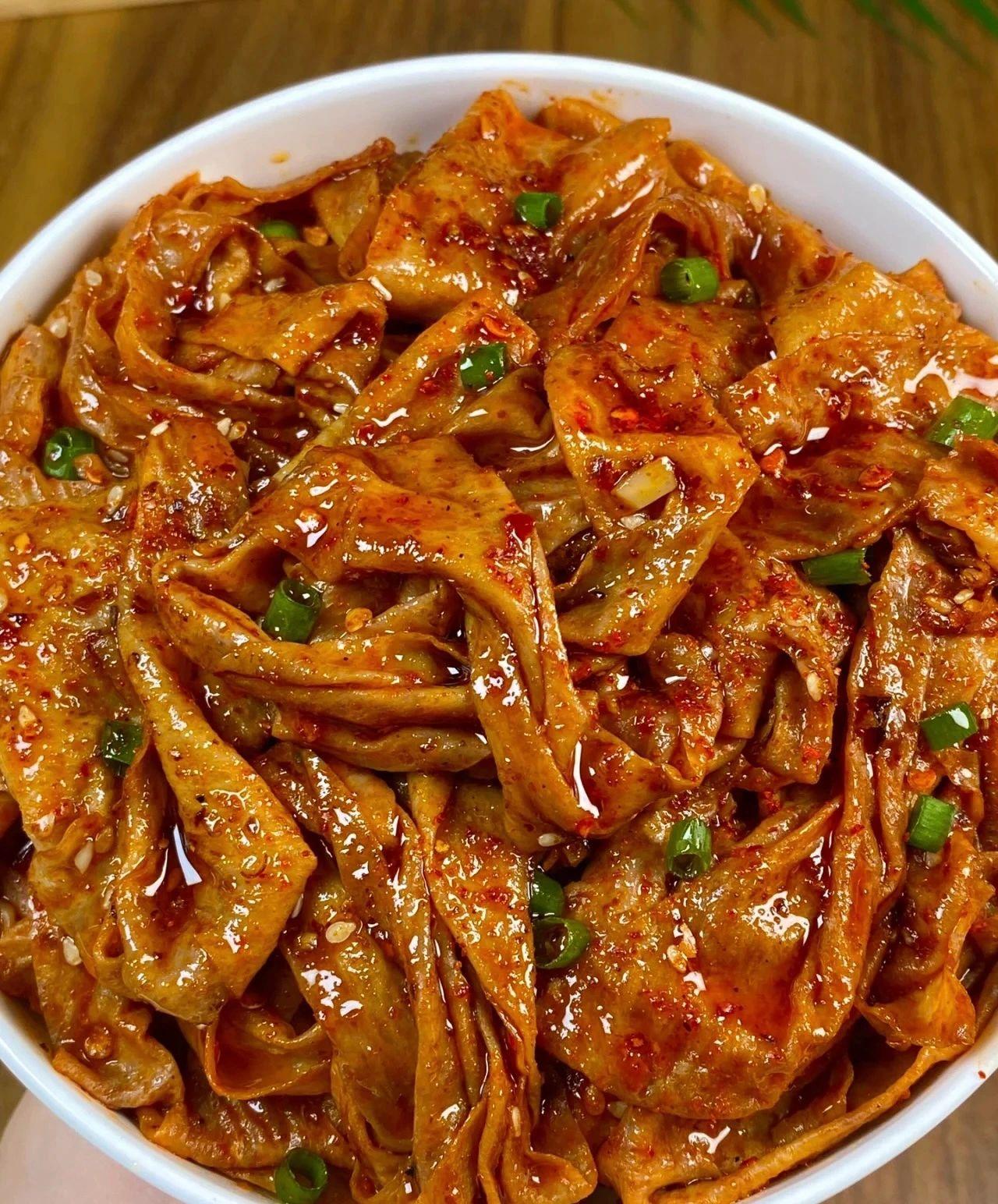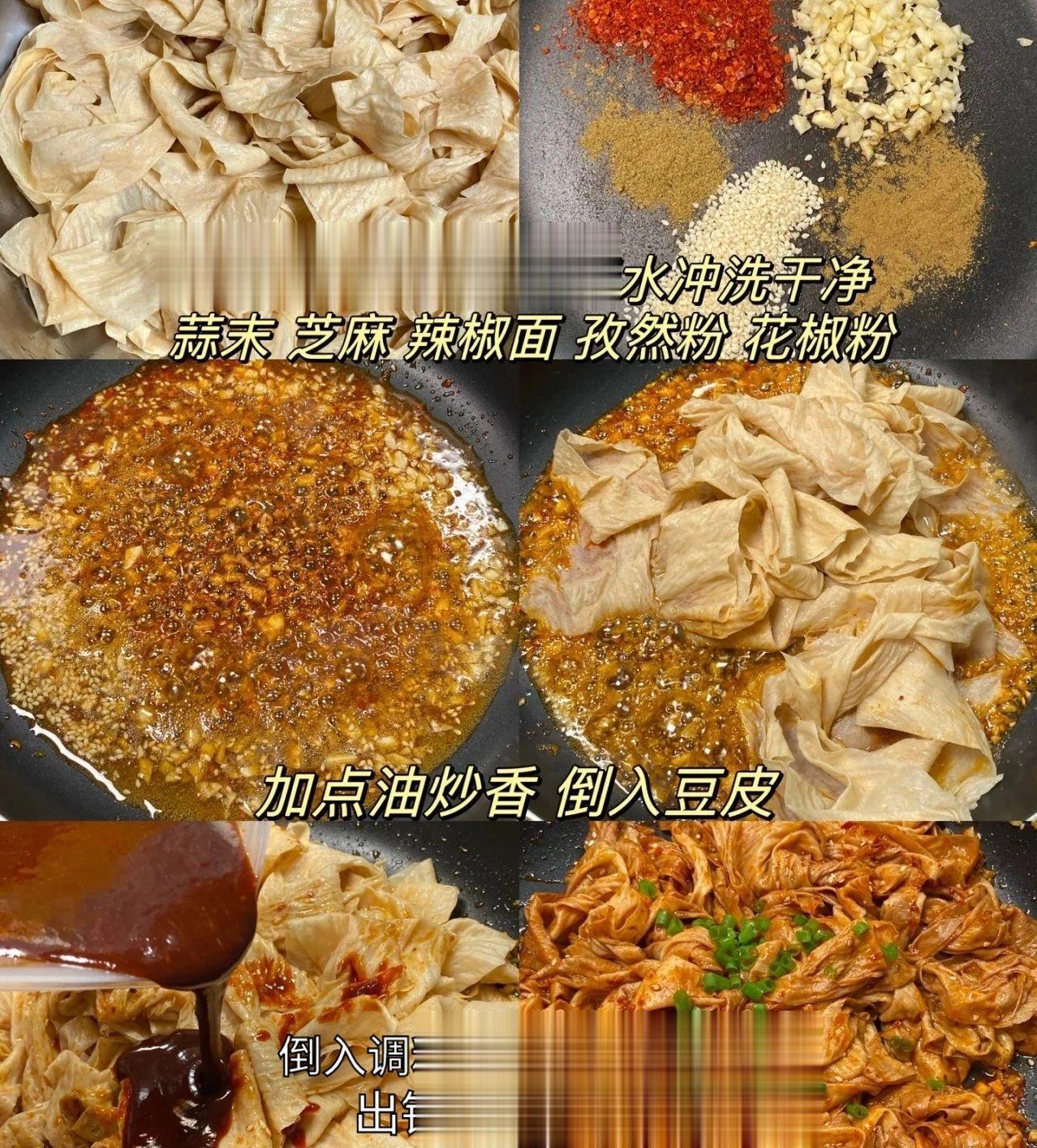 香哭了!这道香辣豆皮真的泰泰泰好吃啦!!豆皮裹满料汁,香辣过瘾!拌米饭味道也泰香了!好吃到停不下来!!上桌秒光~ 做法简单 一定要试试~ 食材:豆皮、葱花 调料汁:2勺生抽、1勺蚝油、半勺老抽、适量鸡精、适量白糖搅匀 做法:1、豆皮温水泡软,再用清水冲洗干净 2、蒜末、芝麻、辣椒面、孜然粉、花椒面 加点油炒香,倒入豆皮 3、倒入调料汁,小火翻炒均匀,出锅前撒上葱花即可
