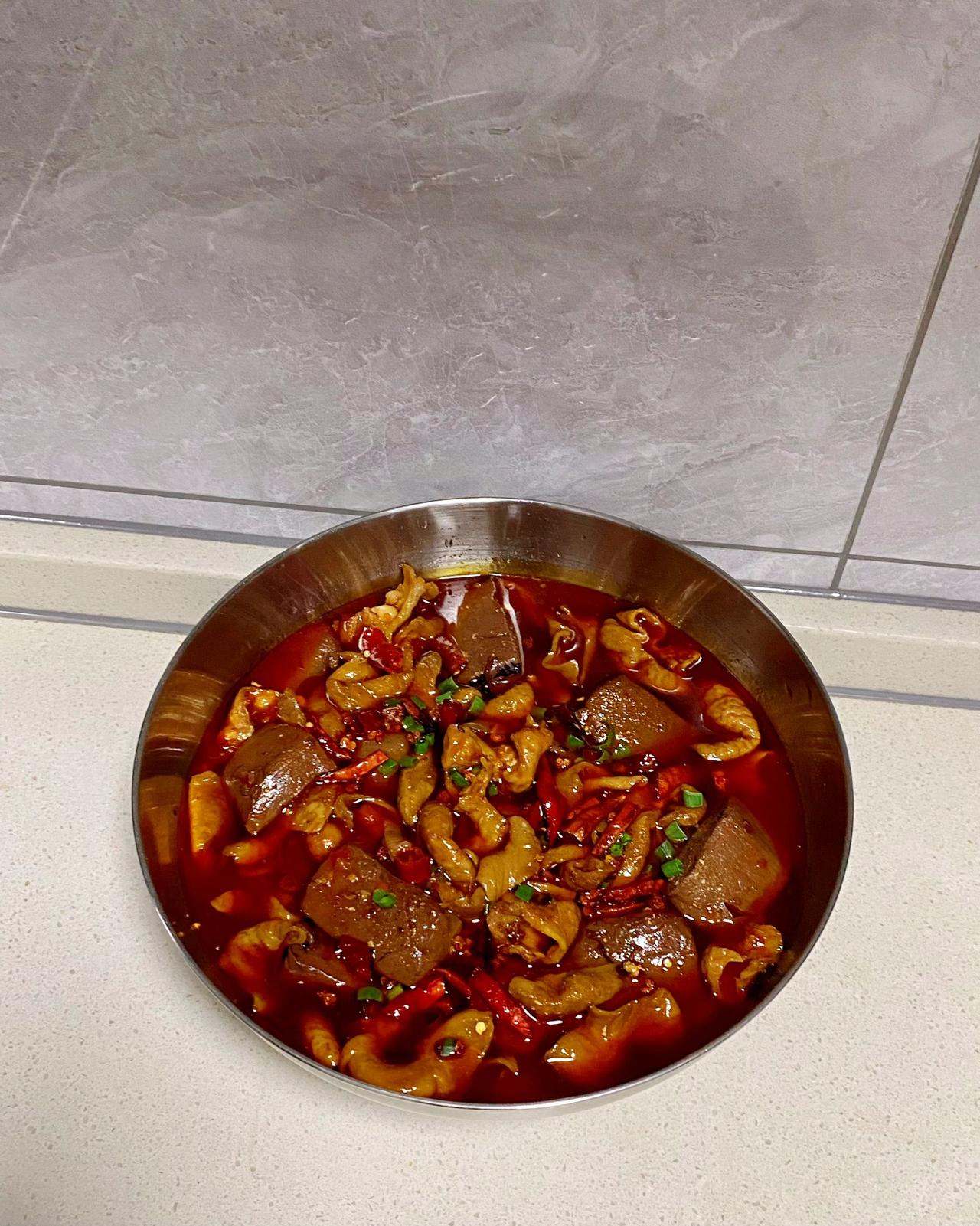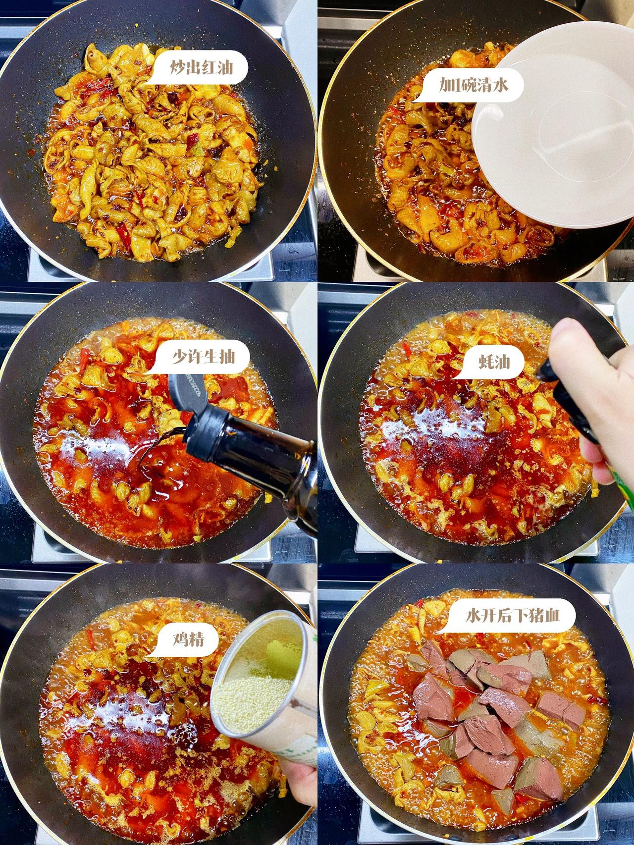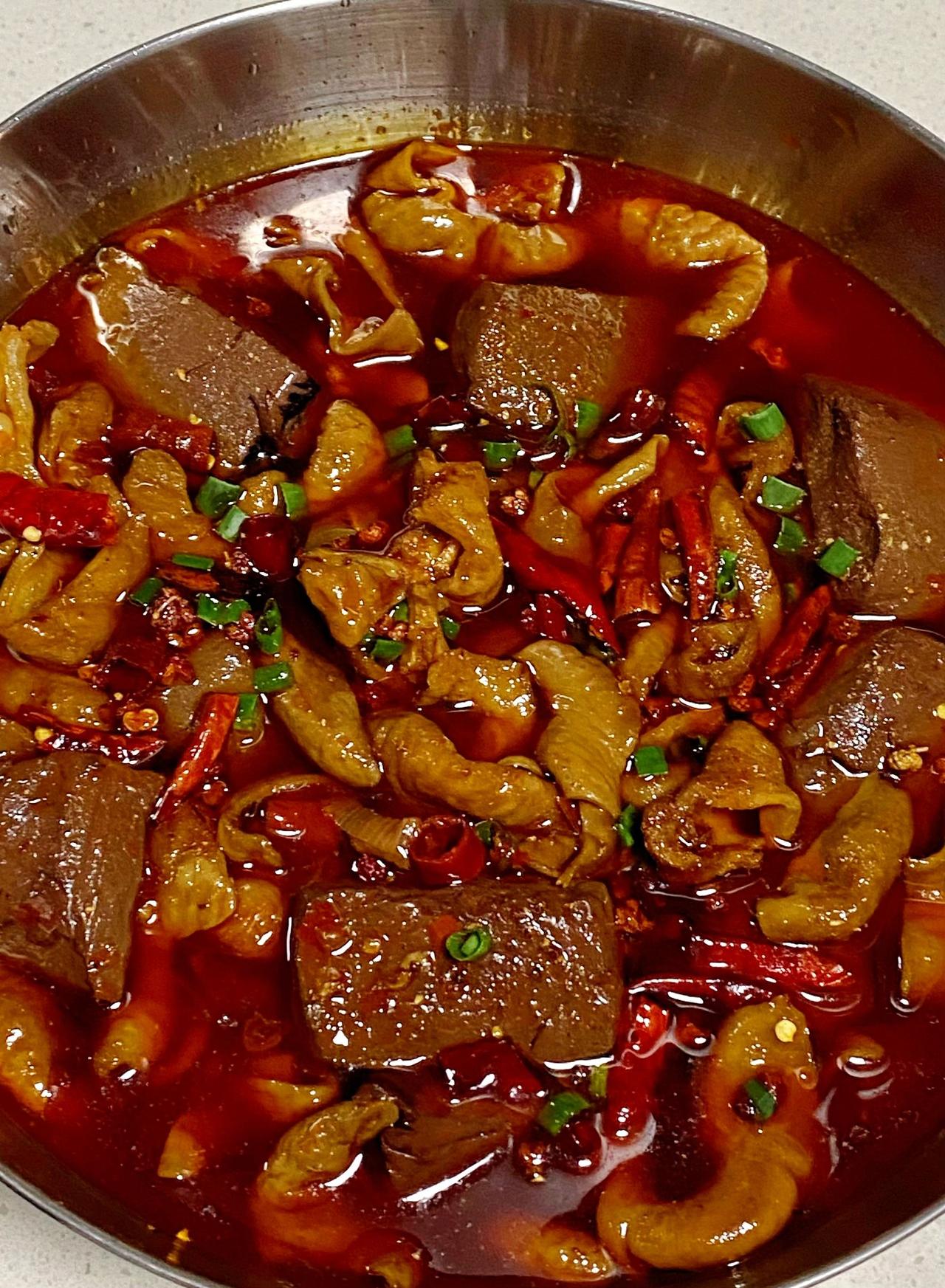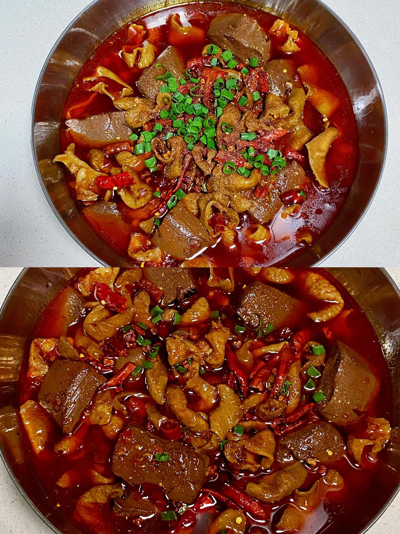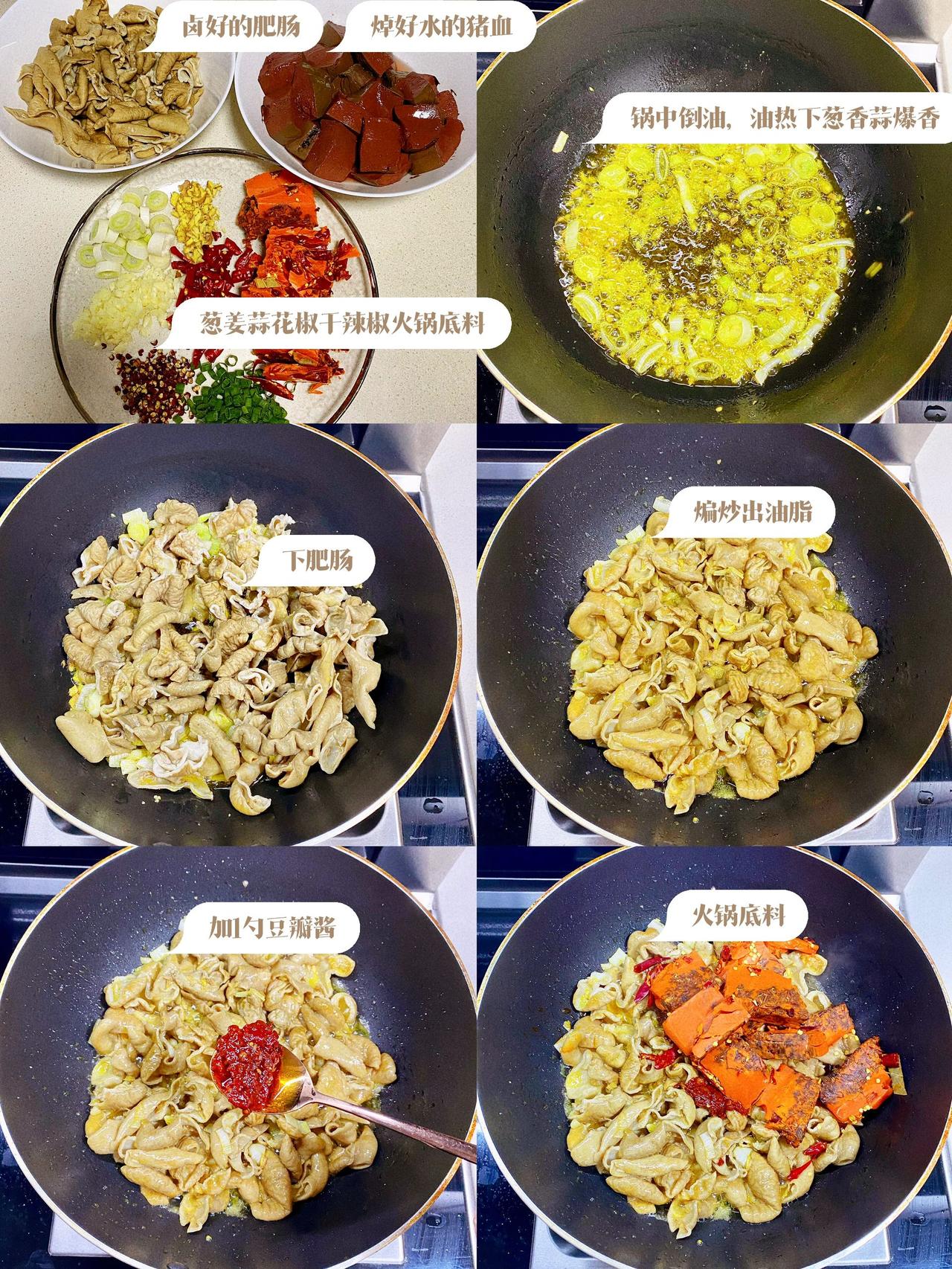 家常血旺肥肠做法,一定要多备米饭 食材:肥肠,猪血,葱姜蒜,干辣椒,花椒,火锅底料,八角香叶桂皮草果等香料。 做法:1、肥肠清洗干净,冷水下锅,加料酒葱姜焯水。 2、焯好水的肥肠另起锅加入热水,葱姜,八角香叶桂皮草果,花椒,1勺老抽,少许盐,卤50分钟。捞出冷却后切块备用。 3、猪血冷水下锅焯水,焯好水后切块备用。 4、起锅烧油,油热下葱姜蒜爆香,下肥肠炒出多余油脂,加1勺豆瓣酱,火锅底料炒出红油。加入1碗水,少许鸡精,生抽,蚝油调味。煮开后下猪血煮5分钟,盛入大碗中。 5、碗中洒上花椒,干辣椒,淋热油。洒少许花椒粉,葱花即可~