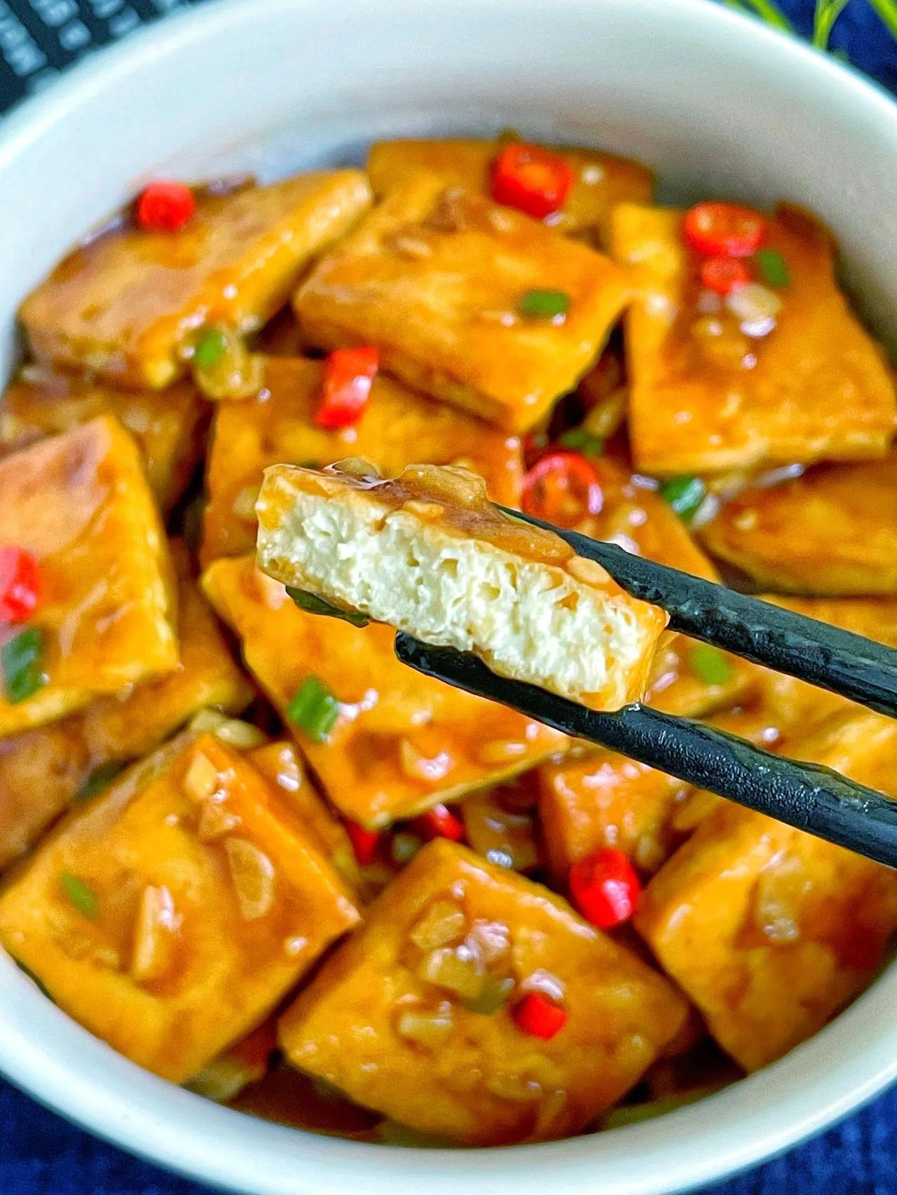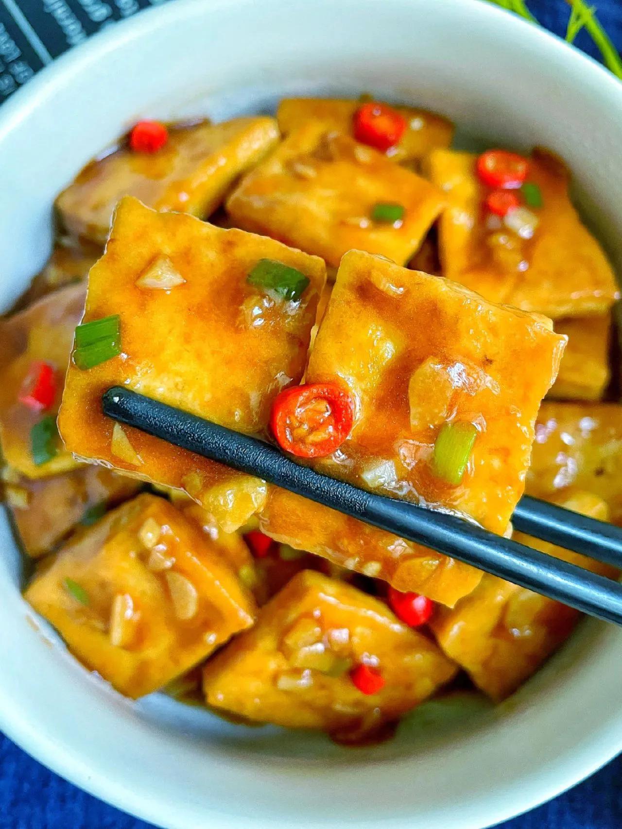 豆腐你像我这样做,一锅米饭都不够你吃! 做法: 1、调酱汁:碗中放2勺生抽、半勺老抽、一勺蚝油、少许盐、一勺淀粉,半碗清水搅匀; 2、油热放豆腐 煎至两面金黄捞出; 3、蒜末炒香,放豆腐,加酱汁,加葱、小米辣,大火收汁即可。