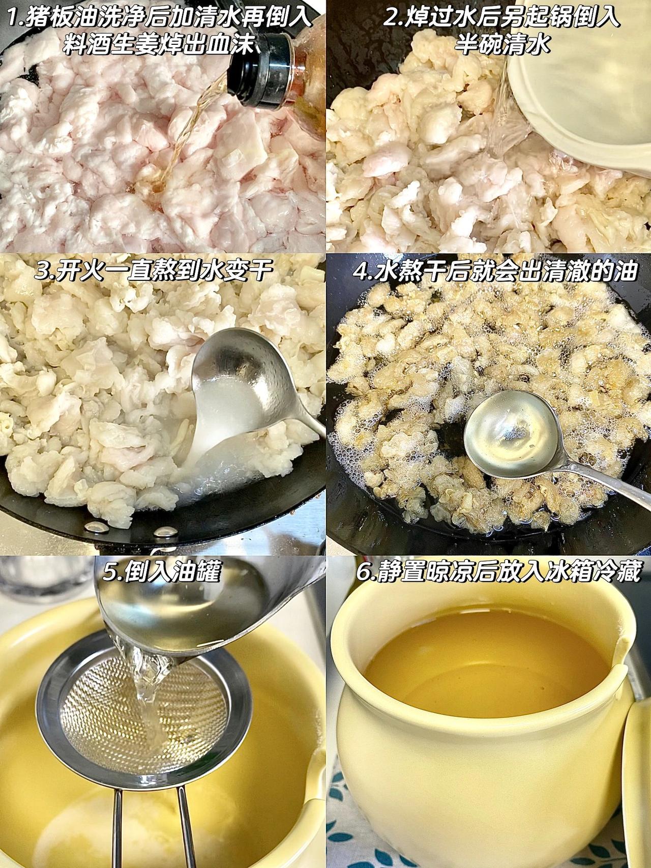 用妈妈教的方法熬出一罐雪白无比的猪油 为了这个可爱的罐子,买了两斤猪板油,用妈妈教的方法熬了一罐猪油,满满一罐雪白无腥味~用来炒菜拌面,做中式点心都YYDS! 熬猪油,记得别直接熬,这样熬出来的猪油又香又白还无腥味 1、猪板油用热水清洗干净,切块后放入锅里,倒入凉水,倒入料酒放入姜片,直接开大火焯水,不用盖锅盖,让猪板油的腥味散发出来 2、焯水后控干水份倒入炒锅里,加入半碗清水,开大火把水熬干,加水熬能让底部不焦糊,熬出来的油更清亮,出油率更高 3、准备好洗干净的罐子,洒点盐可以延长猪油的保存时间,倒入猪油,晾凉后放入冰箱冷藏凝固