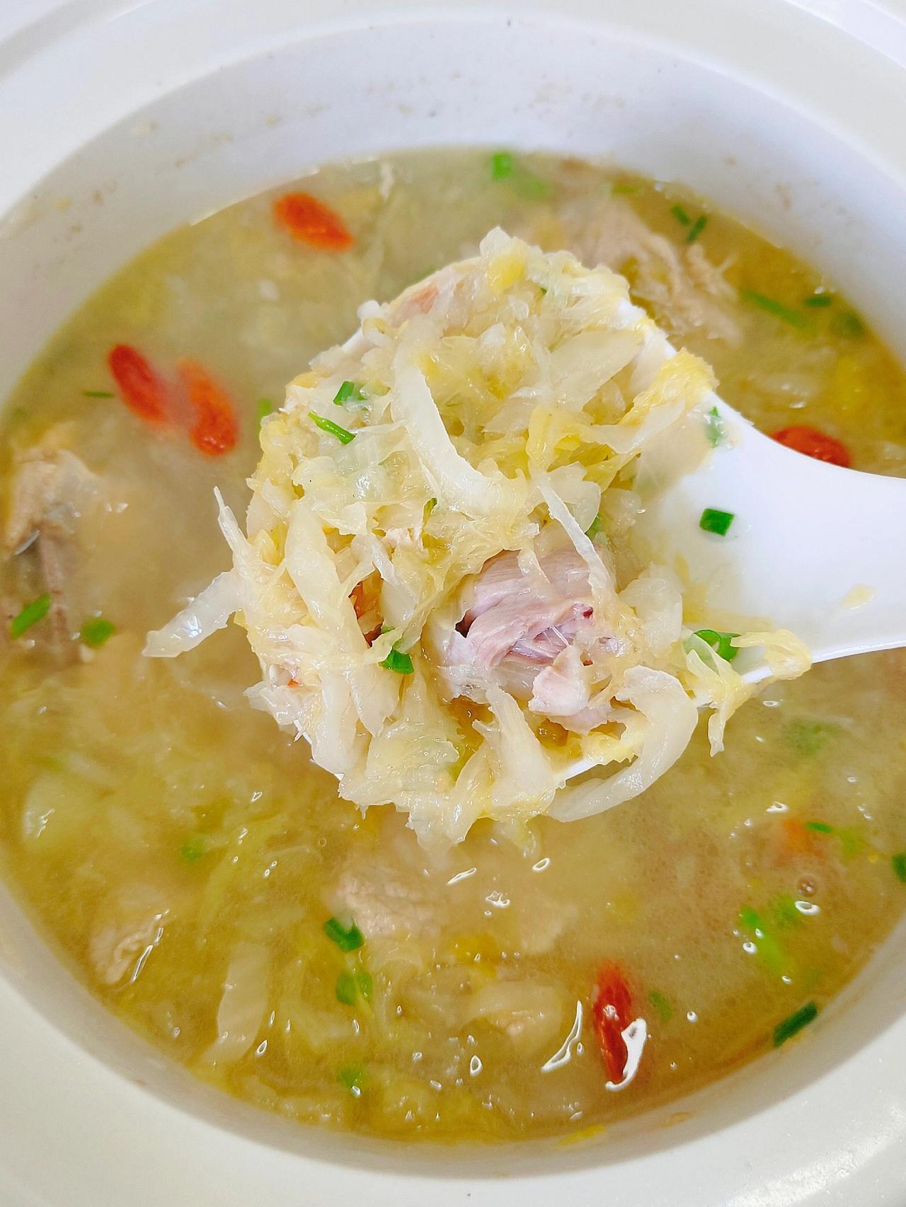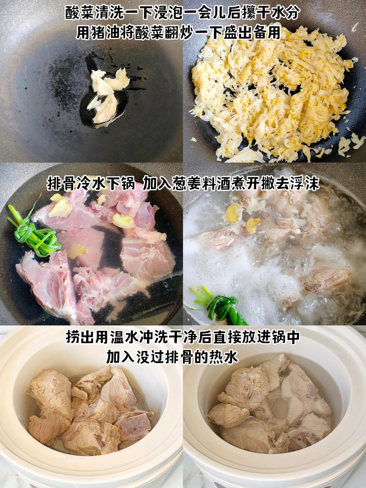我是有点儿炖酸菜的本事在身上的! 天气热的实在没啥胃口;就想吃这排骨炖酸菜! 今天高低给自己整上一锅,软烂的排骨配上鲜美的酸菜,就着蒜酱喝着汤 咱就是说!有谁不爱这一口! 【食材】排骨(脊骨腔骨棒骨都可以)、酸菜、葱、姜、八角、干辣椒 【步骤】1、酸菜清洗一下浸泡一会儿后攥干水分,用猪油将酸菜翻炒一下盛出备用 2、排骨冷水下锅,加入葱姜料酒煮开,撇去浮沫捞出,用温水冲洗干净后直接放进锅中,加入没过排骨的热水 3、煮开后加入适量葱姜八角和干辣椒,盖盖子文火炖煮1个小时,加入酸菜和适量盐和胡椒粉调味,继续炖煮到排骨软烂即可 炖的时间根据自己情况调整,但是建议时间给足,这样酸菜的排骨的味道才会炖透,充分融合!我用家里美的微压电炖锅炖了2个半小时,鲜香酸爽太好吃!
