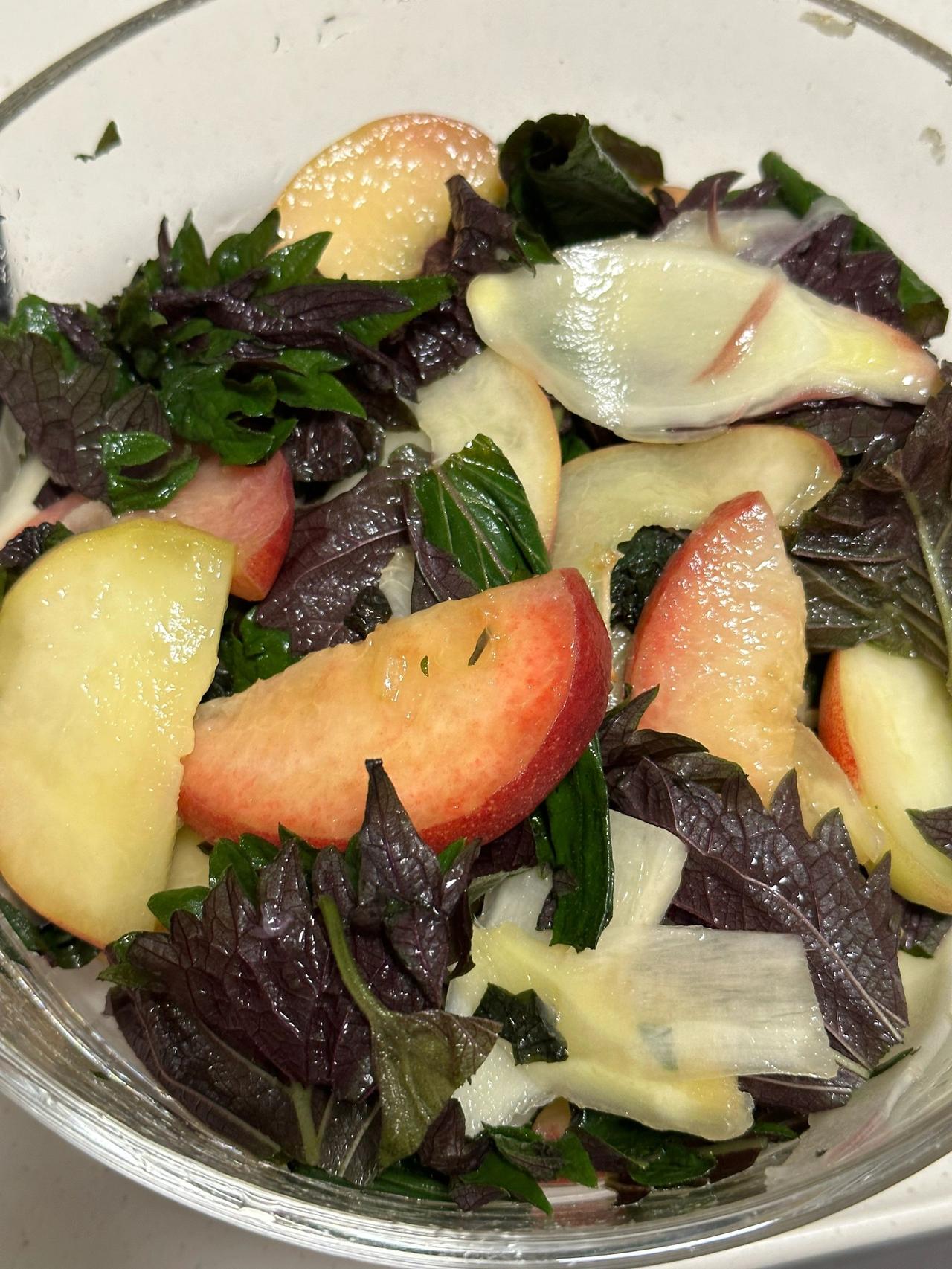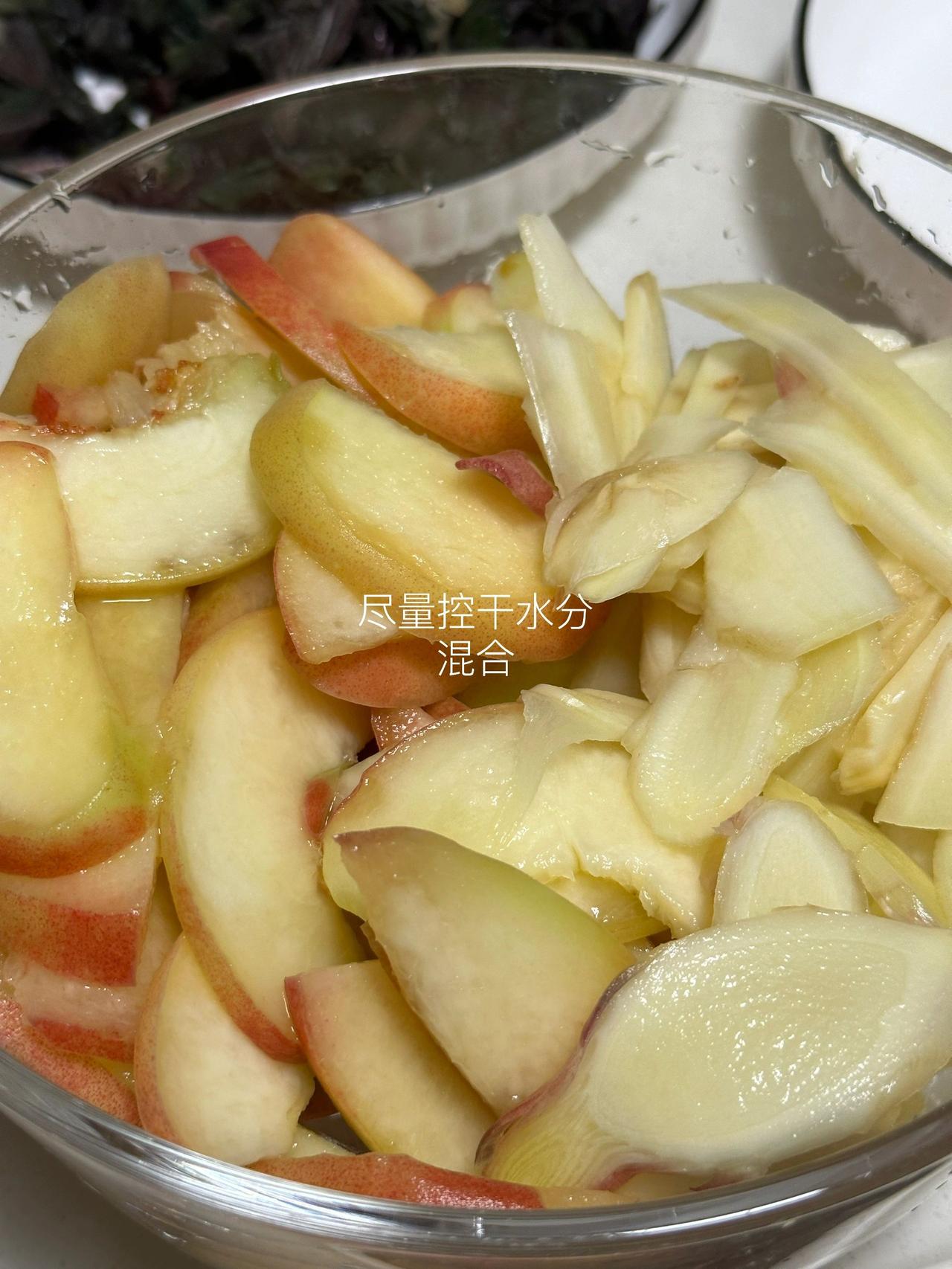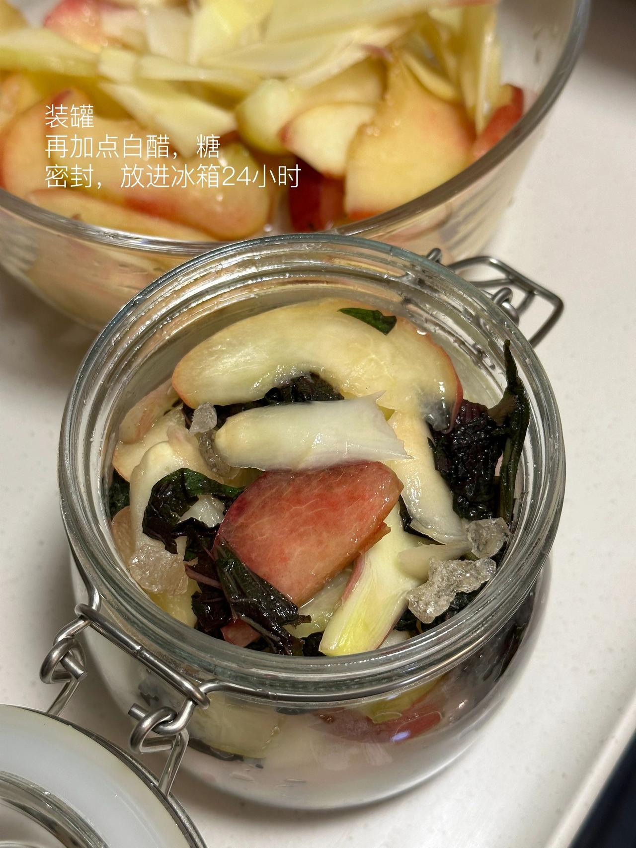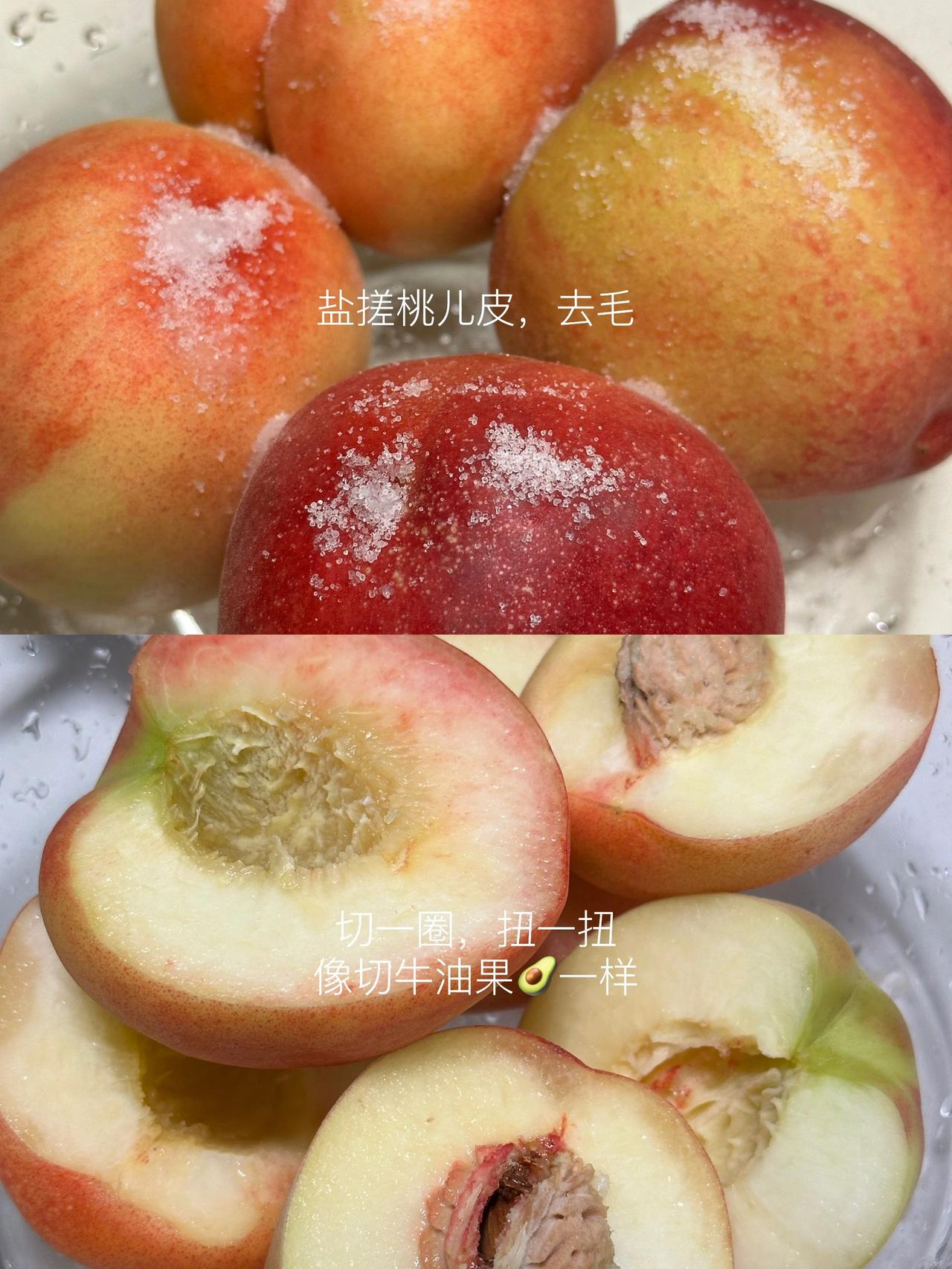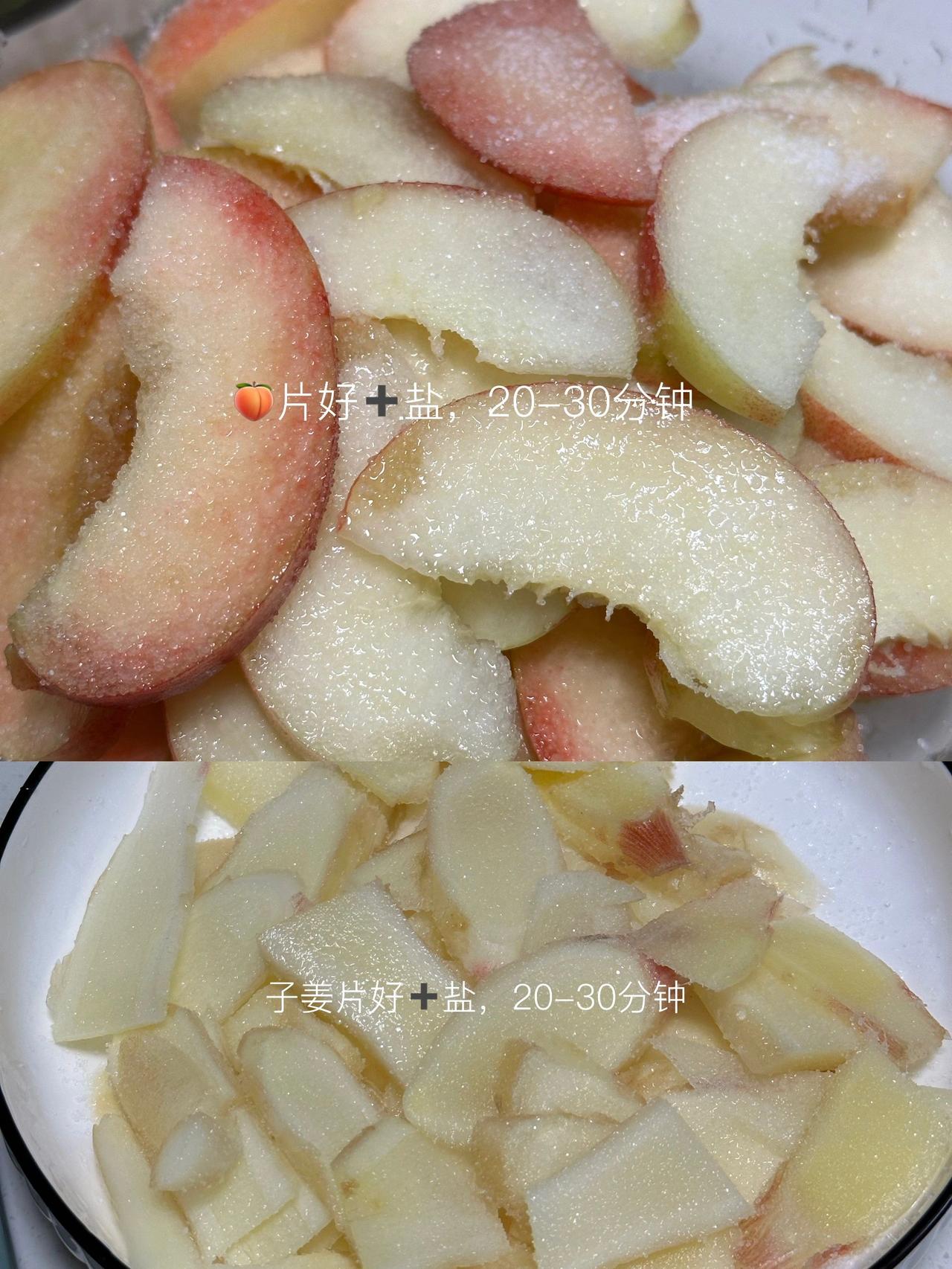 这个季节就是吃不完的各种桃,山上摘的,老板送的… 明天要去孕婆子家玩耍,想着要不做成紫苏桃子姜吧,孕婆子应该可以,方子里没放啥糖,一来是我不大吃糖,二来是孕婆子也不太适合吃糖,这不巧了嘛[ 1、桃子4-6个,紫苏1把,子姜2块(常规大小半个手掌那样)黄糖/冰糖拇指盖大小4-6颗,白醋一点点 2、桃身上的毛毛用盐擦擦洗洗 3、桃、子姜切片,撒盐,逼水。静置20-30分钟后,洗干净; 4、紫苏洗净控水切段,加一点点白醋和糖(黄糖白糖都可)网友这一步都出红色的汁儿了,我没有哦哈哈哈哈 5、洗干净桃、子姜,控干。然后把它们三拌一块,最后再加一点点白醋、毛毛子糖 6、我自己操作了两版,在干燥的瓶子里一层紫苏一层桃子一层姜、在大碗里先拌好再装瓶。不知道哪样会味道均匀一些,明晚瞧瞧[吐舌头H]倒是刚拌好尝了一块,不错不错,有点紫苏咸鲜,桃味儿自带果香甜。又跟外面买的酸酸甜甜的不大一样。 · 密封放冰箱了,明天尝尝看 大家,端午安康昂,吃好喝好,回见