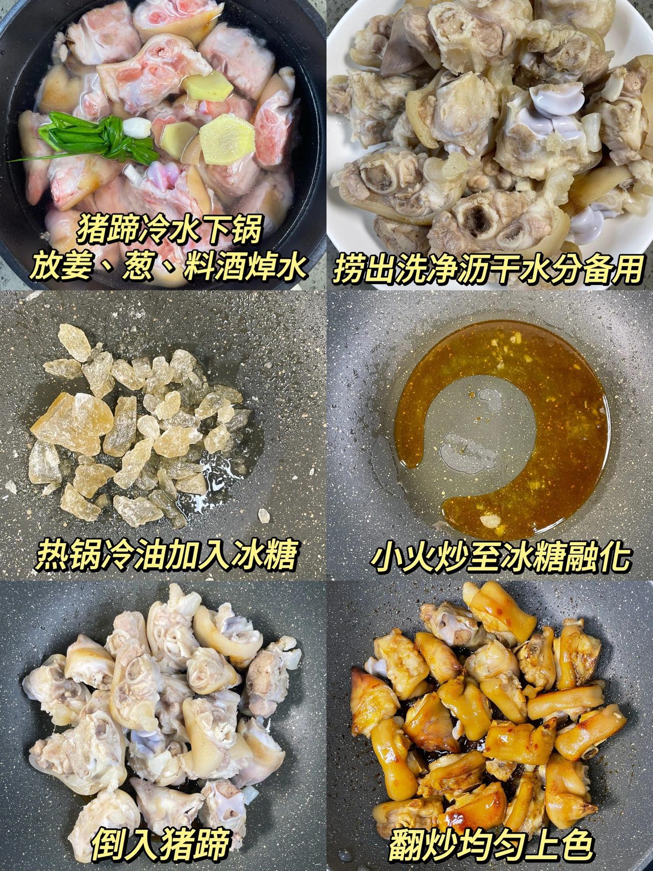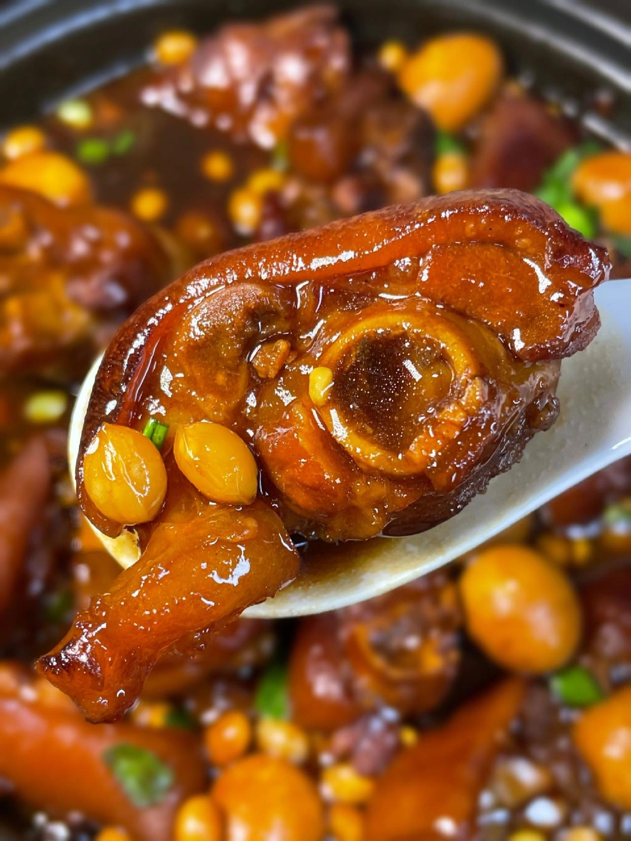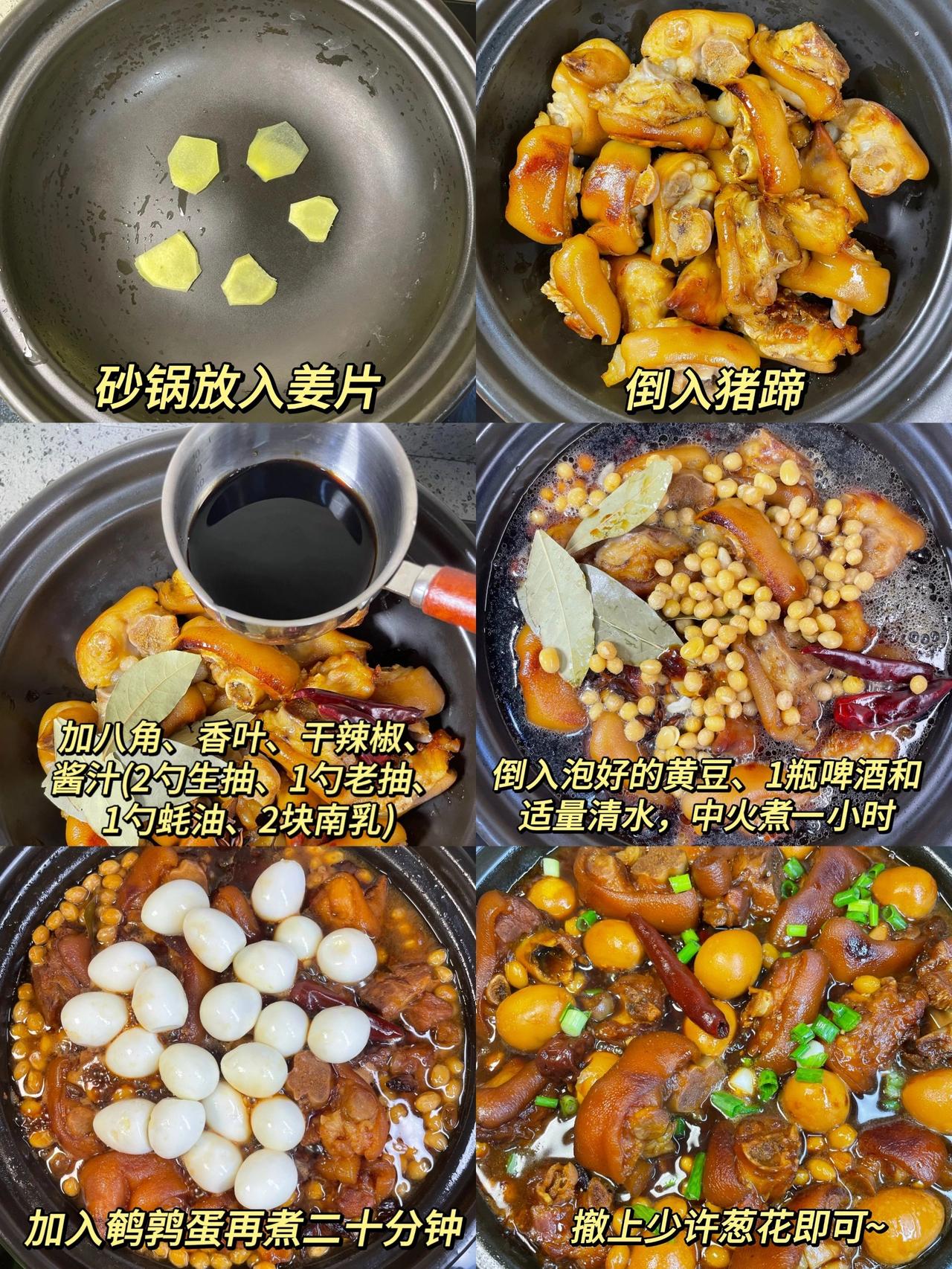 我妈做的拿手菜!!好吃到,红烧猪蹄!软糯脱骨! 肉质鲜嫩,入口即化,色香味俱全,吃起来一点都不肥腻,鹌鹑蛋裹满浓浓的汤汁,拌饭吃很香~ 食材:猪蹄、鹌鹑蛋、黄豆、冰糖、啤酒、八角、香叶、干辣椒 做法:1、猪蹄冷水下锅,放姜、葱、料酒焯水,捞出洗净沥干水分备用 2、热锅冷油加入冰糖,小火炒至冰糖融化,倒入猪蹄,翻炒均匀上色 3、砂锅放入姜片,倒入猪蹄,加八角、香叶、干辣椒、酱汁(2勺生抽、1勺老抽、1勺蚝油、2块南乳) 4、倒入泡好的黄豆、1瓶啤酒和适量清水,中火煮一小时 5、加入鹌鹑蛋再煮二十分钟,撒上少许葱花即可~ 这个红烧猪蹄简单美味,满满的胶原蛋白,肉质鲜嫩美味,姐妹们快来试一试
