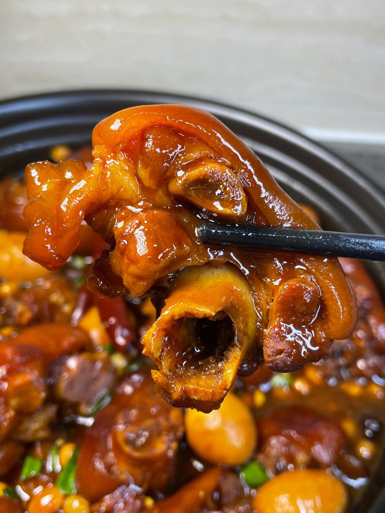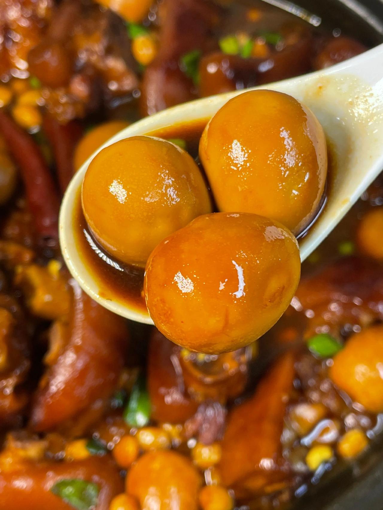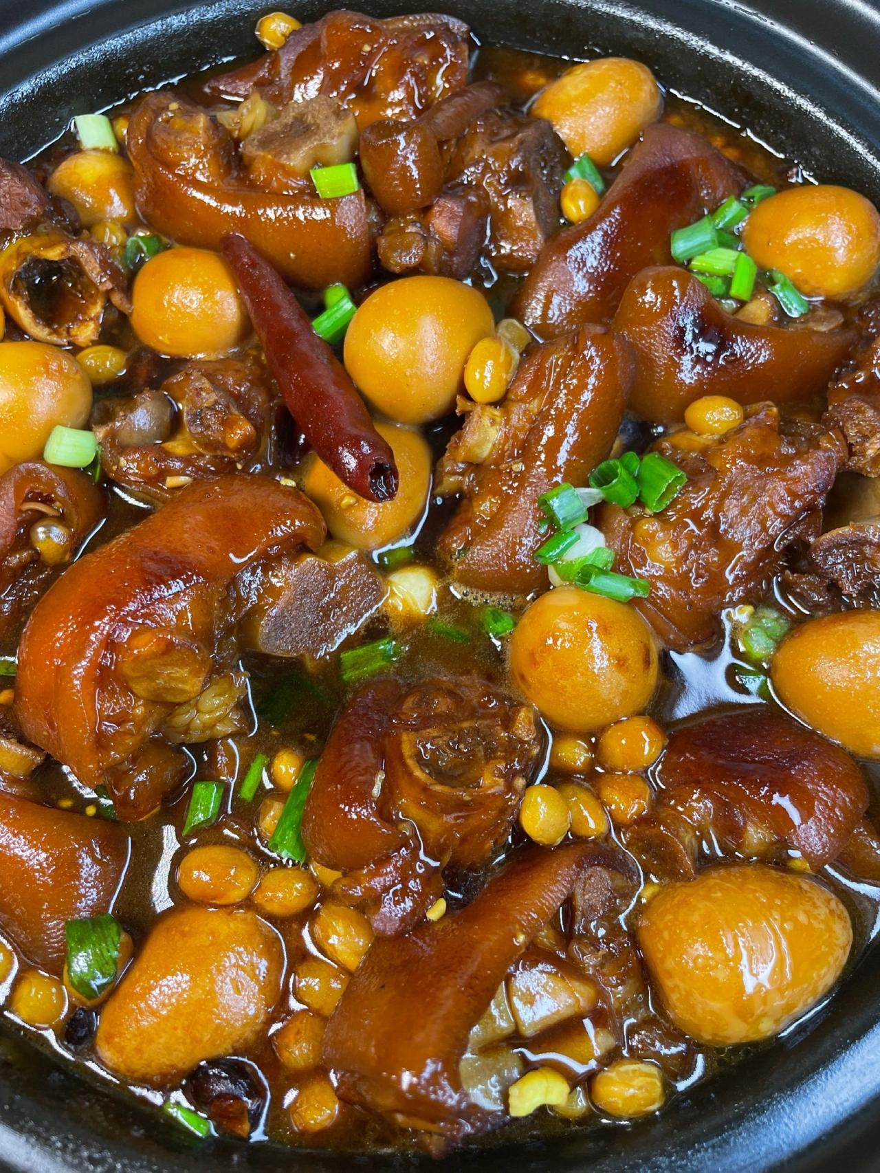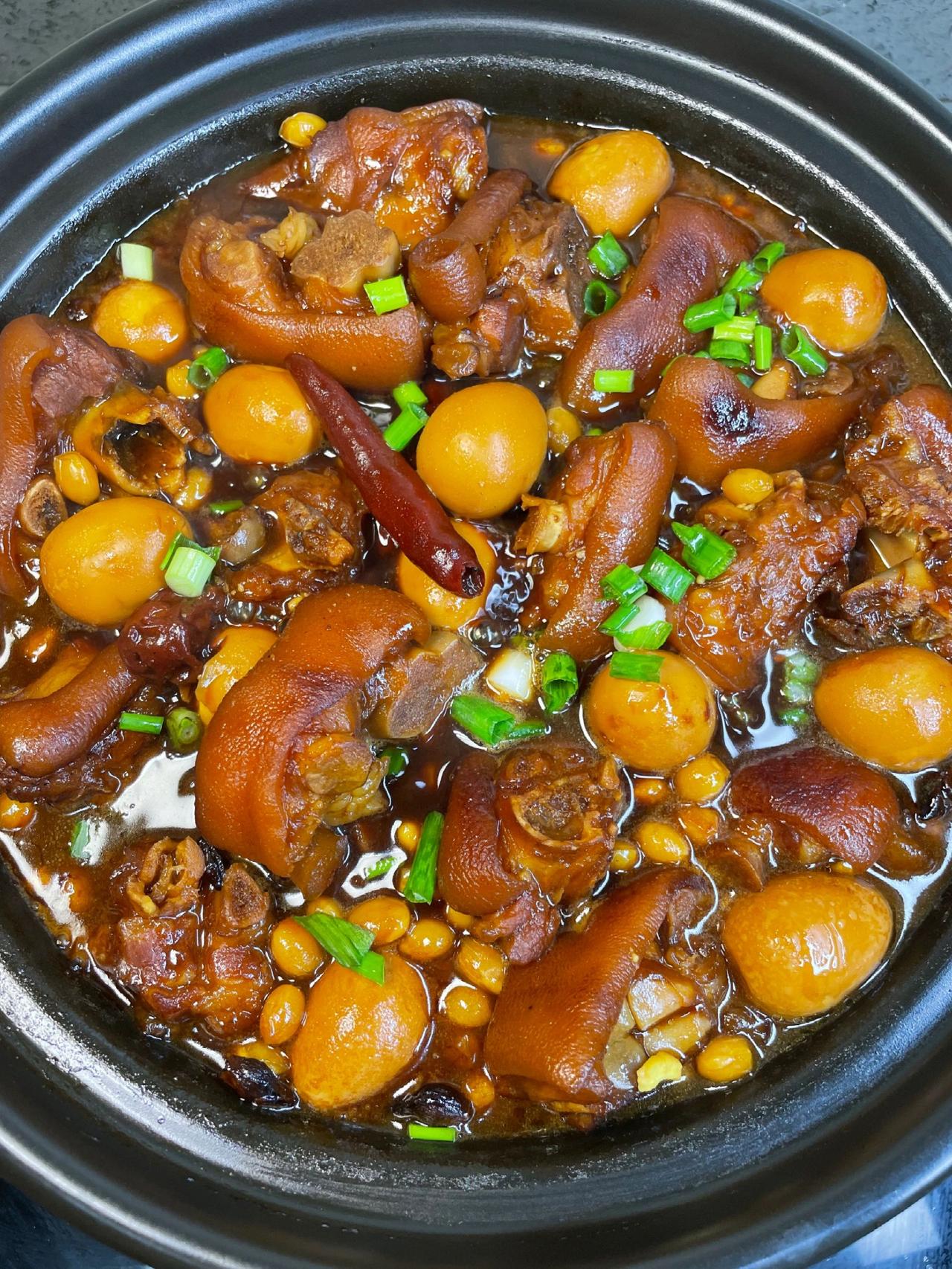 我妈做的拿手菜!!好吃到,红烧猪蹄!软糯脱骨! 肉质鲜嫩,入口即化,色香味俱全,吃起来一点都不肥腻,鹌鹑蛋裹满浓浓的汤汁,拌饭吃很香~ 食材:猪蹄、鹌鹑蛋、黄豆、冰糖、啤酒、八角、香叶、干辣椒 做法:1、猪蹄冷水下锅,放姜、葱、料酒焯水,捞出洗净沥干水分备用 2、热锅冷油加入冰糖,小火炒至冰糖融化,倒入猪蹄,翻炒均匀上色 3、砂锅放入姜片,倒入猪蹄,加八角、香叶、干辣椒、酱汁(2勺生抽、1勺老抽、1勺蚝油、2块南乳) 4、倒入泡好的黄豆、1瓶啤酒和适量清水,中火煮一小时 5、加入鹌鹑蛋再煮二十分钟,撒上少许葱花即可~ 这个红烧猪蹄简单美味,满满的胶原蛋白,肉质鲜嫩美味,姐妹们快来试一试