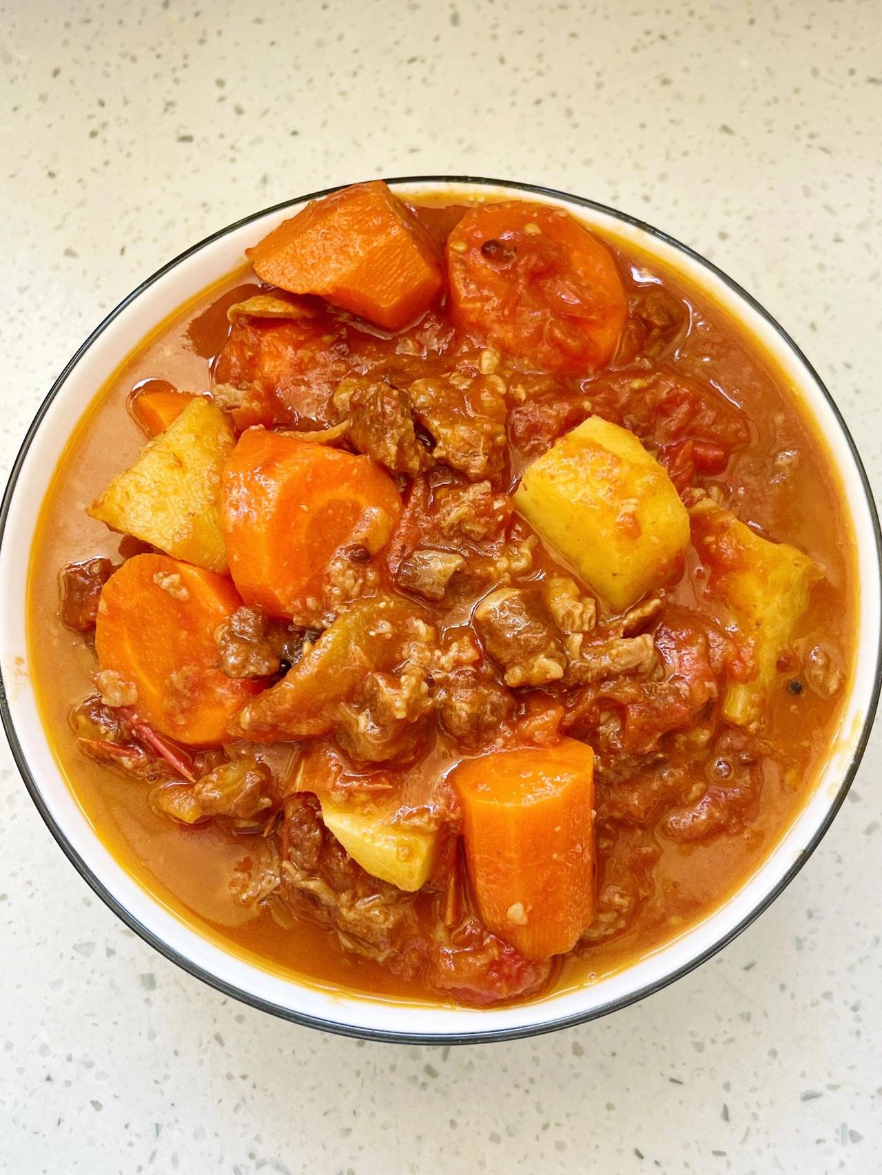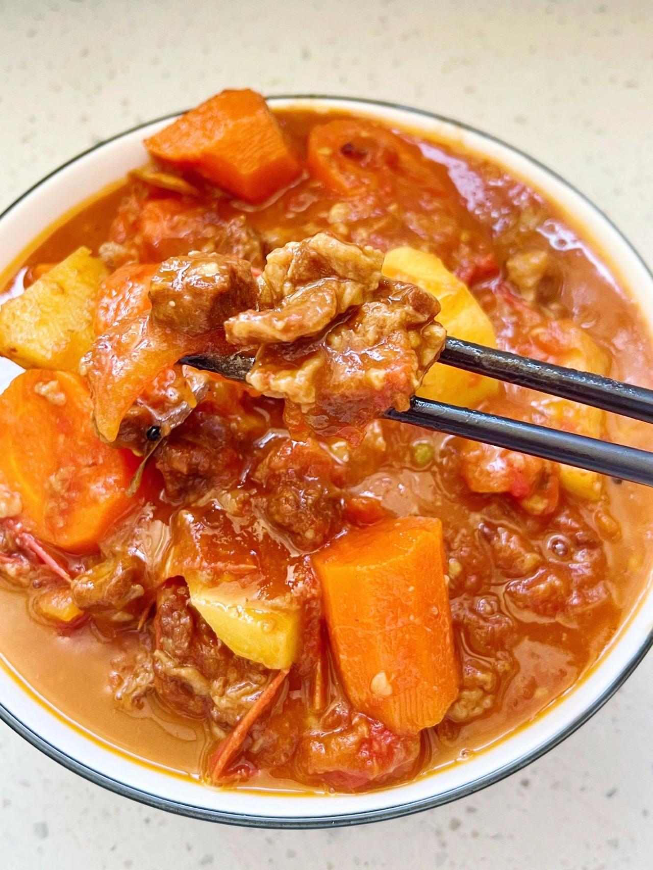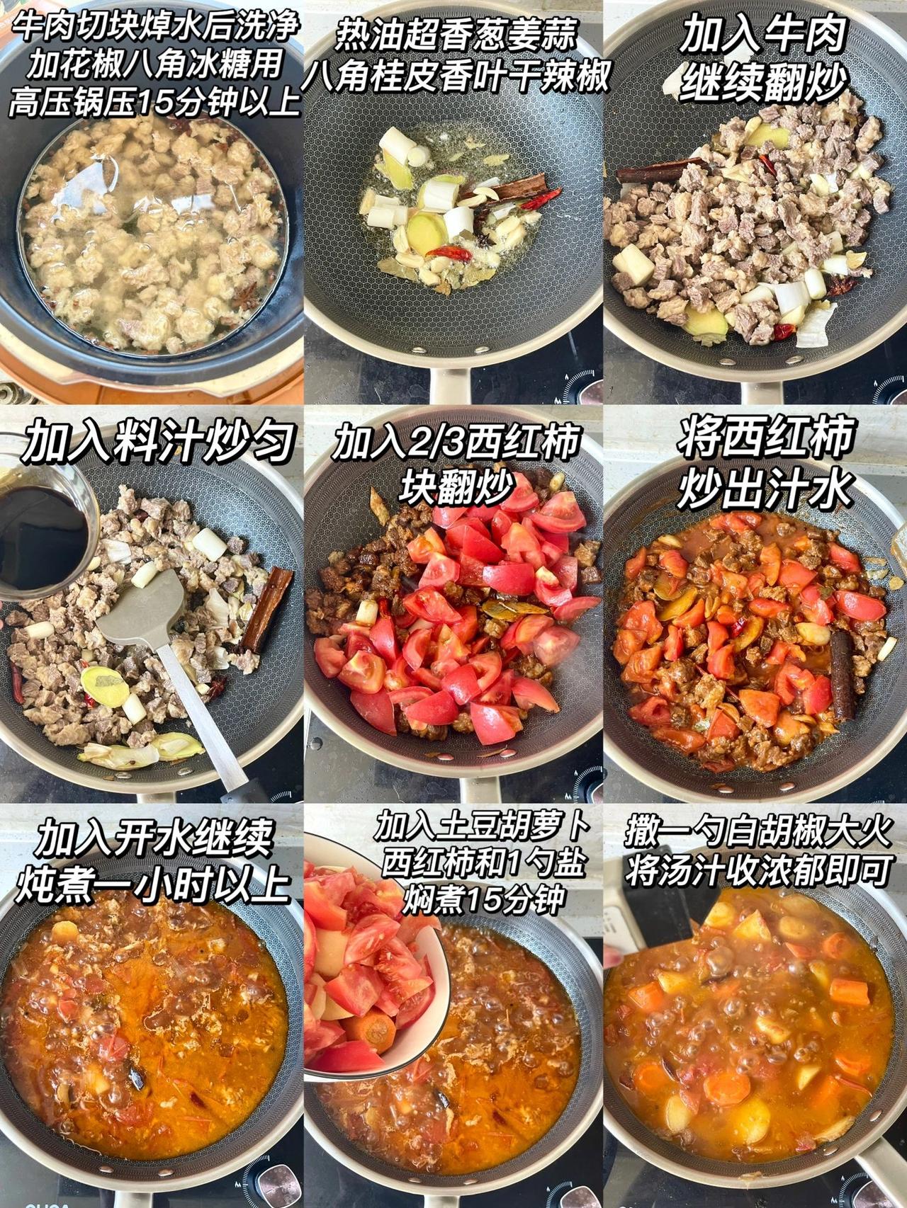 番茄土豆炖牛腩试试这样做,超级软烂入味 要想牛肉炖的烂乎不柴,一定要炖得时间久一点,或者用高压锅炖,没有高压锅的话就炖的时间久一点~简直香迷糊了,谁能不爱呢,快来试试吧 食材准备:牛腩、西红柿、土豆、胡萝卜、葱姜蒜八角桂皮香叶干辣椒 花椒 冰糖 白胡椒粉 盐 料汁:2勺生抽、1勺老抽、2勺蚝油 做法:1、牛肉切块(切的块不要太小,我是为了给宝宝吃所以切小了,牛肉做出来会缩水)焯水后洗净,放高压锅里,加入热水、花椒、冰糖,用高压锅炖15分钟(至少是这个时间,时间充足可延长) 2、起锅烧油,炒香葱姜蒜八角桂皮香叶干辣椒,加入牛肉翻炒,再加入料汁(2勺生抽1勺老抽2勺蚝油)炒香,下2/3的番茄块炒出汁水,加入热水继续炖煮1小时以上(如果是高压锅40分钟就够了) 3、加入土豆、胡萝卜、剩下的番茄块和1勺盐焖煮15分钟,加入1勺白胡椒粉大火将汤汁收至浓郁即可出锅