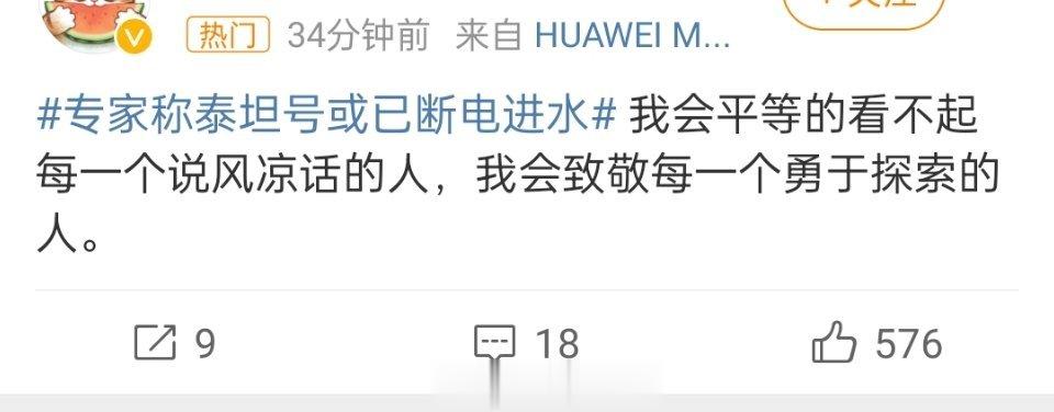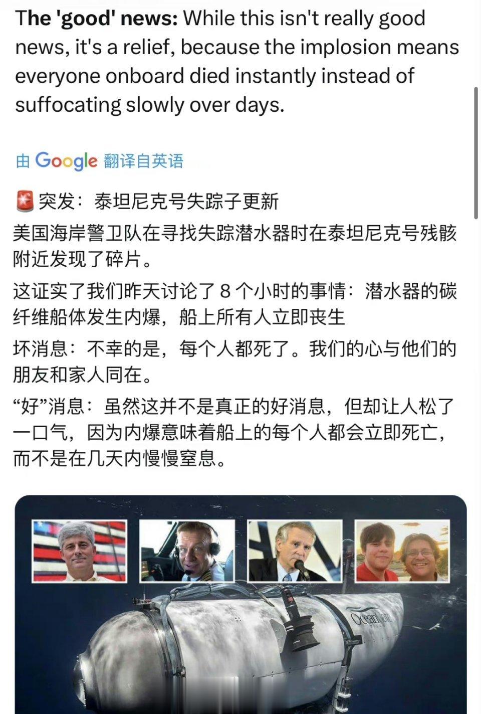美国观光潜艇残骸找到了,舱体早已被水压压扁,人都是死了。国内的风向也变了,很多人说要尊重探险家…作孽,这哪里是探险,这是玩票!为啥要花25万美元去看一艘沉船?因为在电影的渲染,泰坦尼克号在西方人心里的分量太重了,小李子有一定的责任……[二哈][二哈][二哈]