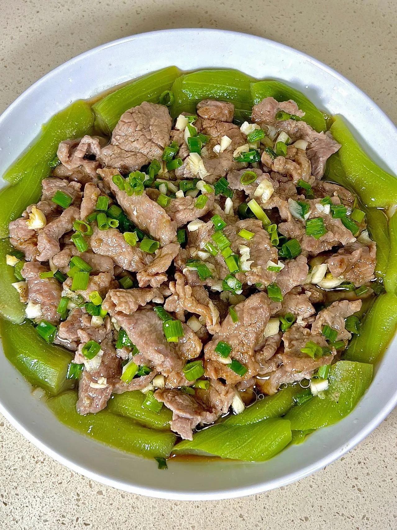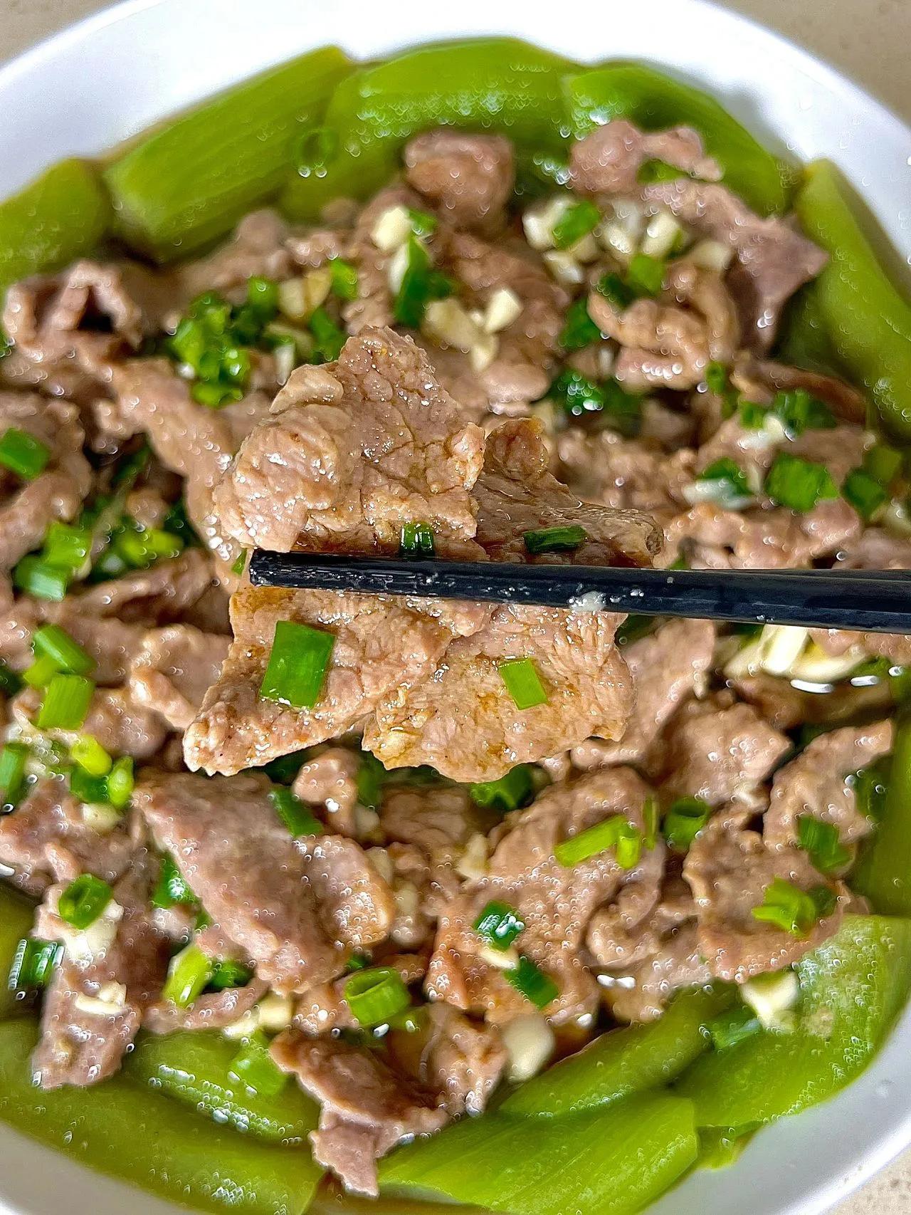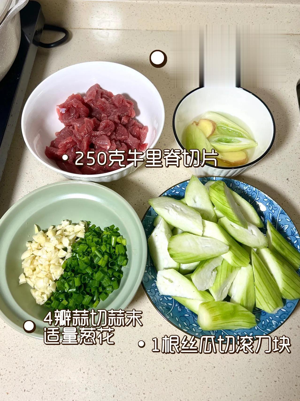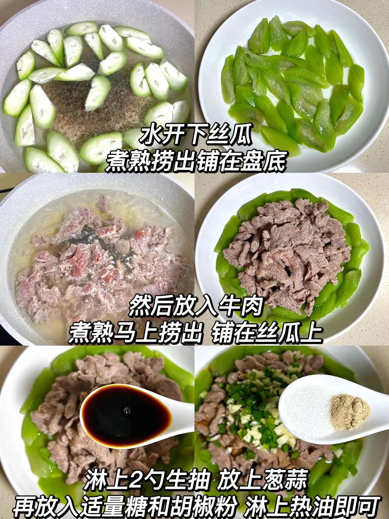 不是吧!葱油牛肉!连吃三顿没吃够! 做法: 1、牛肉加胡椒粉适量、盐适量、料酒1.5勺、生抽1.5勺、玉米淀粉1勺 抓匀; 2、抓匀后放葱姜水分两次放入抓匀至看不见水,再放下一次,最后再放1勺油抓匀腌半小时; 3、水开下丝瓜煮熟捞出铺在盘底,然后放入牛肉 煮熟马上捞出铺在丝瓜上; 4、淋上2勺生抽,放上葱蒜,再放入适量糖和胡椒粉,淋上热油即可。