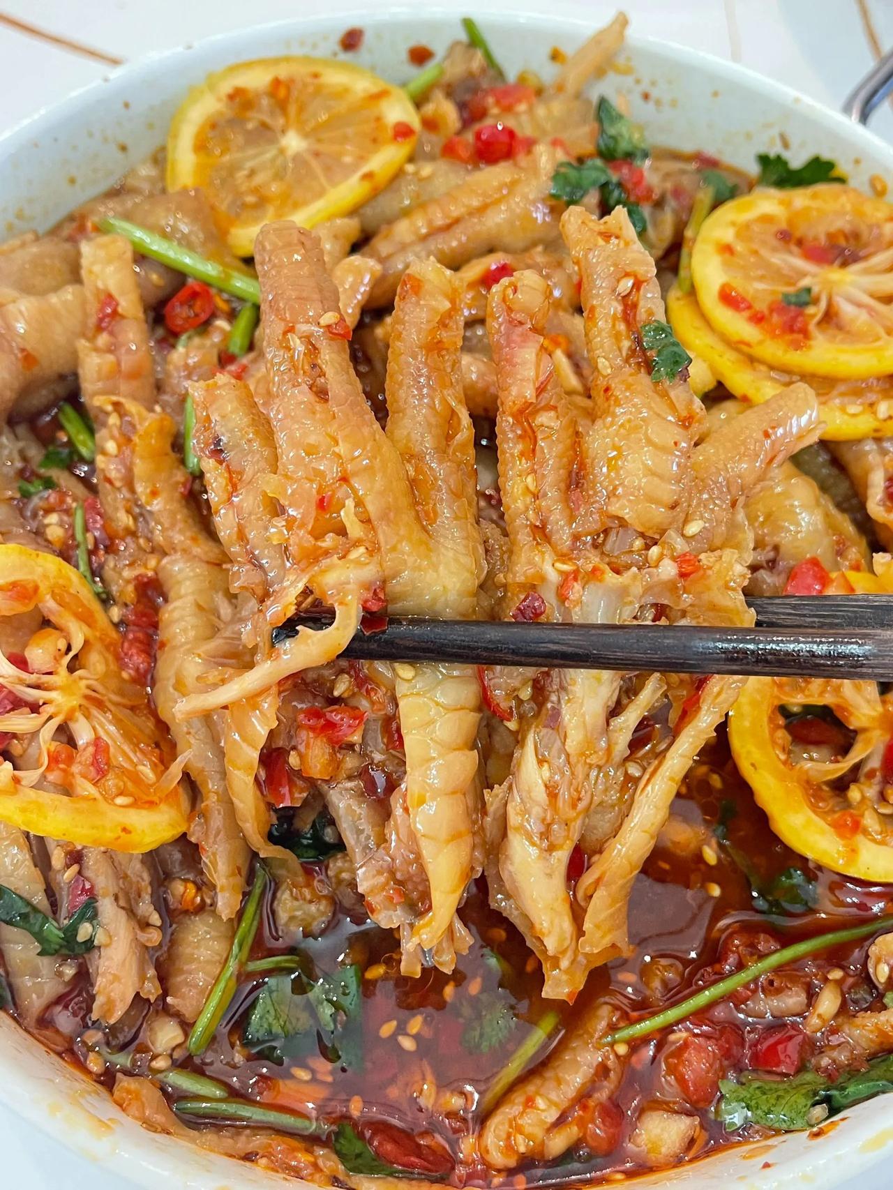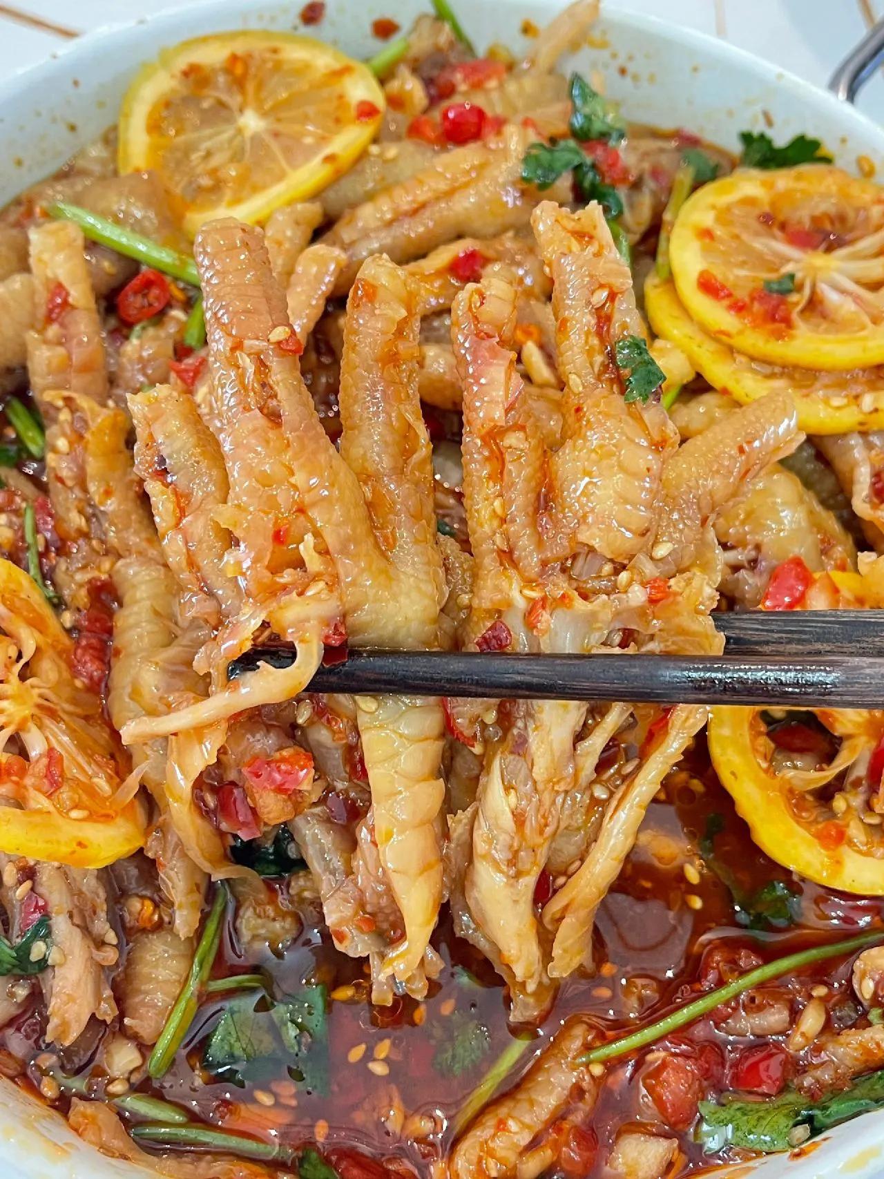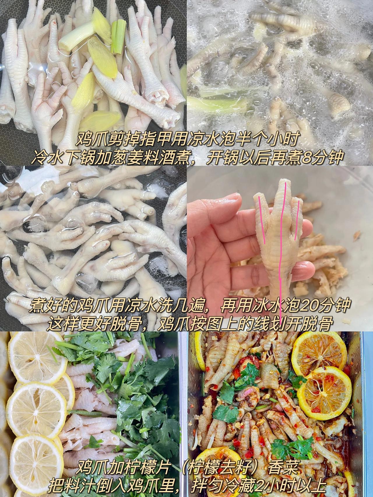 好吃到让你忍不住“哇塞”无骨鸡爪做法~ 这一口无骨鸡爪~吃下去实在是过瘾~冰爽Q弹!还不用吐骨头!一口一个!实在是太幸福了~而且非常的入味!保证是一口一个满足! 做法: 1、鸡爪剪掉指甲用凉水泡半个小时,冷水下锅加葱姜、料酒煮开锅以后再煮8分钟; 2、煮好的鸡爪用凉水洗几遍,再用冰水泡20分钟,再按图上的线划开脱骨; 3、鸡爪加柠檬片(柠檬去籽)、香菜,把料汁倒入鸡爪里,拌匀冷藏2小时以上; 4、调料汁:碗中放蒜末,辣椒面,小米辣、芝麻用热油泼香后,再加切好的辣椒蓉、洋葱丁、5勺生抽、陈醋5-8勺、蚝油两勺、香油一勺、白糖1-2勺、盐适量,加半碗纯净水搅匀。