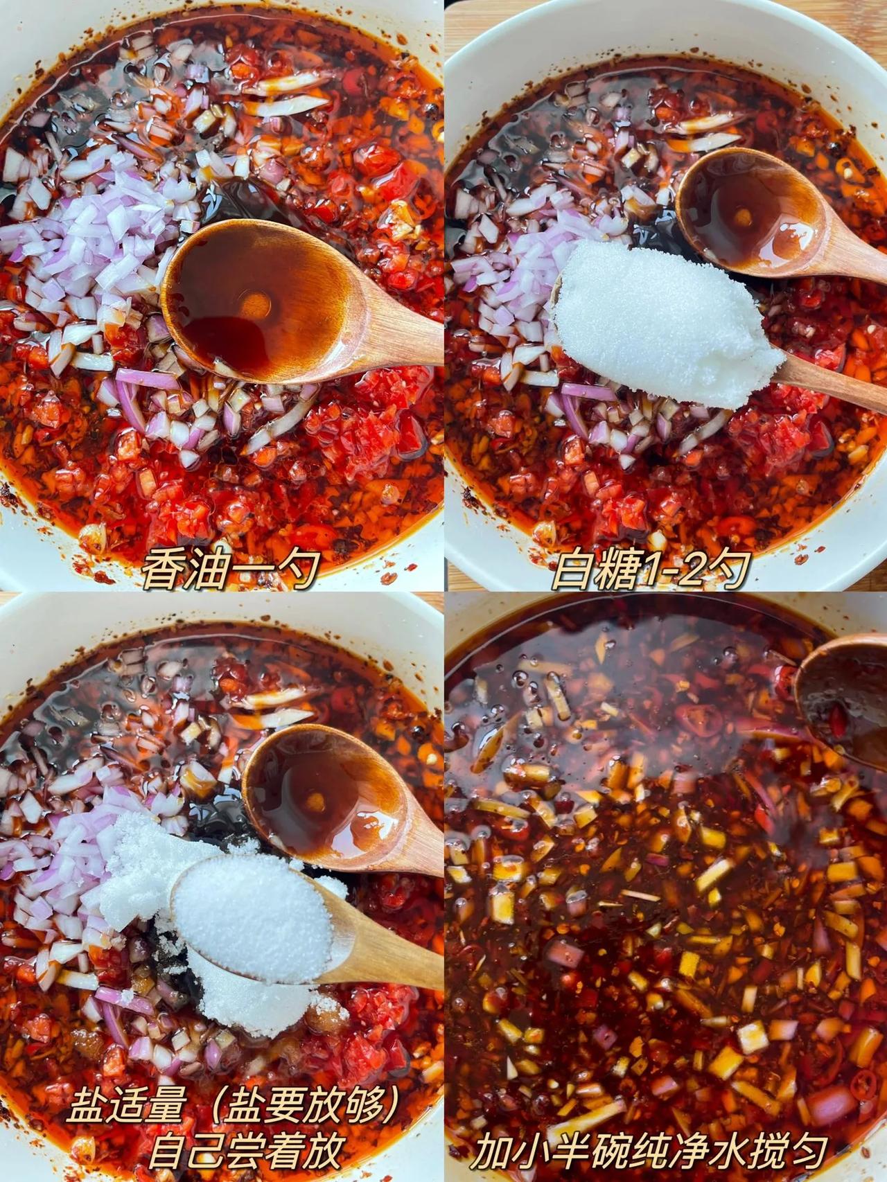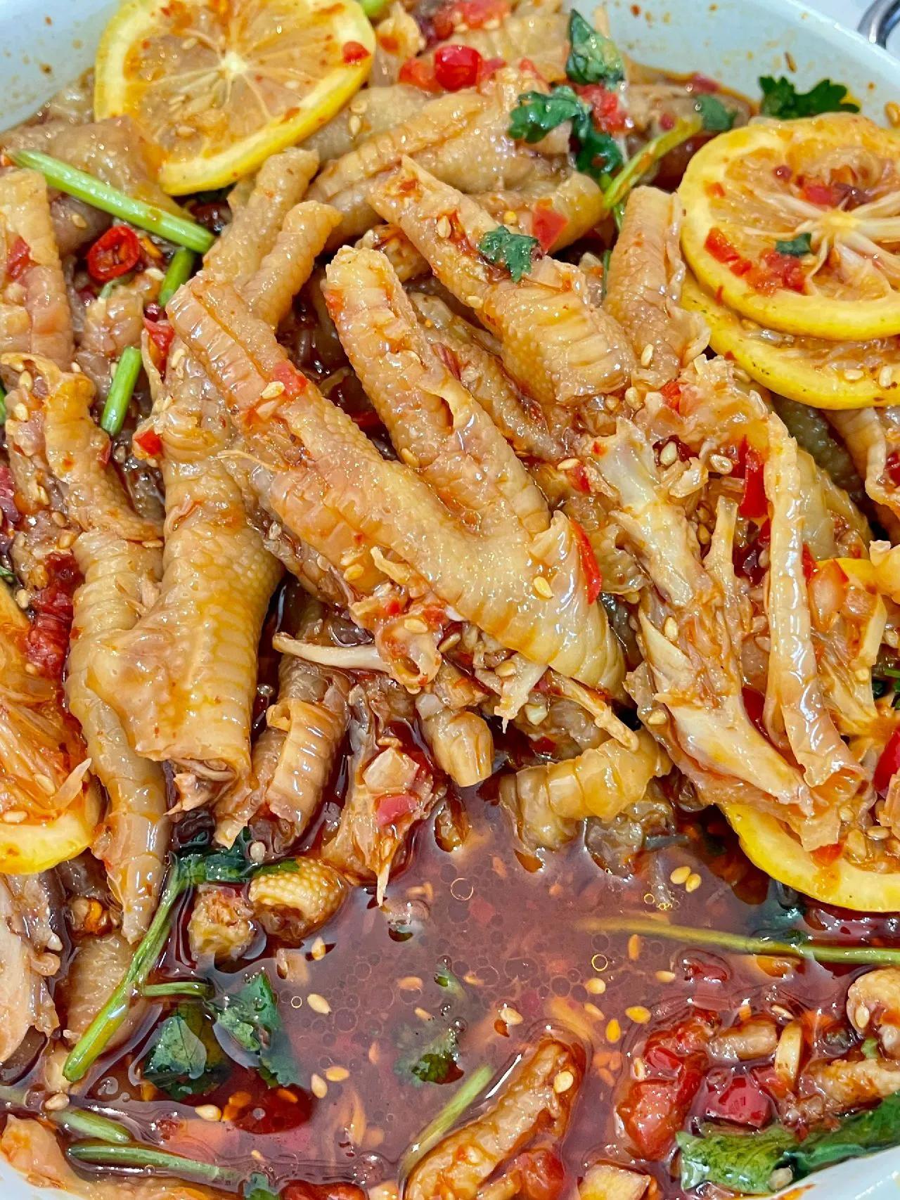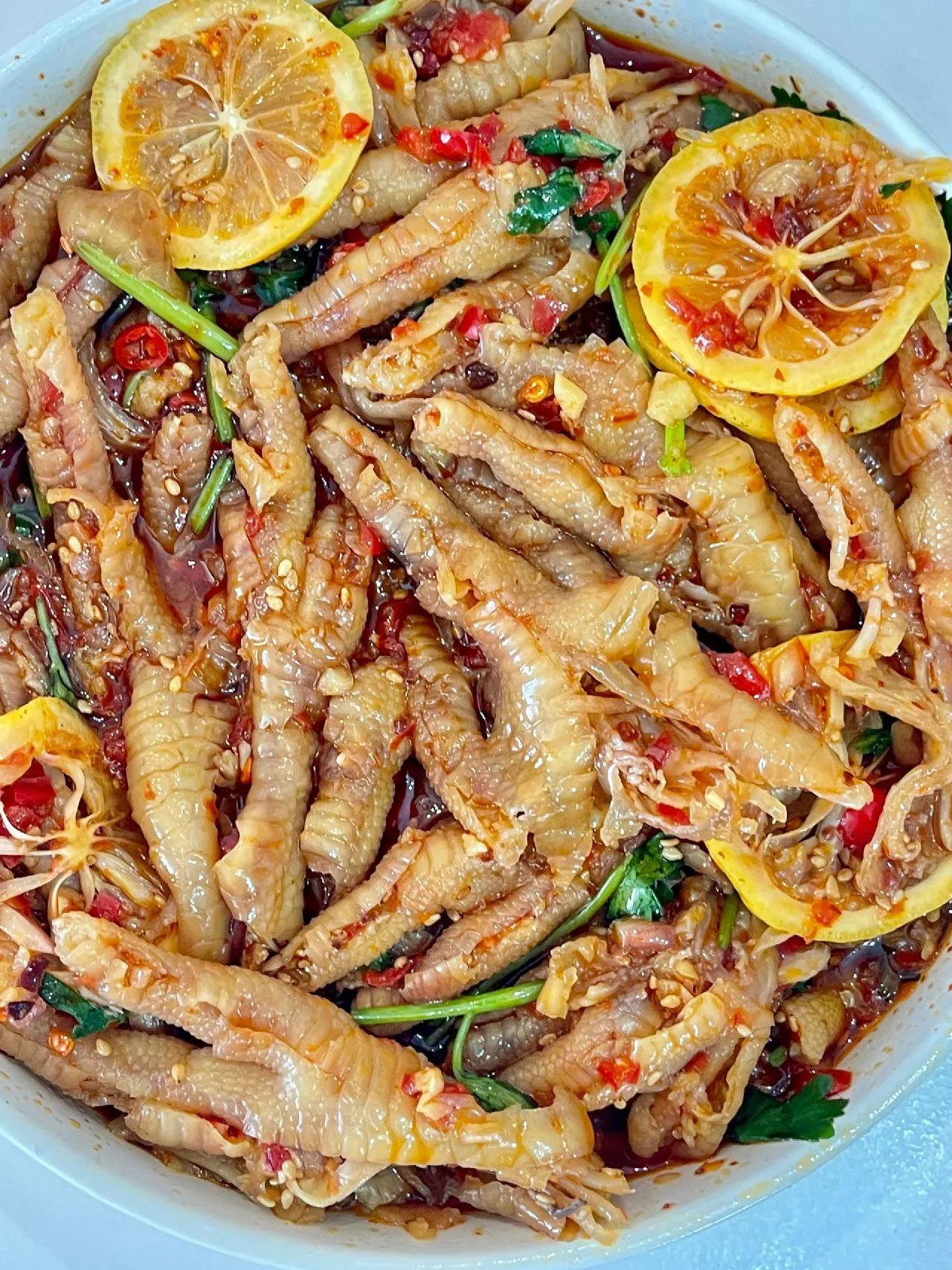好吃到让你忍不住“哇塞”无骨鸡爪做法~ 这一口无骨鸡爪~吃下去实在是过瘾~冰爽Q弹!还不用吐骨头!一口一个!实在是太幸福了~而且非常的入味!保证是一口一个满足! 做法: 1、鸡爪剪掉指甲用凉水泡半个小时,冷水下锅加葱姜、料酒煮开锅以后再煮8分钟; 2、煮好的鸡爪用凉水洗几遍,再用冰水泡20分钟,再按图上的线划开脱骨; 3、鸡爪加柠檬片(柠檬去籽)、香菜,把料汁倒入鸡爪里,拌匀冷藏2小时以上; 4、调料汁:碗中放蒜末,辣椒面,小米辣、芝麻用热油泼香后,再加切好的辣椒蓉、洋葱丁、5勺生抽、陈醋5-8勺、蚝油两勺、香油一勺、白糖1-2勺、盐适量,加半碗纯净水搅匀。