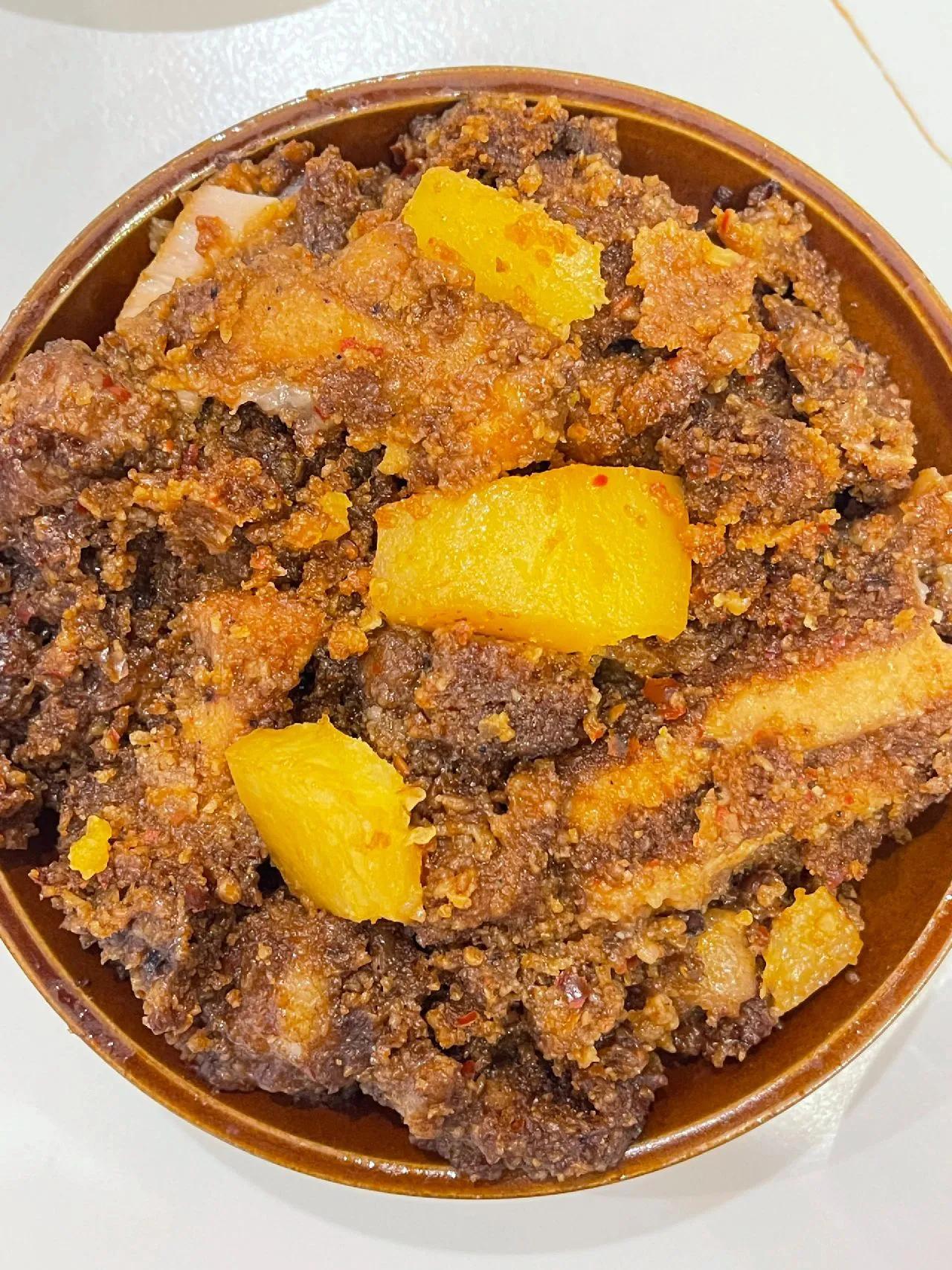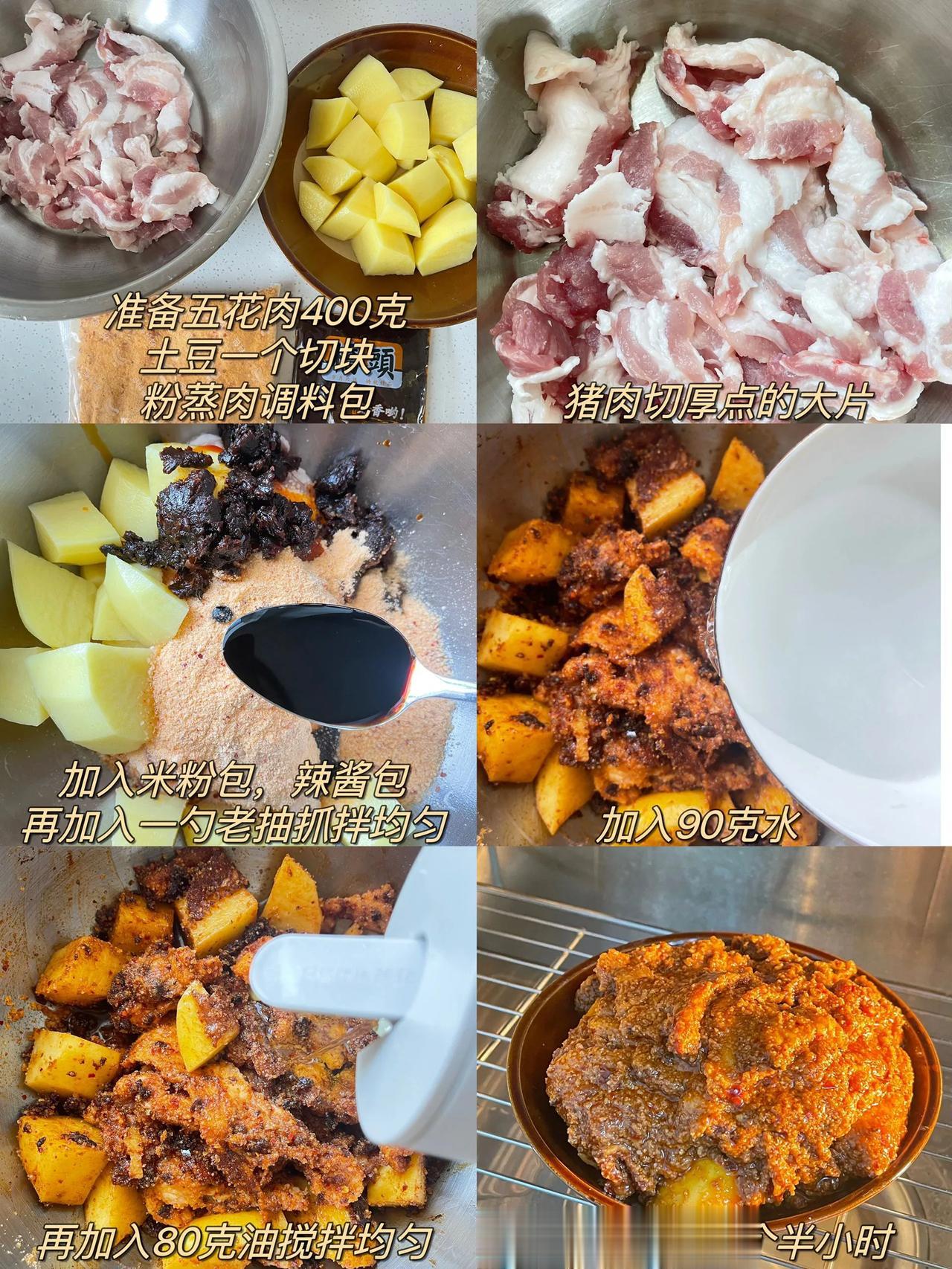 这玩意也太好吃了! 大口吃肉太香了吧!麻辣鲜香!肉质软烂。米粉把肥肉的油都吸进去了,吃起来油香油香的!一点也不腻! 做法: 1、猪肉切厚点的大片,放入土豆块,加入粉蒸肉调料包,再加入一勺老抽抓拌均匀; 2、加入90克水,再加入80克油搅拌均匀,码好上锅蒸一个半小时。