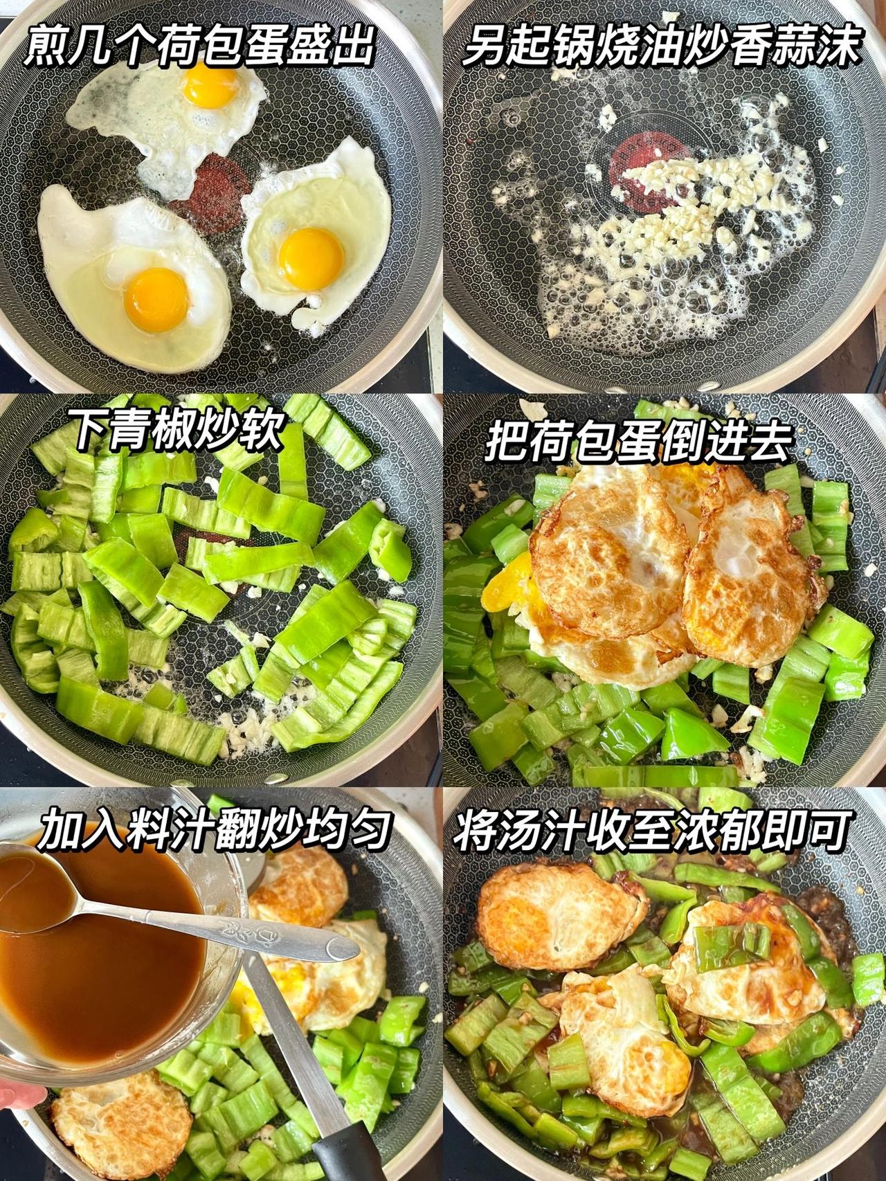 青椒荷包蛋会爆汁哦~简单易学的下饭菜 如果你下班回家又饿又懒得做饭,那这道菜绝对是你的一个好选择,因为它又简单又美味,如此快速就能吃上的美味谁能不冲呢~ 食材准备:青椒 鸡蛋 料汁:2勺生抽、1勺醋、1勺蚝油、半勺白糖、1勺鸡精、1勺淀粉、半碗水 做法:1、青椒洗净切小段,蒜切沫 2、起锅煎几个荷包蛋盛出备用,另起锅炒香蒜沫,加入青椒炒软,加入荷包蛋,倒入料汁,将汤汁收至浓郁即可出锅啦