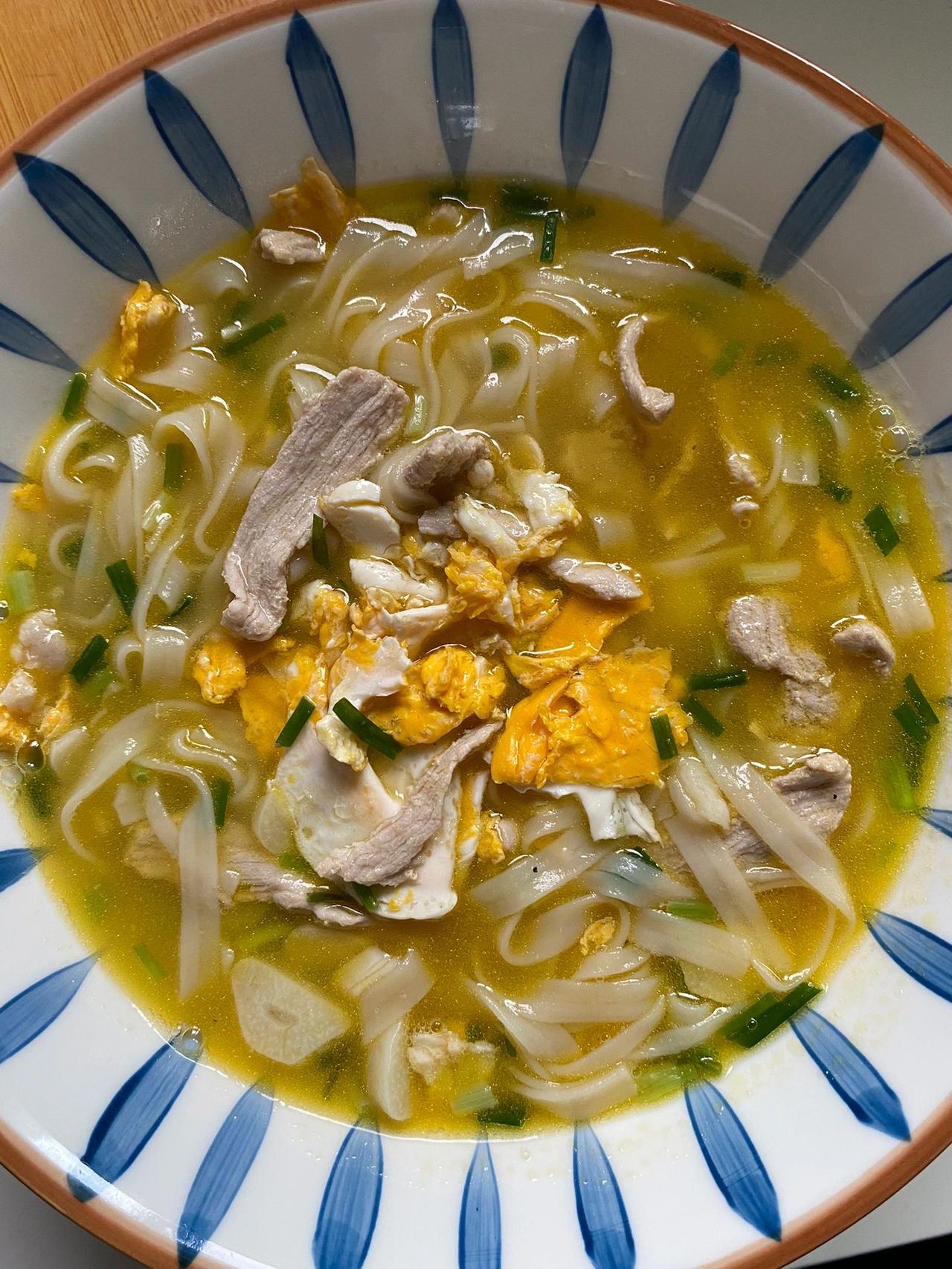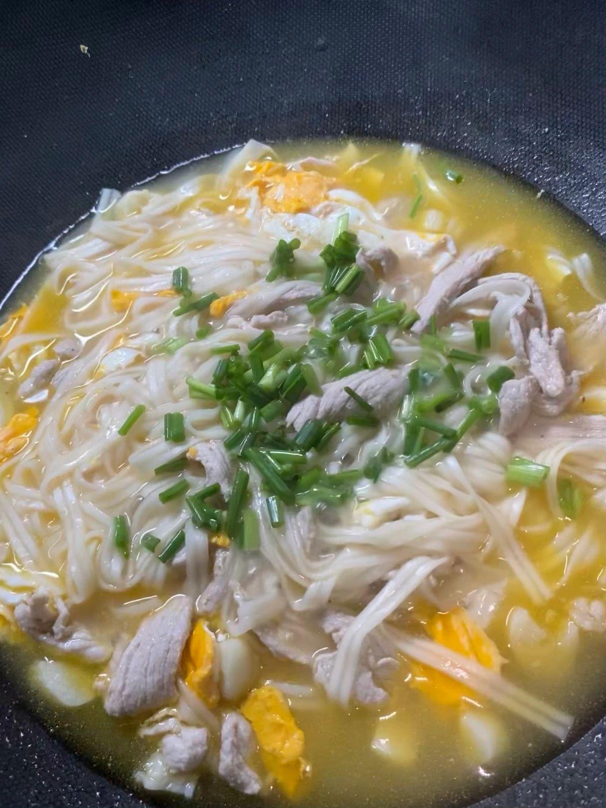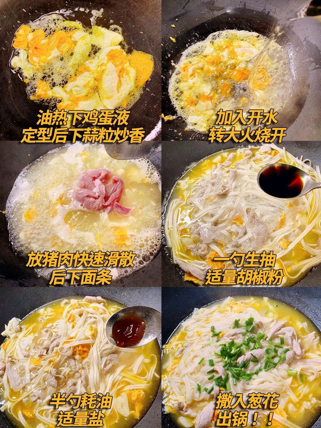 宅家整了一碗鸡蛋汆肉面,直接连汤都炫光! 最近总下雨不想出门,宅家里就爱做这碗鸡蛋汆肉面,连续吃了好几天了,每次连汤都炫光! 食材简单,肉也不用腌不用焯水什么的,没有很多调料,做出来味道鲜美,奶白色的汤看着就很有食欲啊,简单几步就搞定,本懒人好爱,还点什么外卖!下班后或者周末宅家来一碗能吃爽! 食材:鸡蛋、梅花肉、面条、大蒜、小葱 步骤:1、锅中放油,油热放1个鸡蛋,半成型时炒散,然后放蒜粒炒香。 2、闻到香味后加烧开的沸水转大火,汤沸腾就可以倒入切好的梅花肉(梅花肉肉质细嫩更好吃,尽量切小点)。 3、肉变色以后放面条,加1勺生抽+半勺蚝油+胡椒粉+盐,喜欢吃辣可以加小米椒,最后撒上葱花出锅!