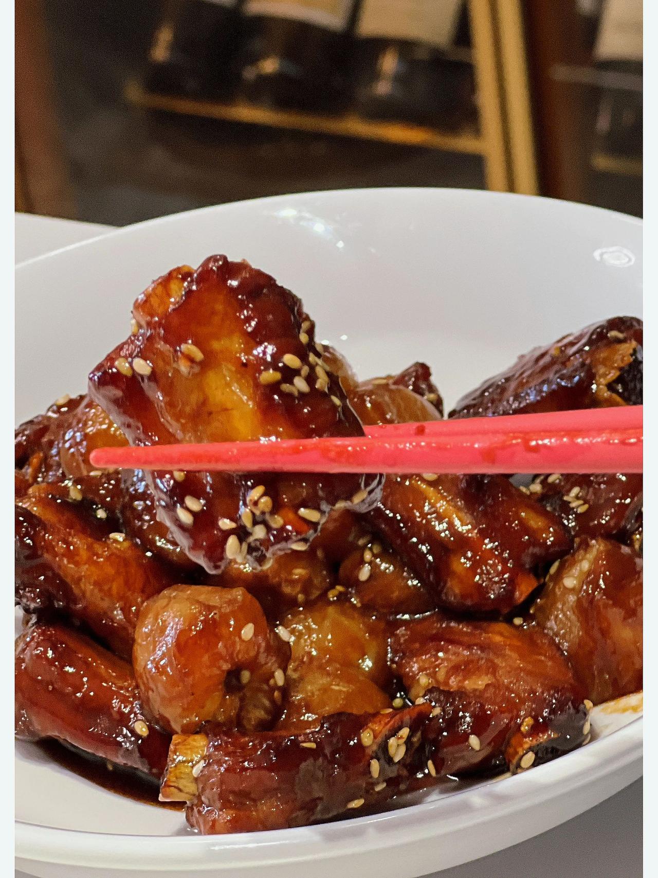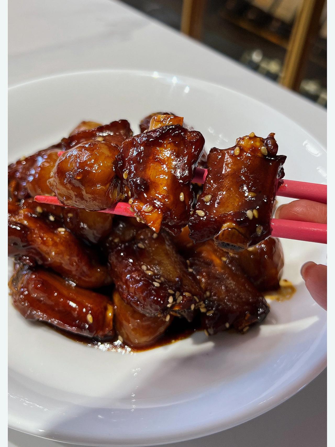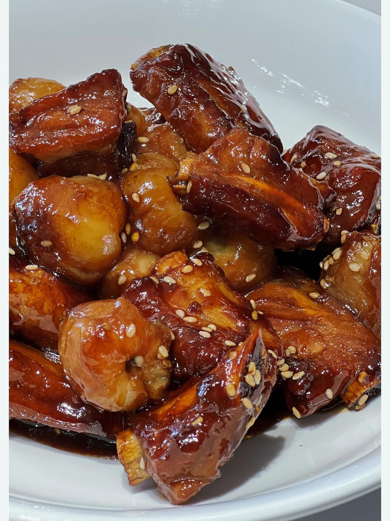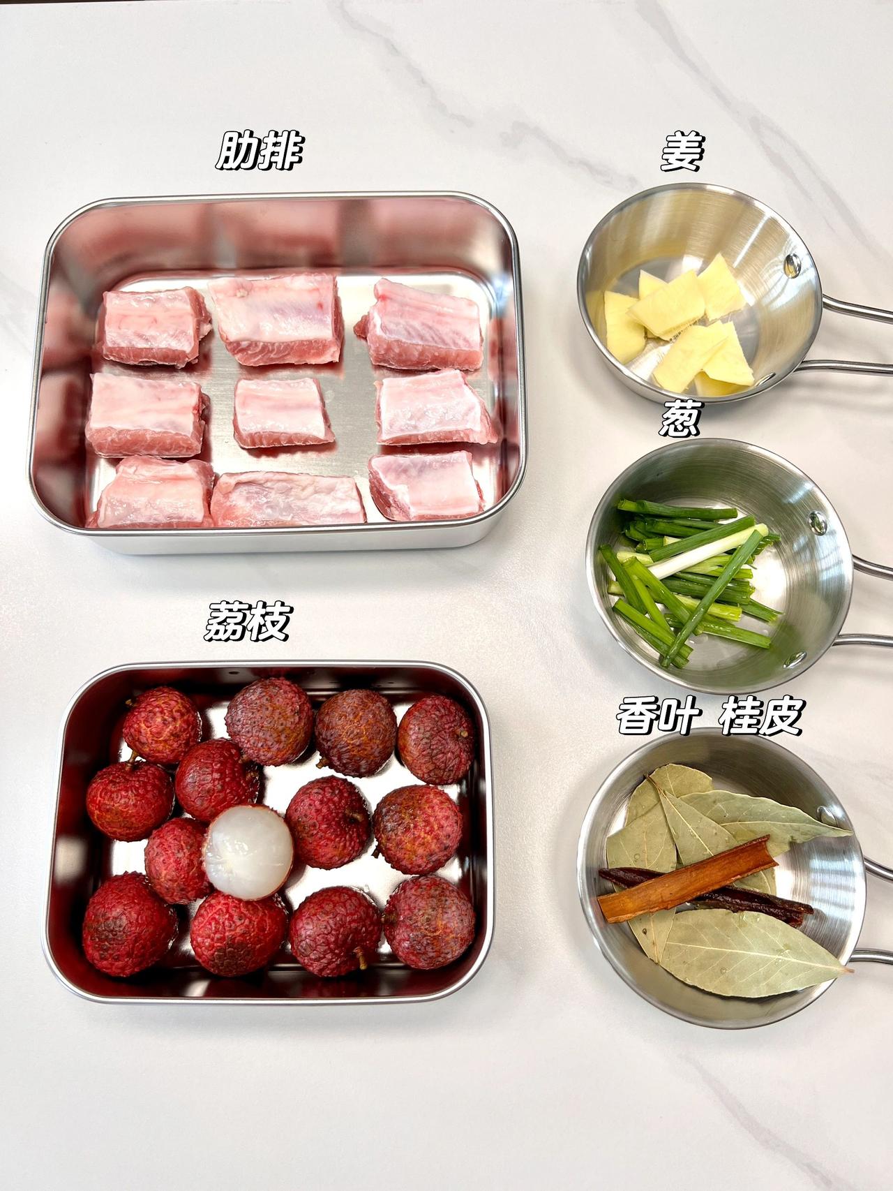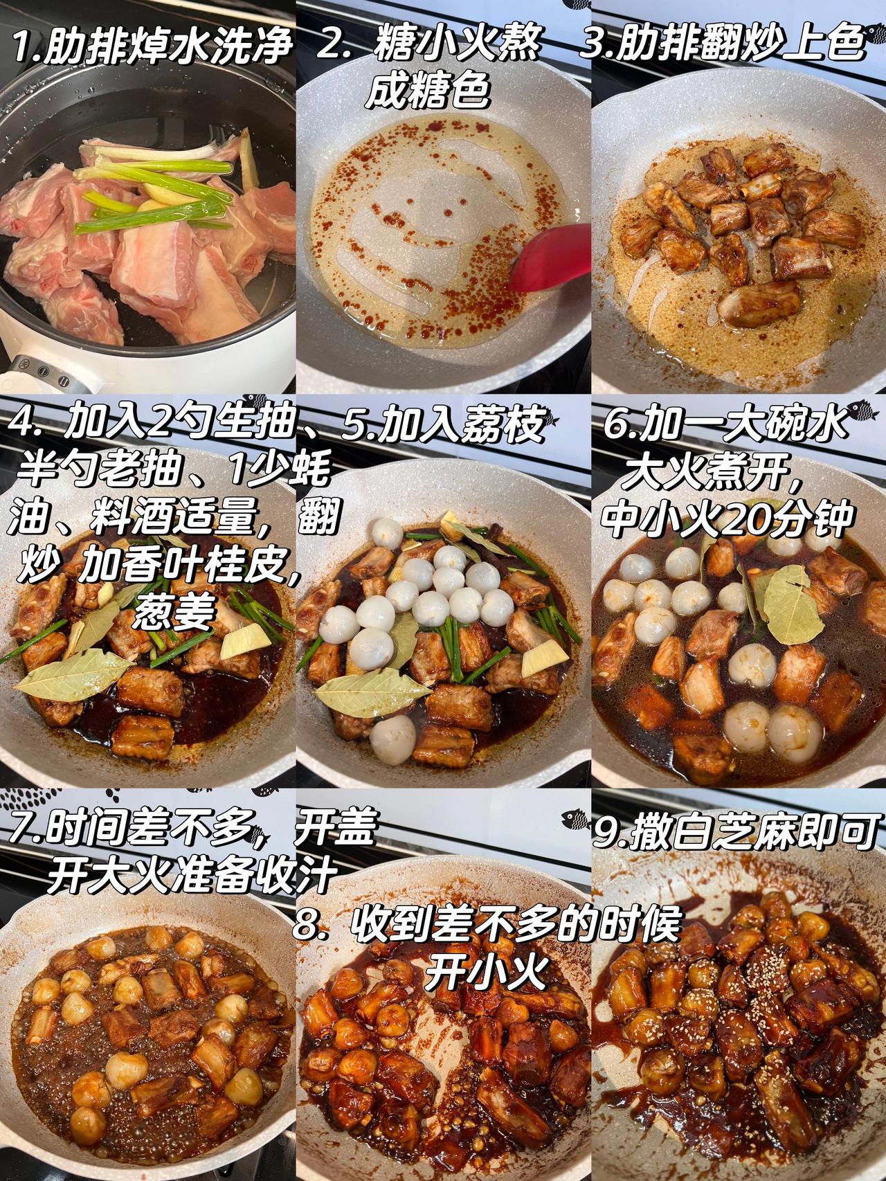 荔枝和排骨居然能组合到一起,太惊讶了!甜甜的排骨夹杂着荔枝的淡淡香味,吃起来一点也不腻! 【荔枝排骨】 食材:排骨400g、荔枝12个、香叶桂皮、葱姜 做法: 1、糖小火熬成糖色,下焯过水的排骨翻炒上色 2、加入2勺生抽、半勺老抽、1勺蚝油、料酒适量,翻炒 加香叶桂皮,葱姜 3、再加入你剥好的新鲜荔枝 4、加一大碗水,大火煮开,中小火20分钟 5、开大火准备收汁 6、收到差不多的时候,小火,撒白芝麻,即可